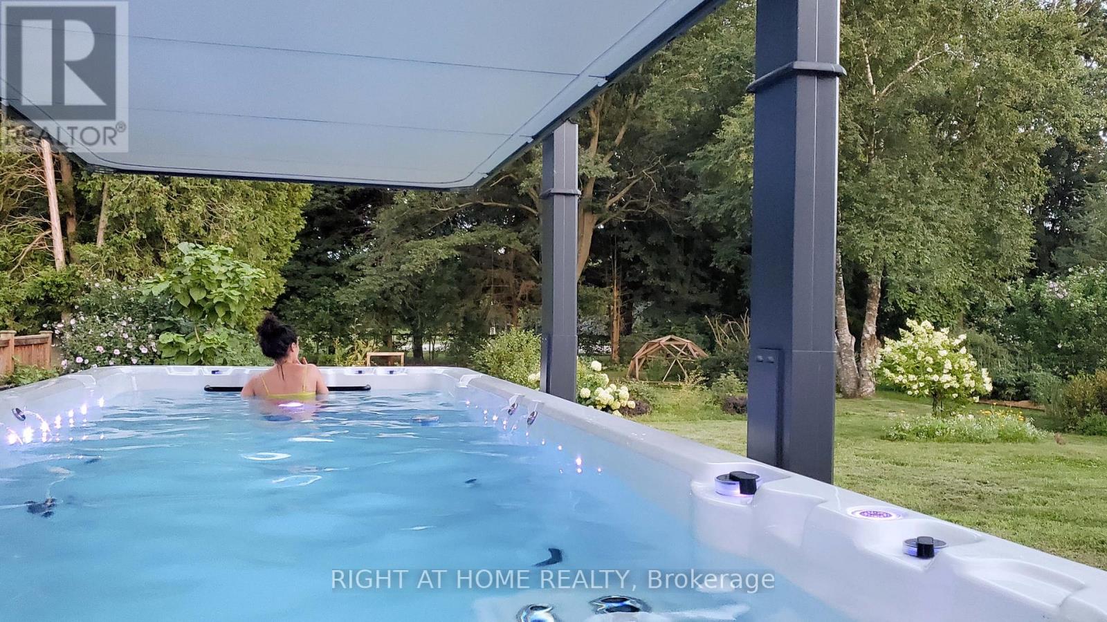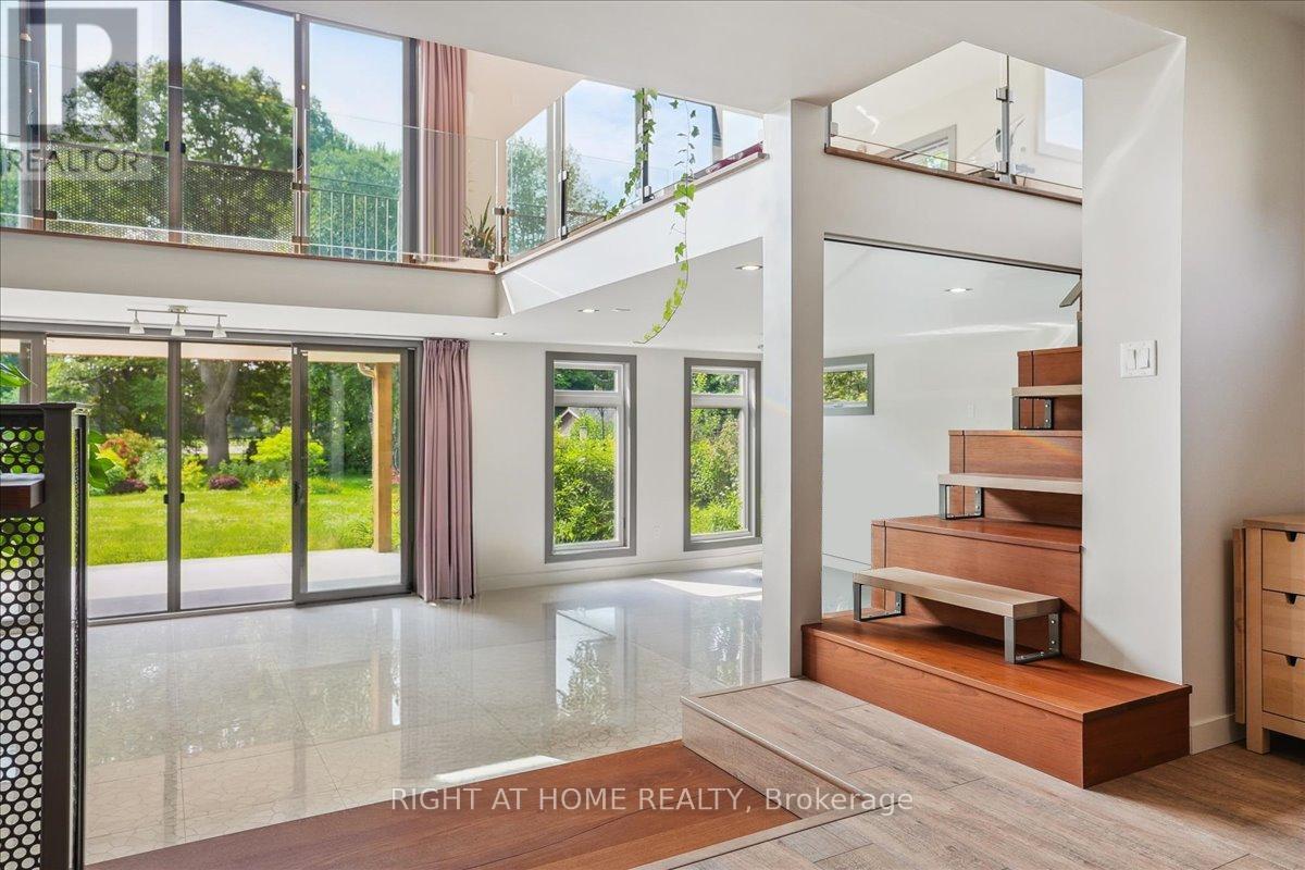 This remarkable residence, surrounded by nature on a rare 0.6-acre lot backing onto a park, offers a perfect blend of privacy and proximity to local amenities.Offering 4,650 sq ft of finished living space (3,500+ sq ft above ground), the home features a 2022 addition by Angelica Homes that is seamlessly integrated with the solid, fully upgraded,double-brick original house. The open-concept layout creates an inspiring atmosphere for living, working, relaxation, and social connection. Floor-to-ceiling, southeast-facing windows provide a picture-perfect 360 serene view and an abundance of natural light. Interior highlights include two Brazilian cherry/walnut staircases, custom glass and metal railings, granite countertops, designer paint, and award-winning Italian/Spanish porcelain tiles. The second level is finished with Mercier hardwood and features a dual wrap-around mezzanine with a balcony, ideal for a home office, studio, lounge, gym, and yoga space.The home also features a separate-entrance basement studio with a kitchenette, full bath, two closets, and laundry facilities. Exceptionally adjustable comfort is supported by a highly efficient modern mechanical system and includes four thermostats, heated floors throughout,with 17 independent zones, heat pumps, air conditioners, radiators, a tankless water heater, airtight spray-foam insulation, and a foam-insulated exterior with acrylic aggregate stucco that is extra durable, and crack-, fade-, and fire-resistant. The expansive lot features a circular driveway, parking for 10+ cars, gated parking for a boat/RV, two EV chargers, a 19-ft-long (5-ft-deep) year-round swim spa with an automated Covana cover, and a powered 384 sq ft studio/garden building for additional storage or hobby space. The property meets zoning requirements and is rough-in ready for an 860 sq ft. detached or attached Additional Residential Unit, offering flexible potential for generational orincome use. (id:64974)