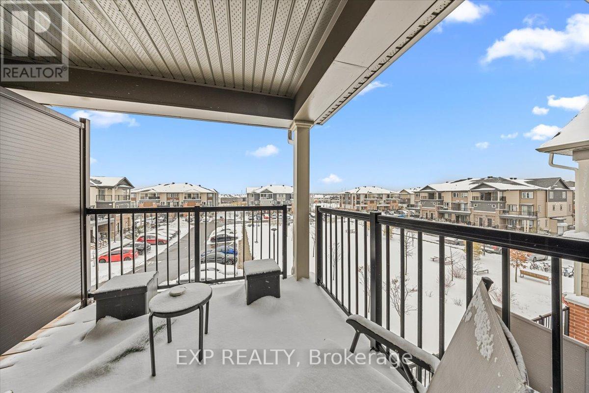 UPGRADED. TURNKEY. Stunning Blackstone townhouse w/quartz & granite countertops, custom remote zebra blinds, kitchen w/ waterline fridge, cyclone hood-fan for elevated living at an exceptional value. Welcome to this impeccably maintained upper-level stacked townhouse in the sought-after Trailwest / Emerald Meadows community, ideally located on the border of Kanata & Stittsville. The bright, open-concept main level is enhanced by engineered hardwood flooring & abundant natural light, creating a warm, refined atmosphere. The upgraded kitchen is both stylish & functional, featuring quartz countertops, stainless steel appliances, a pantry, extended cabinetry & a generous island-perfect for entertaining or everyday living. The living & dining areas flow seamlessly around a sleek electric fireplace & included 75" mounted TV, offering a space that feels both elevated & inviting. Step onto your private balcony-ideal for morning coffee or evening unwinding. A convenient powder room completes this level. Upstairs, a rare dual-ensuite layout provides exceptional flexibility & privacy. The primary suite features a walk-in closet & a beautifully upgraded ensuite w/ glass shower & granite countertops. The second bedroom includes its own covered balcony, ceiling fan, & private 4-piece ensuite-ideal for guests, family, or a stylish home office.1 parking space (#115). Located close to parks, schools, shopping, transit & everyday amenities in a thriving neighbourhood. Freshly painted, thoughtfully upgraded & completely turnkey-an incredible opportunity offering style, comfort & value. (id:64974)