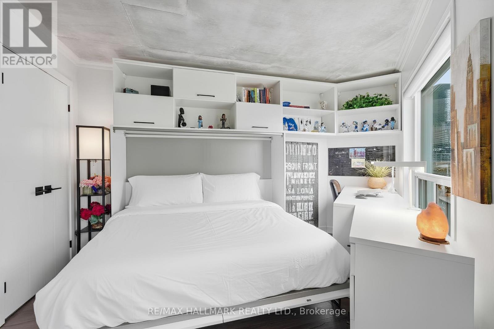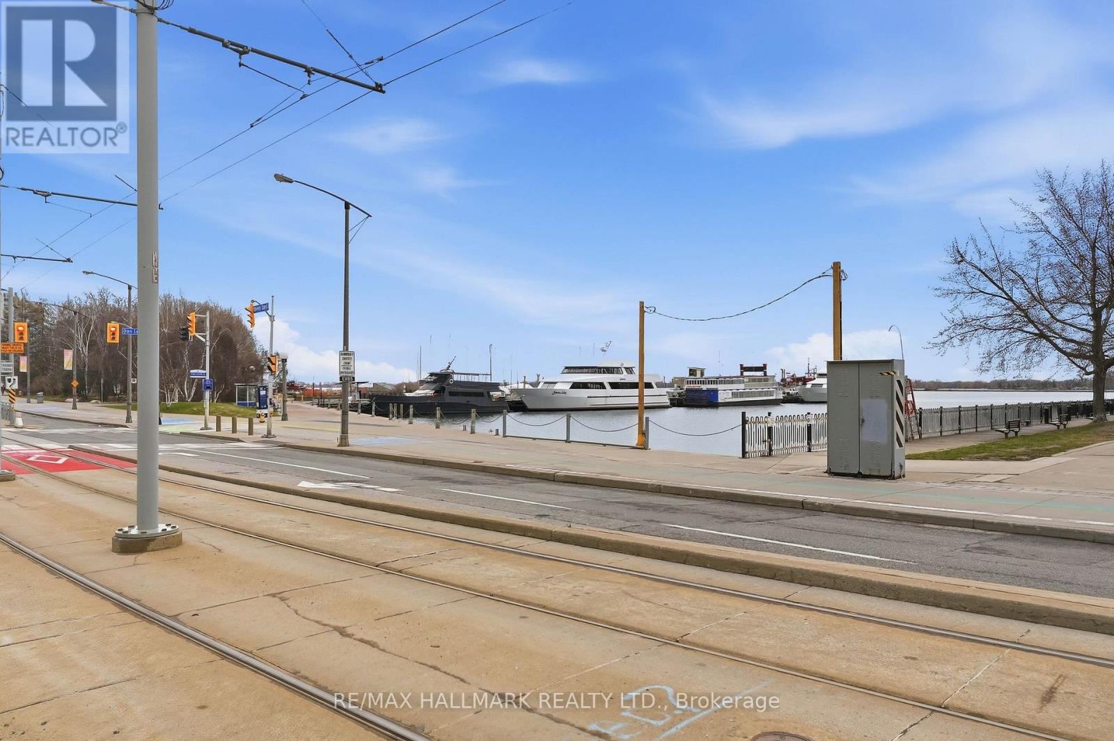 This Queens Harbour 2 bed suite, tucked along Toronto's downtown waterfront, blends nearly $95K in modern upgrades, custom finishings, and exposed concrete ceilings for a subtle loft-like feel. The layout is thoughtfully designed, with defined living spaces, separated bedrooms, a fully renovated shared 4pc bath, and two walk-outs to a southeast-facing balcony with lake and city views. The kitchen anchors the open concept living and dining space with a custom granite peninsula, breakfast bar, matching backsplash, and LG stainless steel appliances. The primary bedroom comfortably fits a king-size setup, features a custom walk-in closet, and a clean, modern 5pc ensuite. The second bedroom, enclosed with double doors, shifts easily between a dedicated bedroom, guest room, office, or an open extension of the living space depending on the day. Daily errands are simple, with Loblaws, Farm Boy, LCBO, Shoppers Drug Mart, and more just a short 4 minute walk away, while evenings and weekends can take you to Blue Jays or Maple Leafs games, headliner concerts, or vibrant King West restaurants all within 20 minutes on foot. TTC streetcar service runs right outside the building with a direct 15-20 minute connection to Union Station transit lines. Well-managed building with all utilities included in maintenance fees - water, heat, central A/C, hydro, common elements, building insurance, one parking space and a good-sized locker. (id:64974)