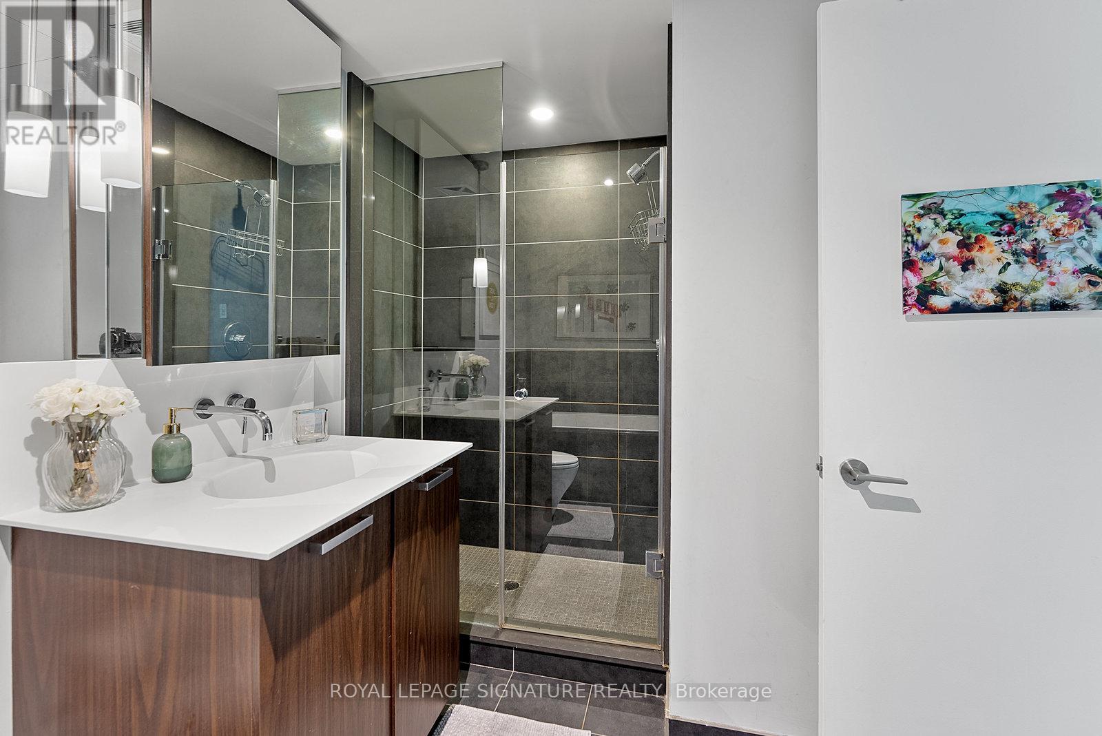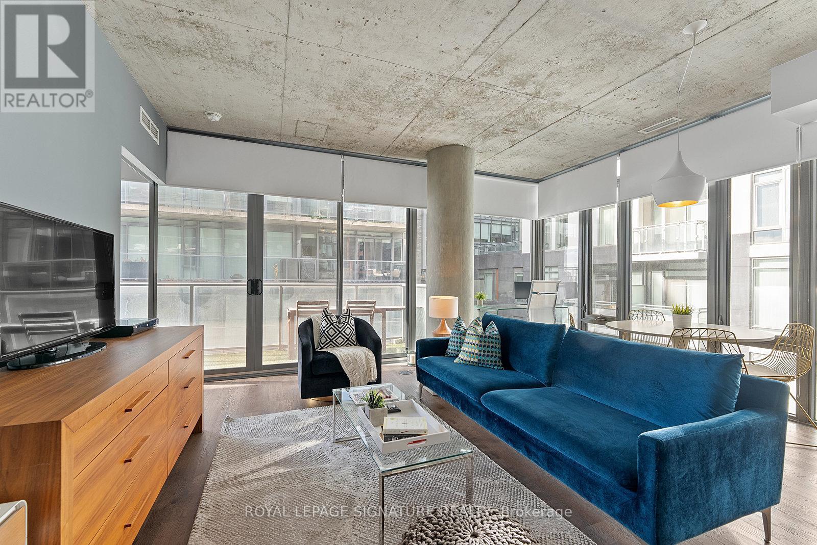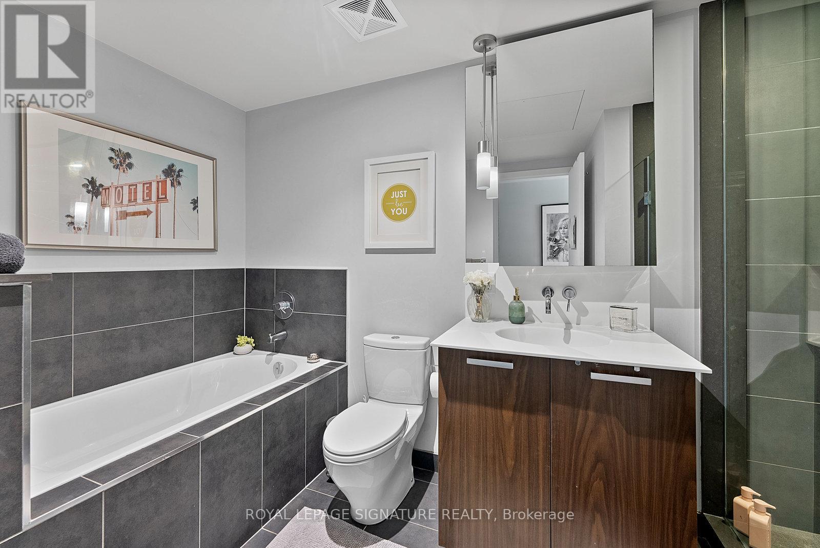 Executive fully furnished rental soft loft in the heart of King West. Just shy of 700 sq.ft.this 1 bedroom corner unit has a large open concept living/dining/kitchen area with plenty of room to include a home office. Well appointed with just about everything you could need including a truly fully equipped kitchen, art, accessories, linens, bedding, household appliances, etc. Includes utilities and reliable Beanfield 1 Gbps internet. Engineered woodflooring throughout. The bathroom has a separate soaker tub and shower, making it great for couples. Balcony lined with high grade artificial grass for comfort. BBQs permitted. This is not an average furnished rental. See it in person to truly appreciate it! Ideal location near the restaurants, cafes and nightlife of King West and a short walk to Queen West's shopping district. Easy T.T.C. access with 2 transit lines. Walking distance to the Financial District, sporting venues, Lake Ontario, parks, library, grocery stores and much more. (id:64974)
