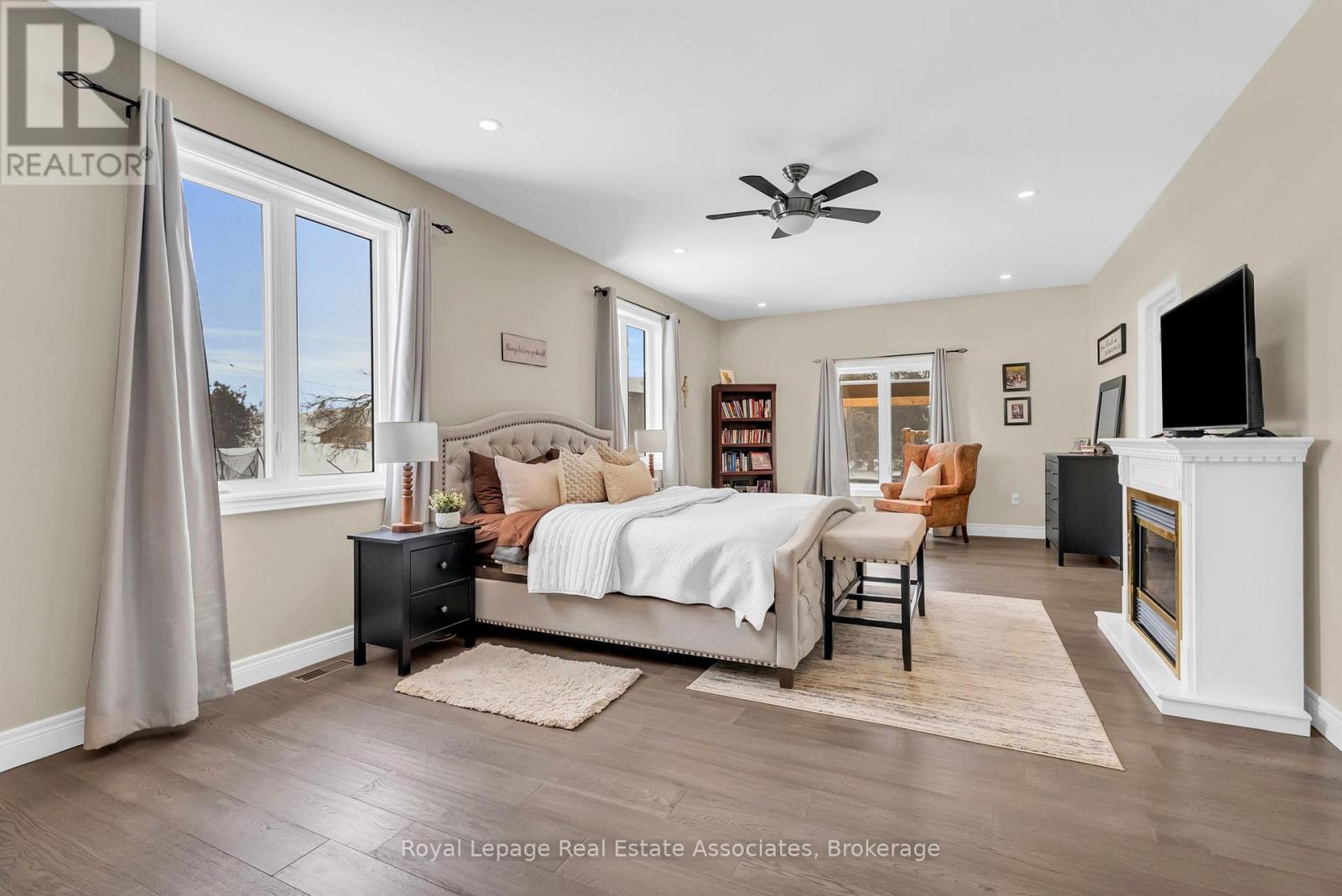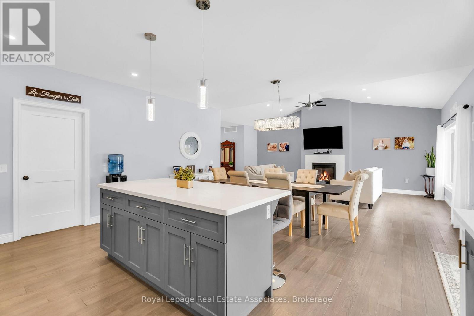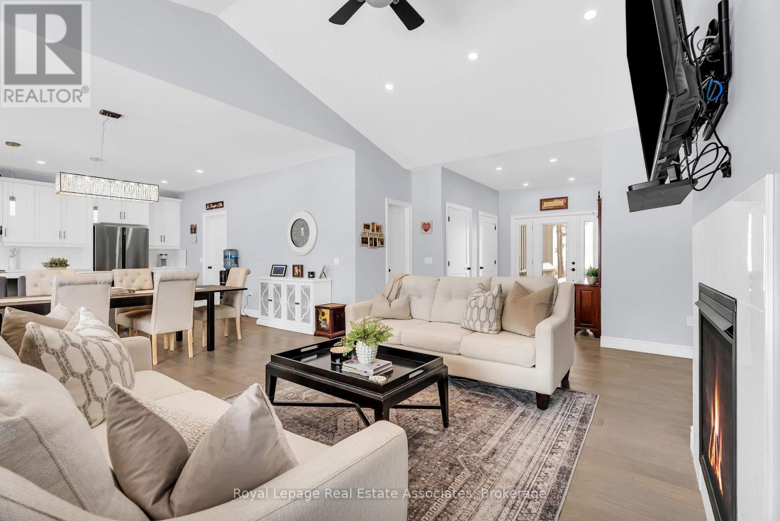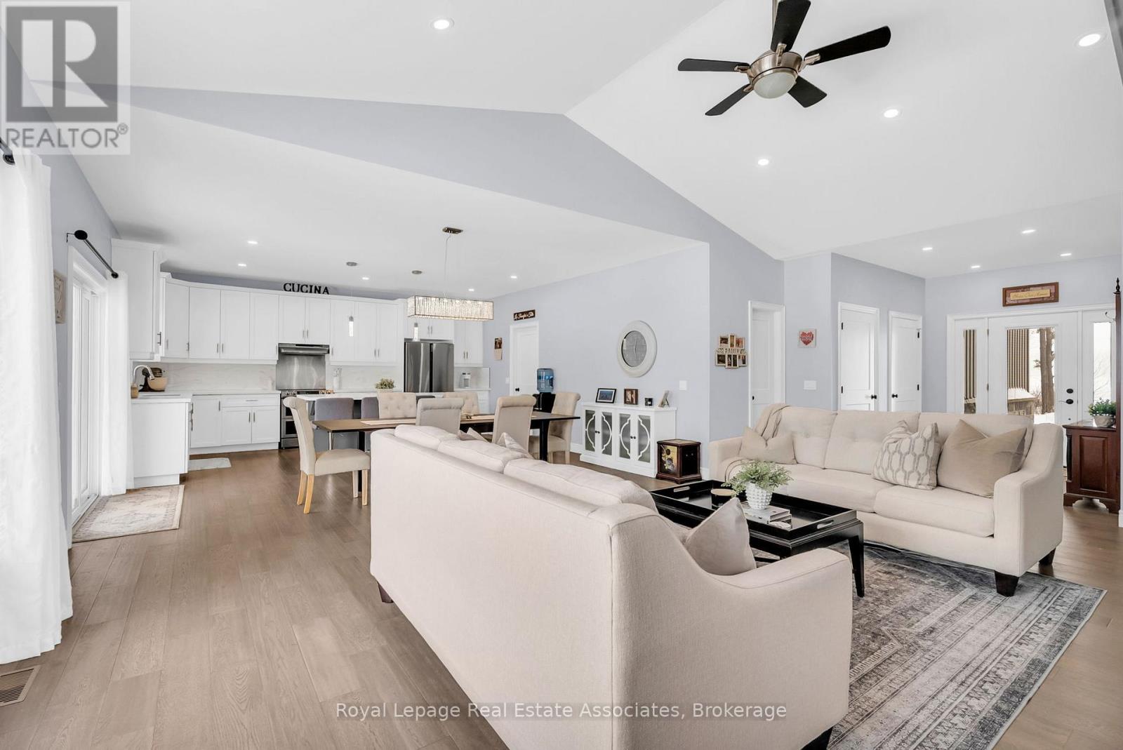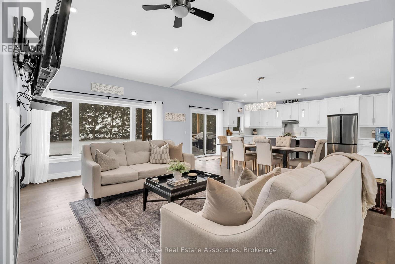 This stunning custom-built bungalow showcases exceptional craftsmanship, timeless style, and thoughtful design throughout. Built six years ago, the home offers elegant bungalow living with a bright, open-concept layout that is both impressive and highly functional. The home is completely carpet-free, featuring engineered hardwood flooring throughout.At the heart of the home is the beautifully designed kitchen, complete with quartz countertops, stainless steel appliances, pot lights, and a large centre island ideal for gathering and entertaining. The open-concept dining area flows seamlessly from the kitchen and offers a walk-out to the covered deck, extending the living space outdoors. The open-concept living room features cathedral ceilings, a cozy fireplace, and pot lights, creating a warm and inviting atmosphere.The spacious primary suite is a true retreat, featuring pot lights, a walk-in closet with custom built-ins, and a luxurious 5-piece ensuite designed for comfort and relaxation. Two additional bedrooms on the main floor are generously sized and include double-door closets. Main floor laundry adds everyday convenience, features a walk-in pantry, and offers direct access to the 3-car garage.The basement provides approximately 2,000 sq. ft. of additional living space, including a bedroom, a rough-in bathroom, and an abundance of storage.All you need is flooring to complete the basement. Outside, enjoy a serene backyard oasis set on a picturesque 1.01-acre lot. Relax under the large covered deck, unwind in the hot tub, or spend summer days by the above-ground pool, all while taking in the peace and privacy of country living.Located just 15 minutes from Shelburne for everyday amenities, this exceptional property offers the perfect blend of rural tranquility and modern convenience. Fibre optic cable and internet available. (id:64974)