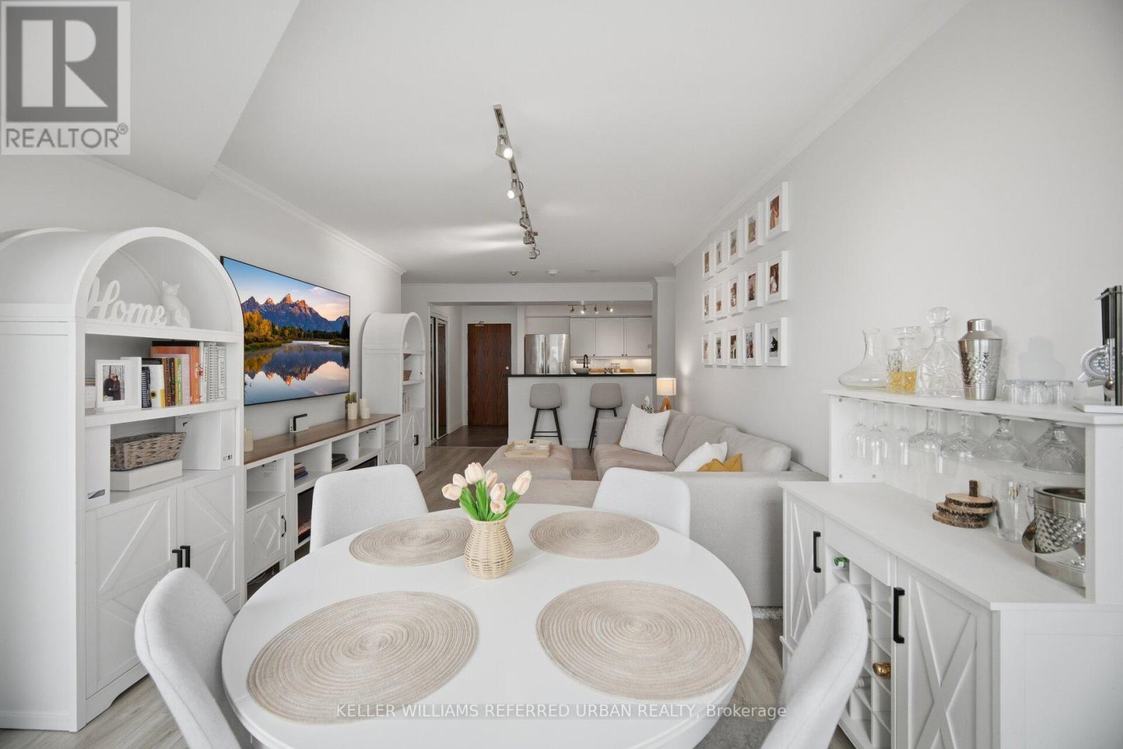 This bright and spacious split two-bedroom, two-bathroom suite offers a thoughtfully designed floor plan in a boutique-style building. Recently updated, the unit showcases quality finishes including luxury vinyl plank flooring, ceramic tile, and a fresh, modern palette. The contemporary kitchen is both stylish and functional, featuring stone counters, a classic subway tile backsplash, two-tone cabinetry, full-size quality appliances, and an extended breakfast bar that seamlessly connects to the open-concept living and dining area. The generous primary bedroom serves as a private retreat, complete with a beautifully updated ensuite featuring a soaker tub, glass-enclosed tiled shower, modern vanity, and updated flooring, along with an expansive custom walk-in closet. Enjoy your morning coffee or unwind at the end of the day on the private balcony, with tranquil views of the sunrise over the lake. Ideally located just steps to the waterfront, Humber Bay, scenic walking and cycling trails, and Grand Avenue Park. Commuting is effortless with nearby transit options, including Mimico GO Station and Royal York Station, plus quick access to the Gardiner Expressway and Highway 427, connecting you easily to downtown Toronto and the airport. A fantastic opportunity to own a turnkey suite in one of Mimico's most desirable pockets. (id:64974)