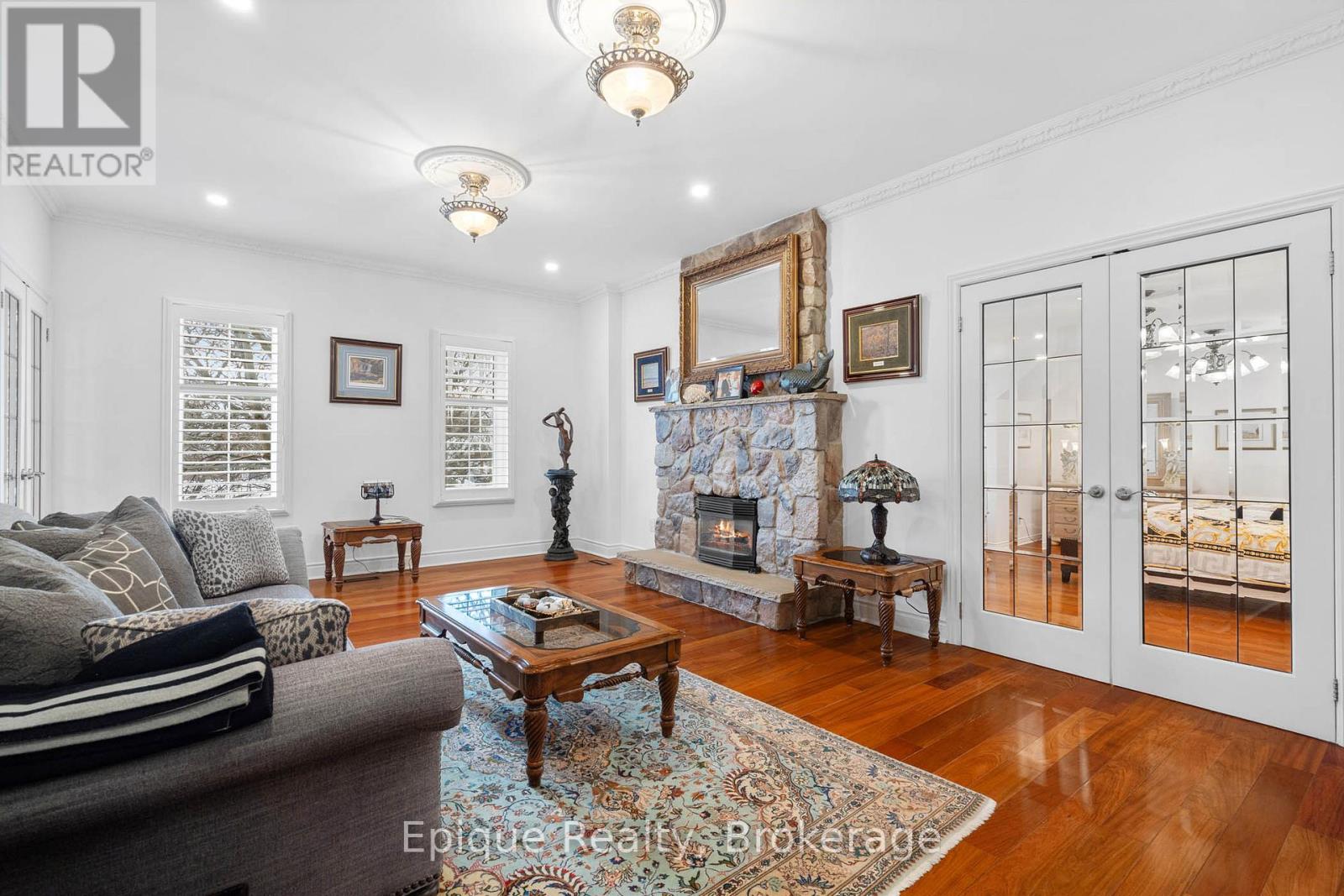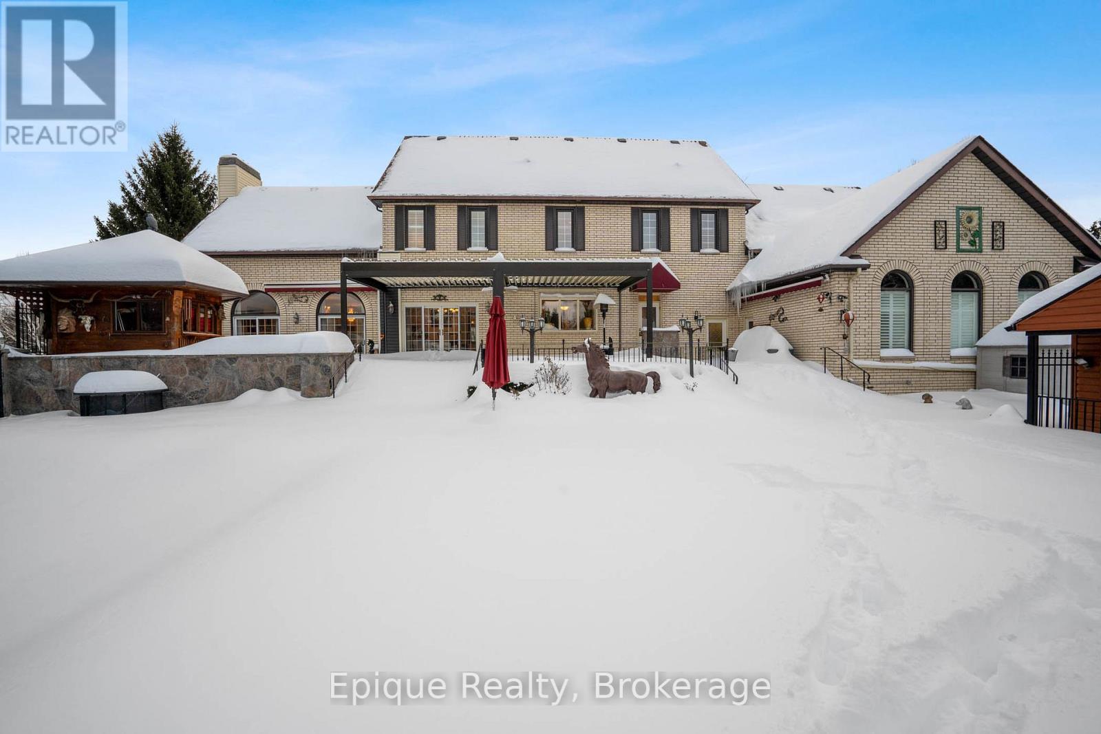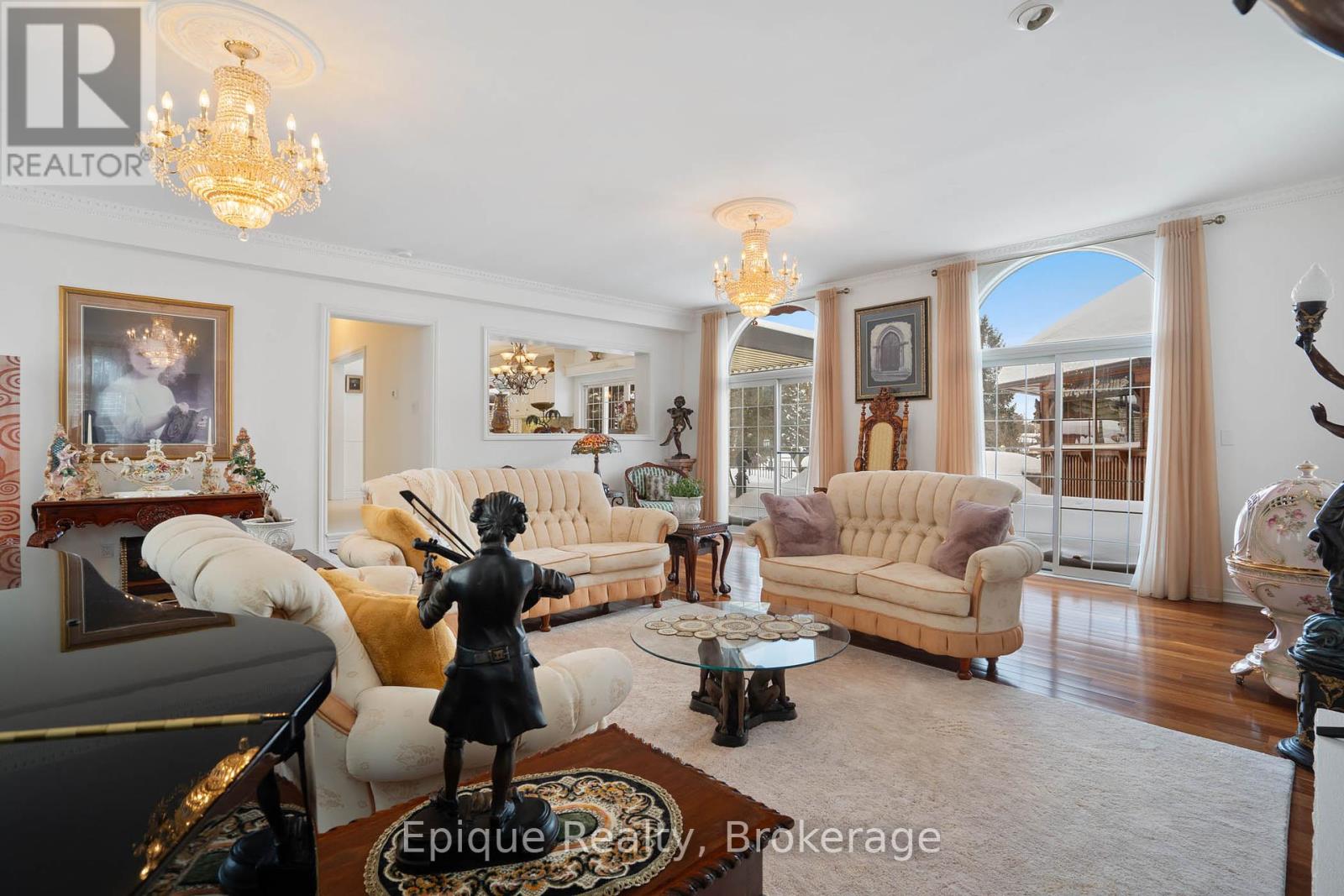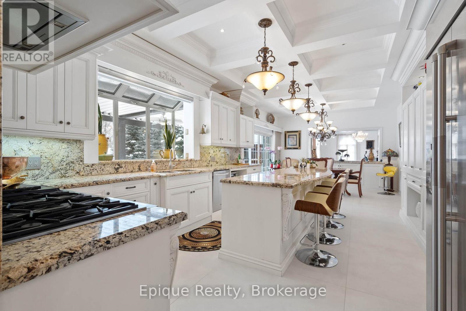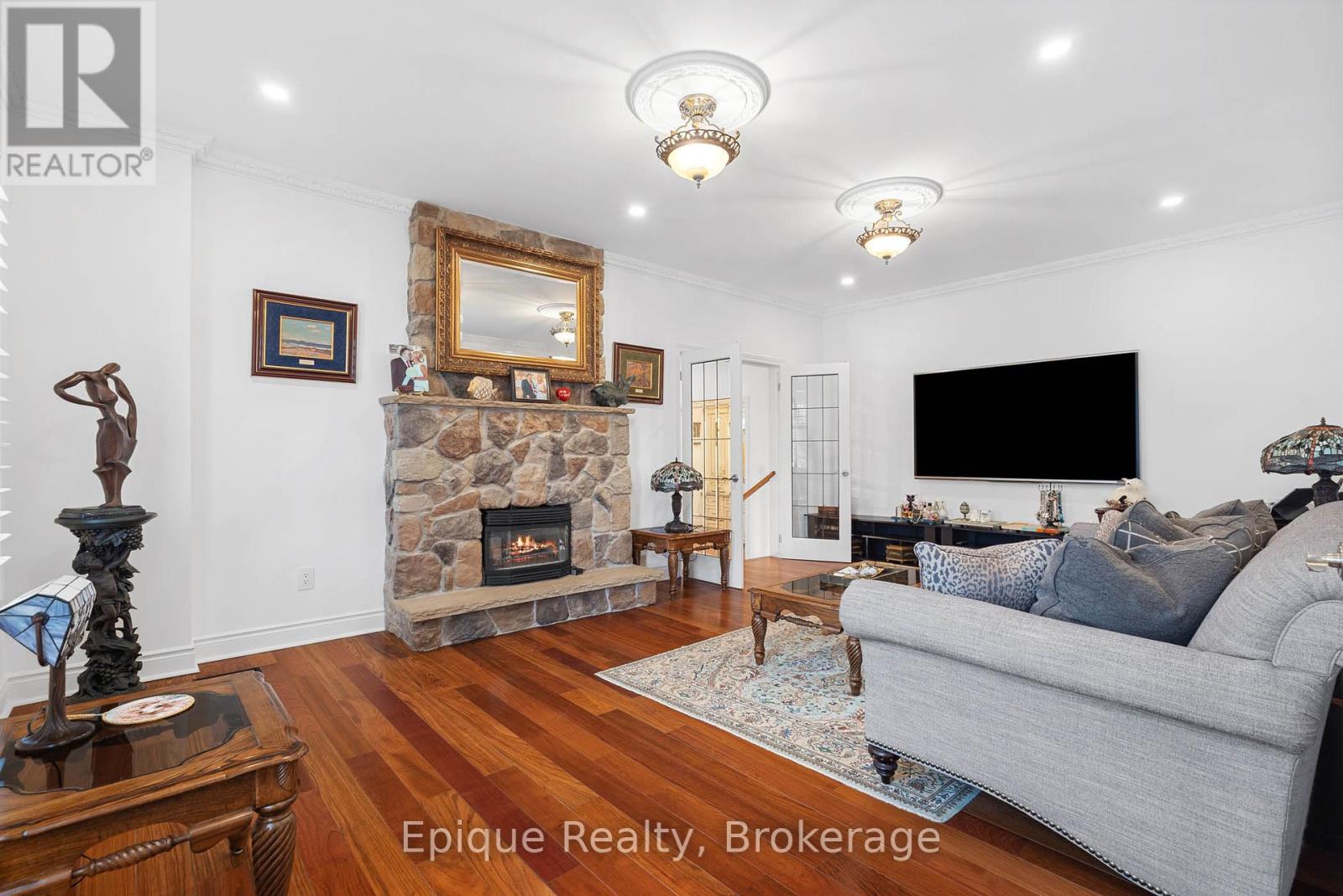 EXPERIENCE UNMATCHED LUXURY IN CAMPBELLVILLE. Nestled on a lush and private 1.13 acres, this imposing 7,200 sq. ft. estate is a masterpiece of design and craftsmanship. Exotic Brazilian cherry floors, Swarovski crystal chandeliers, and five fireplaces create an ambiance of timeless elegance.The formal dining room stuns with a majestic fireplace and chandelier, while the main-floor office connects seamlessly to the conservatory, perfect for entertaining with a baby grand piano. The gourmet kitchen boasts Jenn-Air & Bosch appliances, custom cabinetry, and quad French doors leading to an expansive deck and remote-controlled screened sunroom.The primary suite wing is a private retreat with a sitting area, gas fireplace, spa-inspired ensuite with double vanities, an oversized glass shower, a deep soaker tub, and extensive closet space. Three additional bedrooms share an opulent oversized bath, ensuring comfort and elegance.The professionally finished lower level includes a spa-inspired 3-piece bath with a steam shower. Outdoors, enjoy a 20 x 40 heated saltwater pool, pool house changeroom, and a cedar cabana bar with power and water.For the automobile enthusiast, the 4-car garage and parking for 20+ vehicles provide ample space. Just minutes from the 401, this estate offers unparalleled luxury, privacy, and accessibility.A rare opportunity to own a true luxury retreat. Schedule your private showing today. (id:64974)