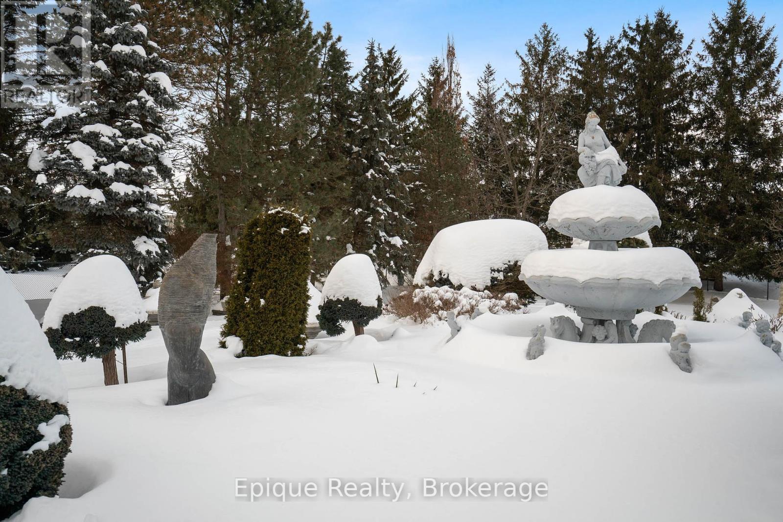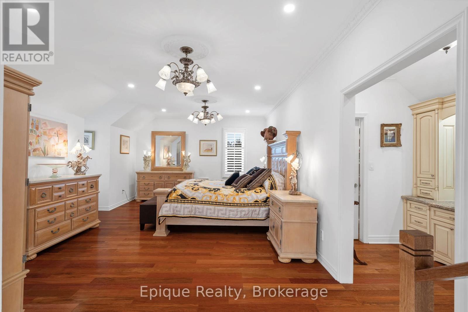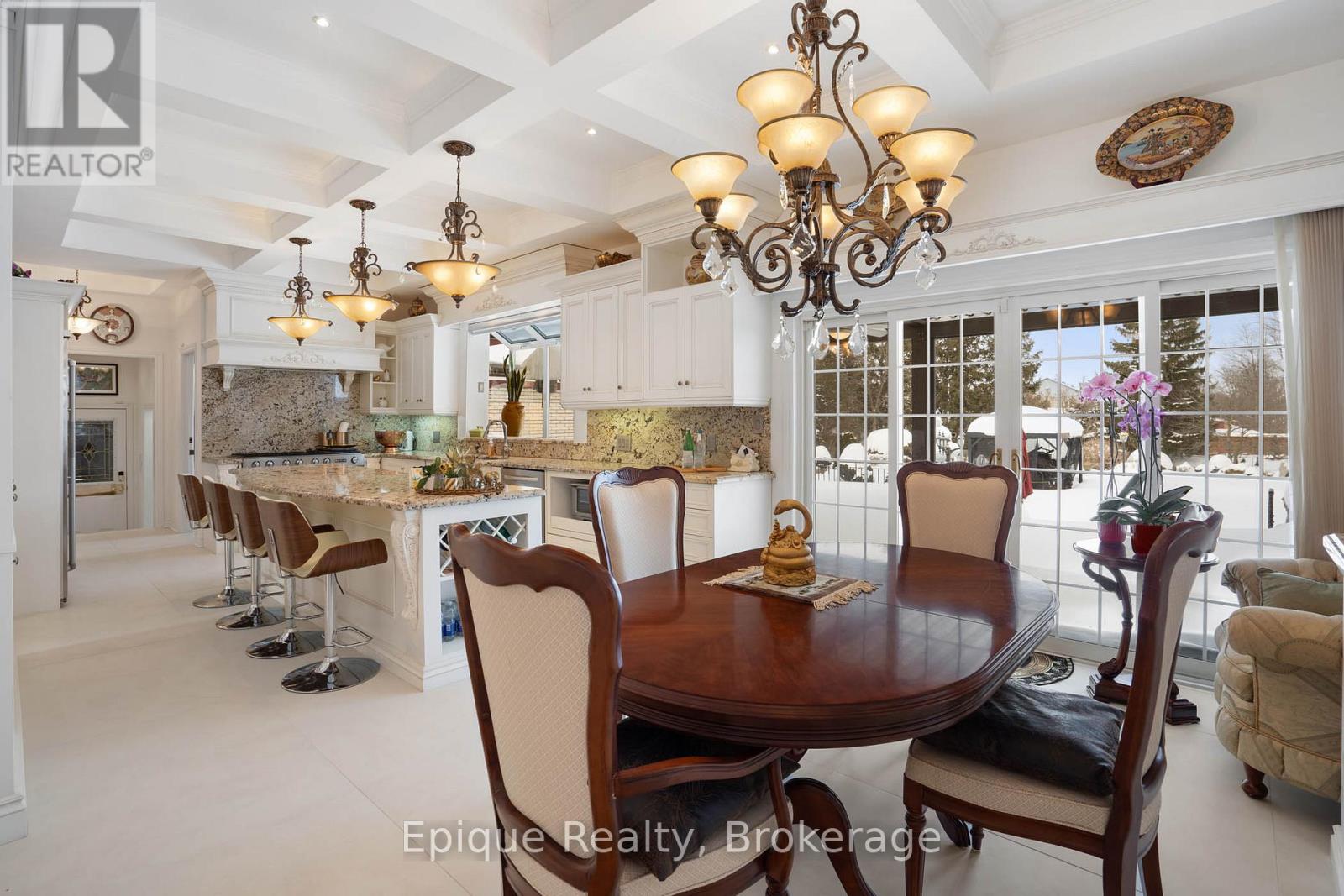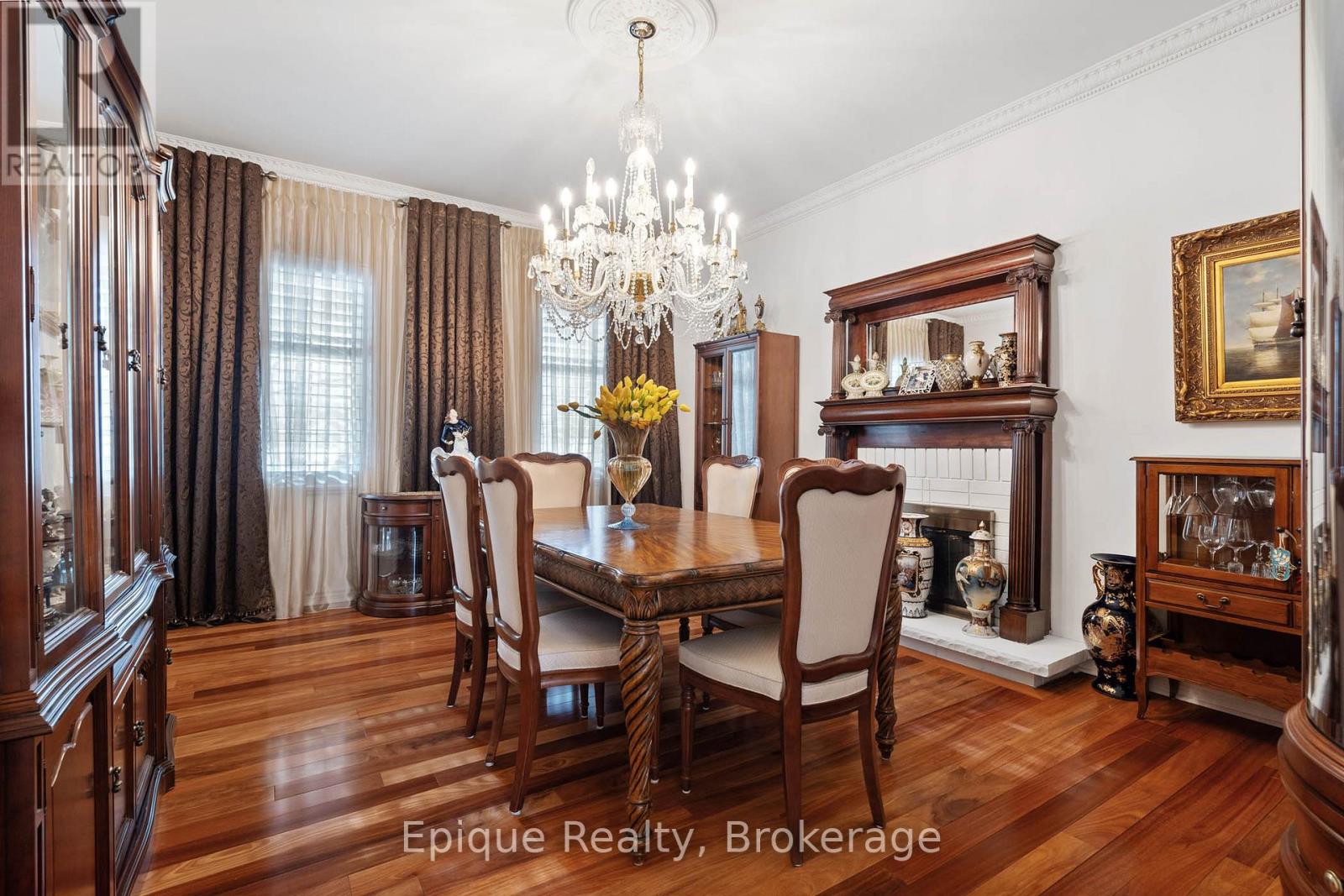 EXPERIENCE UNMATCHED LUXURY IN CAMPBELLVILLE. Nestled on a lush and private 1.13 acres, this imposing 7,200 sq. ft. estate is a masterpiece of design and craftsmanship. Exotic Brazilian cherry floors, Swarovski crystal chandeliers, and five fireplaces create an ambiance of timeless elegance.The formal dining room stuns with a majestic fireplace and chandelier, while the main-floor office connects seamlessly to the conservatory, perfect for entertaining with a baby grand piano. The gourmet kitchen boasts Jenn-Air & Bosch appliances, custom cabinetry, and quad French doors leading to an expansive deck and remote-controlled screened sunroom.The primary suite wing is a private retreat with a sitting area, gas fireplace, spa-inspired ensuite with double vanities, an oversized glass shower, a deep soaker tub, and extensive closet space. Three additional bedrooms share an opulent oversized bath, ensuring comfort and elegance.The professionally finished lower level includes a spa-inspired 3-piece bath with a steam shower. Outdoors, enjoy a 20 x 40 heated saltwater pool, pool house changeroom, and a cedar cabana bar with power and water.For the automobile enthusiast, the 4-car garage and parking for 20+ vehicles provide ample space. Just minutes from the 401, this estate offers unparalleled luxury, privacy, and accessibility.A rare opportunity to own a true luxury retreat. Schedule your private showing today. (id:64974)