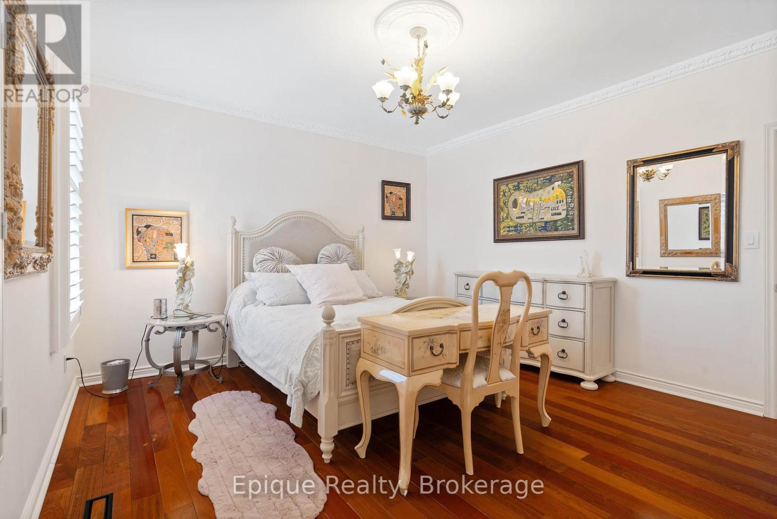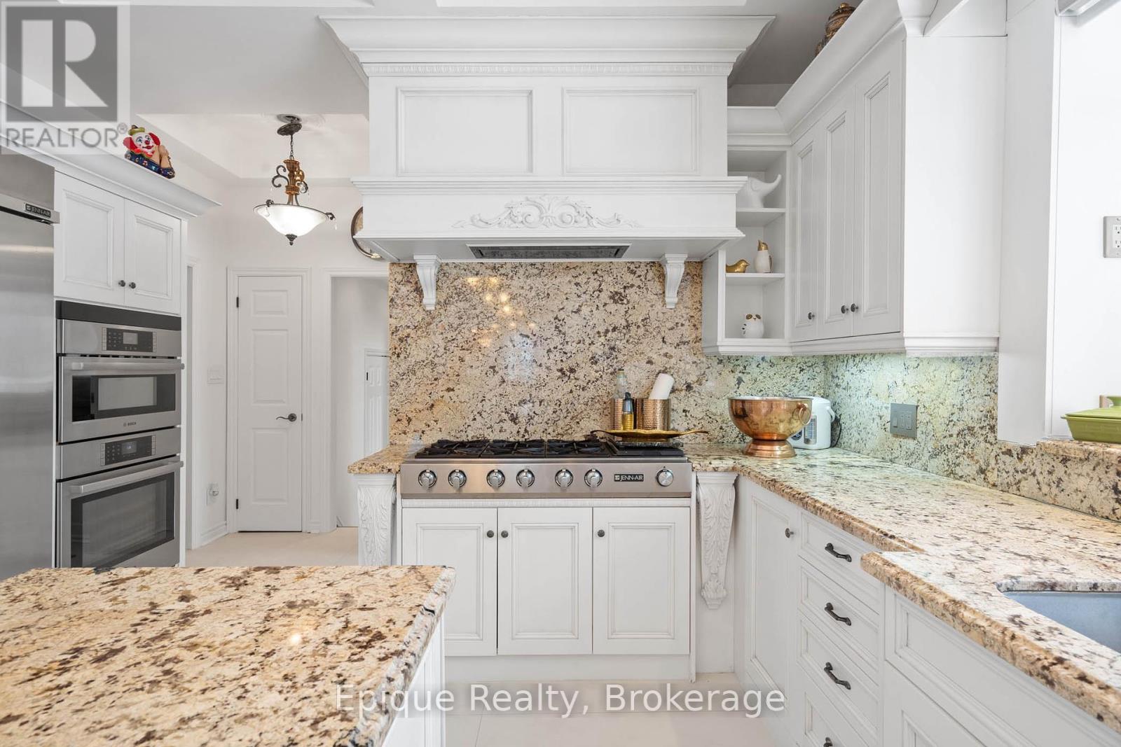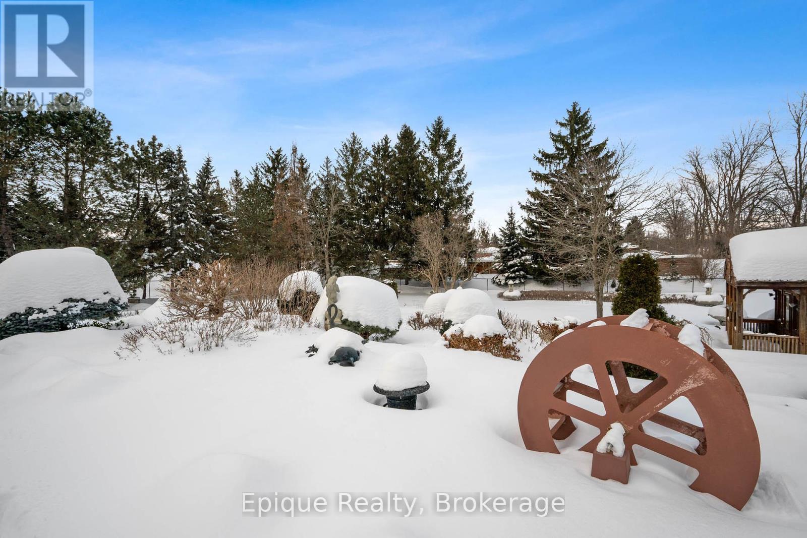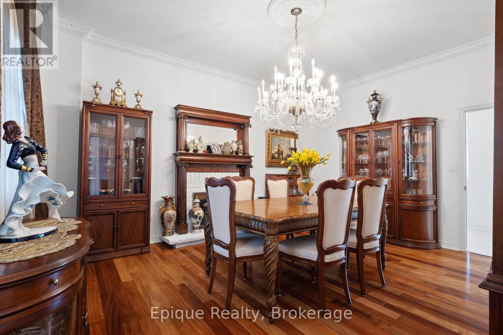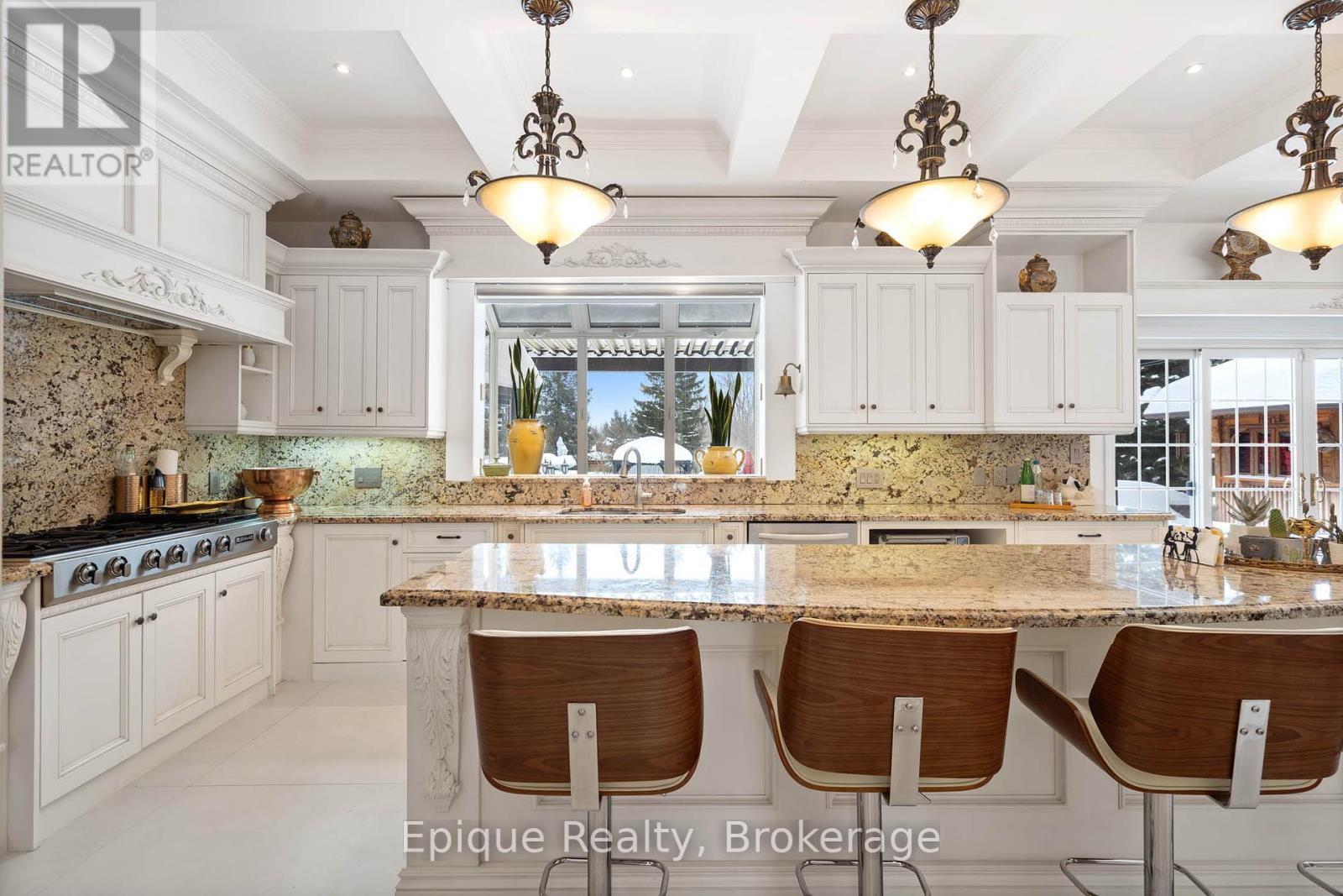 EXPERIENCE UNMATCHED LUXURY IN CAMPBELLVILLE. Nestled on a lush and private 1.13 acres, this imposing 7,200 sq. ft. estate is a masterpiece of design and craftsmanship. Exotic Brazilian cherry floors, Swarovski crystal chandeliers, and five fireplaces create an ambiance of timeless elegance.The formal dining room stuns with a majestic fireplace and chandelier, while the main-floor office connects seamlessly to the conservatory, perfect for entertaining with a baby grand piano. The gourmet kitchen boasts Jenn-Air & Bosch appliances, custom cabinetry, and quad French doors leading to an expansive deck and remote-controlled screened sunroom.The primary suite wing is a private retreat with a sitting area, gas fireplace, spa-inspired ensuite with double vanities, an oversized glass shower, a deep soaker tub, and extensive closet space. Three additional bedrooms share an opulent oversized bath, ensuring comfort and elegance.The professionally finished lower level includes a spa-inspired 3-piece bath with a steam shower. Outdoors, enjoy a 20 x 40 heated saltwater pool, pool house changeroom, and a cedar cabana bar with power and water.For the automobile enthusiast, the 4-car garage and parking for 20+ vehicles provide ample space. Just minutes from the 401, this estate offers unparalleled luxury, privacy, and accessibility.A rare opportunity to own a true luxury retreat. Schedule your private showing today. (id:64974)