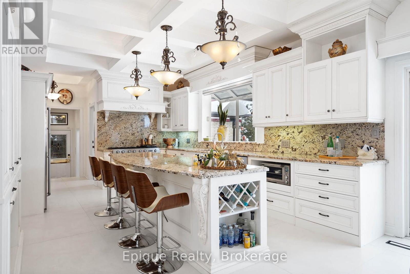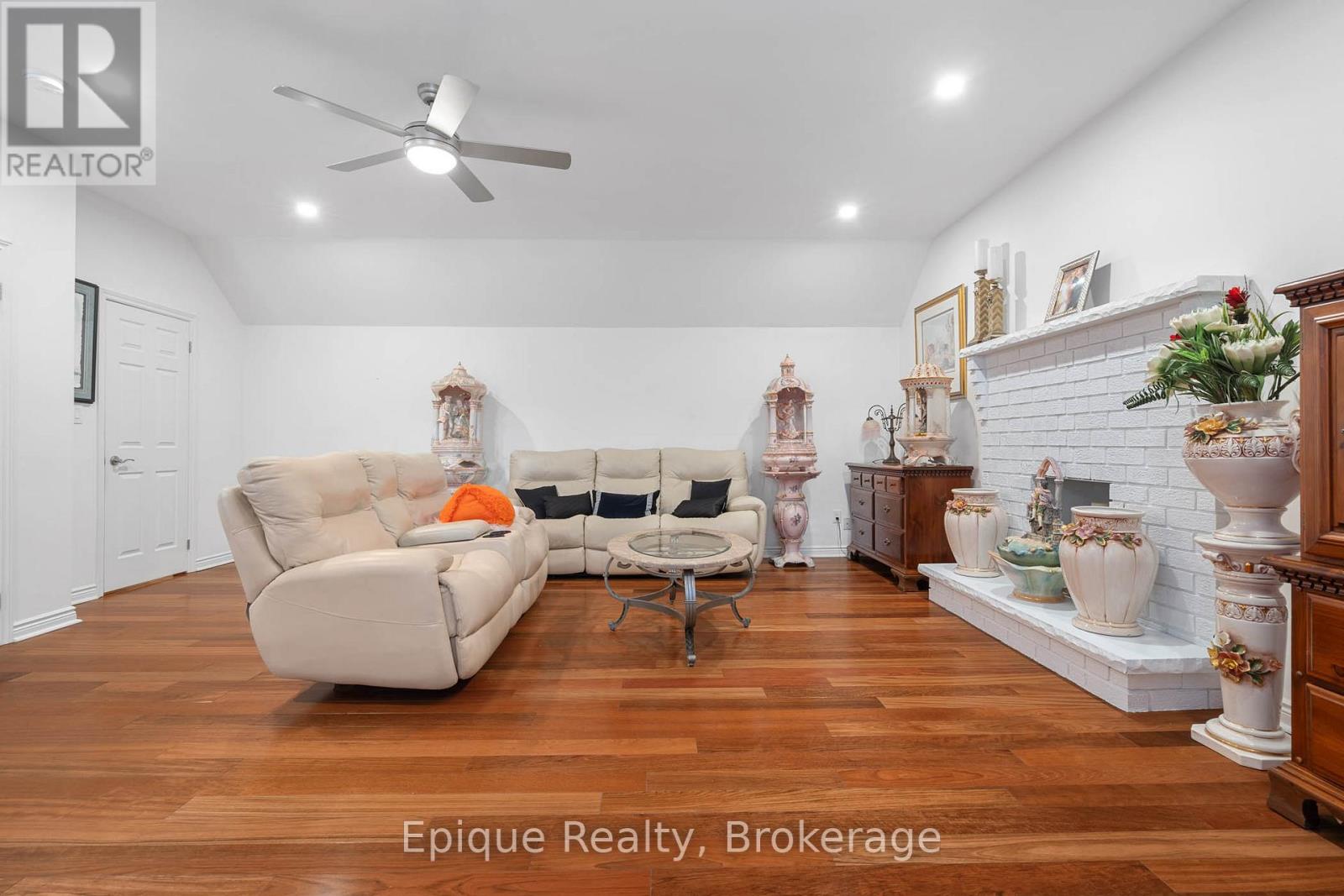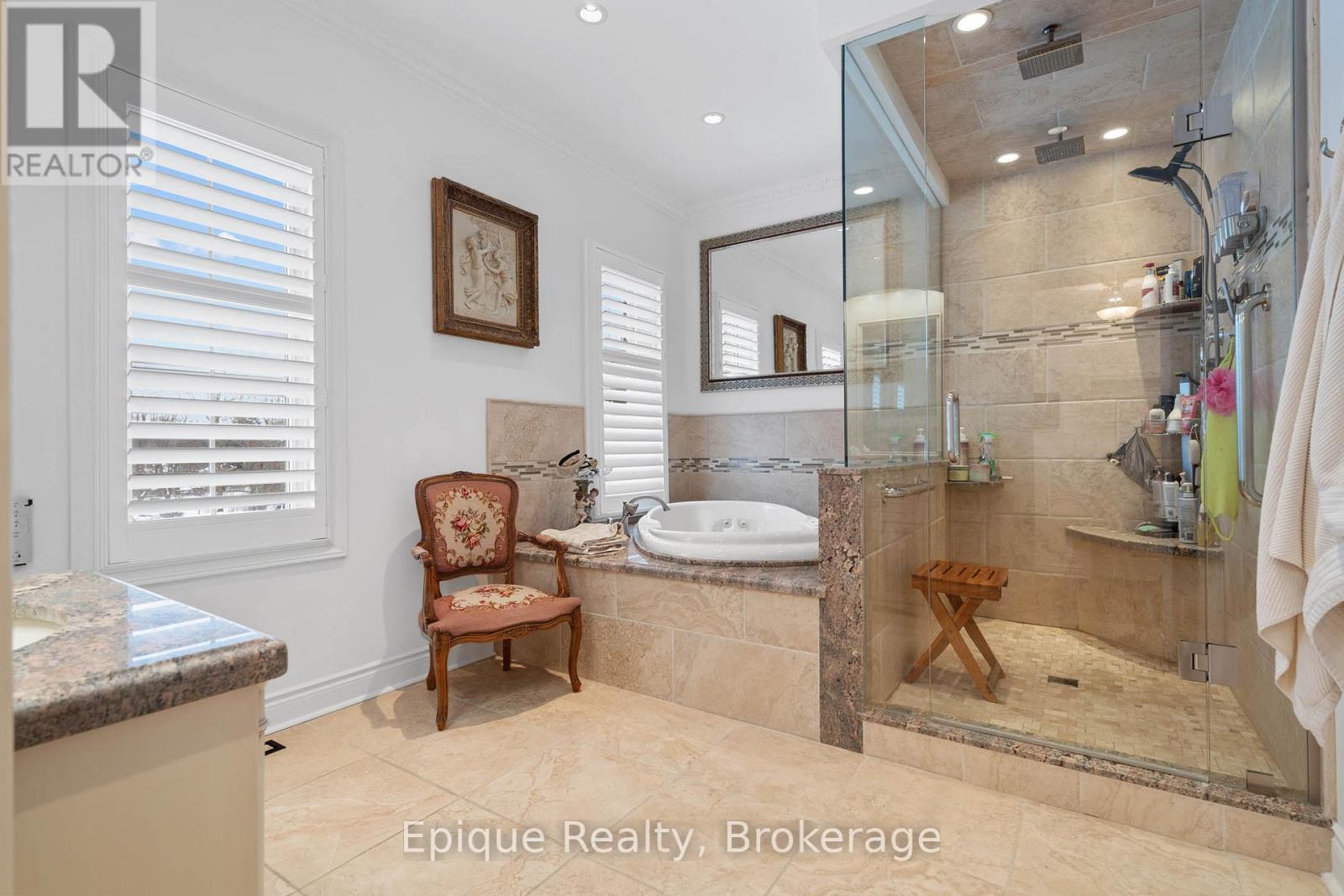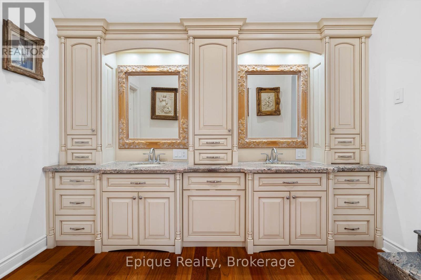 EXPERIENCE UNMATCHED LUXURY IN CAMPBELLVILLE. Nestled on a lush and private 1.13 acres, this imposing 7,200 sq. ft. estate is a masterpiece of design and craftsmanship. Exotic Brazilian cherry floors, Swarovski crystal chandeliers, and five fireplaces create an ambiance of timeless elegance.The formal dining room stuns with a majestic fireplace and chandelier, while the main-floor office connects seamlessly to the conservatory, perfect for entertaining with a baby grand piano. The gourmet kitchen boasts Jenn-Air & Bosch appliances, custom cabinetry, and quad French doors leading to an expansive deck and remote-controlled screened sunroom.The primary suite wing is a private retreat with a sitting area, gas fireplace, spa-inspired ensuite with double vanities, an oversized glass shower, a deep soaker tub, and extensive closet space. Three additional bedrooms share an opulent oversized bath, ensuring comfort and elegance.The professionally finished lower level includes a spa-inspired 3-piece bath with a steam shower. Outdoors, enjoy a 20 x 40 heated saltwater pool, pool house changeroom, and a cedar cabana bar with power and water.For the automobile enthusiast, the 4-car garage and parking for 20+ vehicles provide ample space. Just minutes from the 401, this estate offers unparalleled luxury, privacy, and accessibility.A rare opportunity to own a true luxury retreat. Schedule your private showing today. (id:64974)