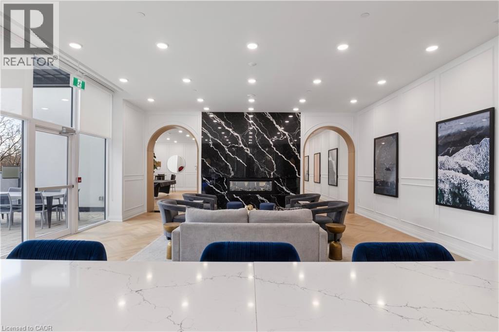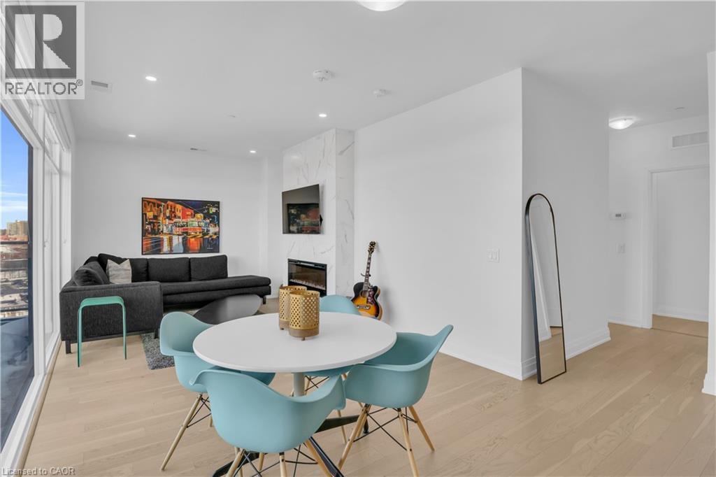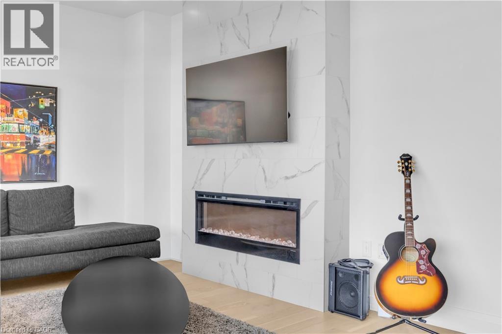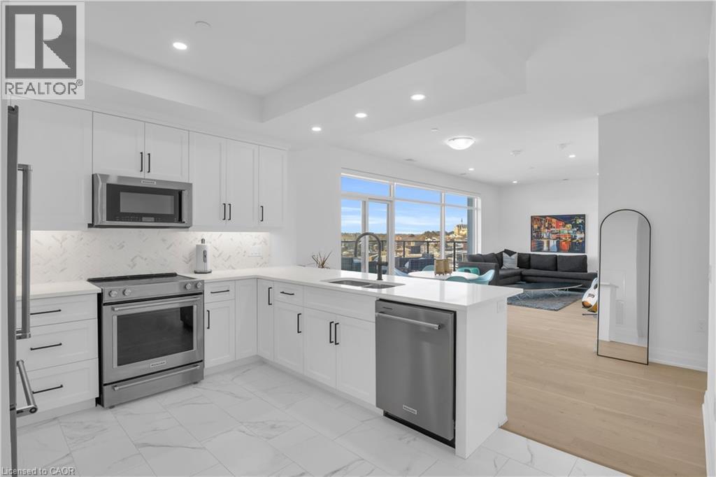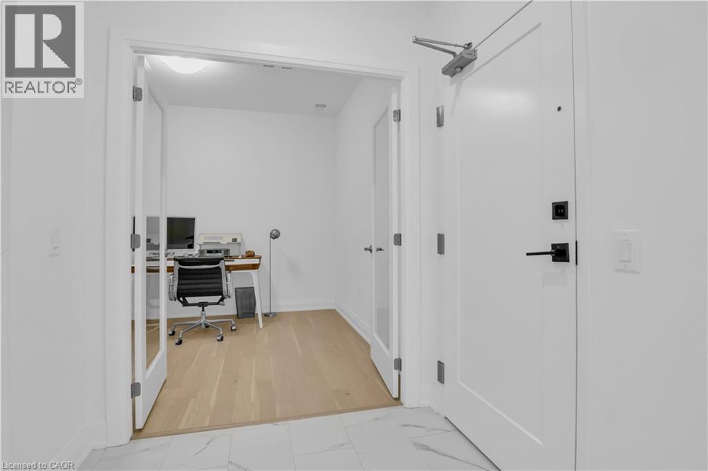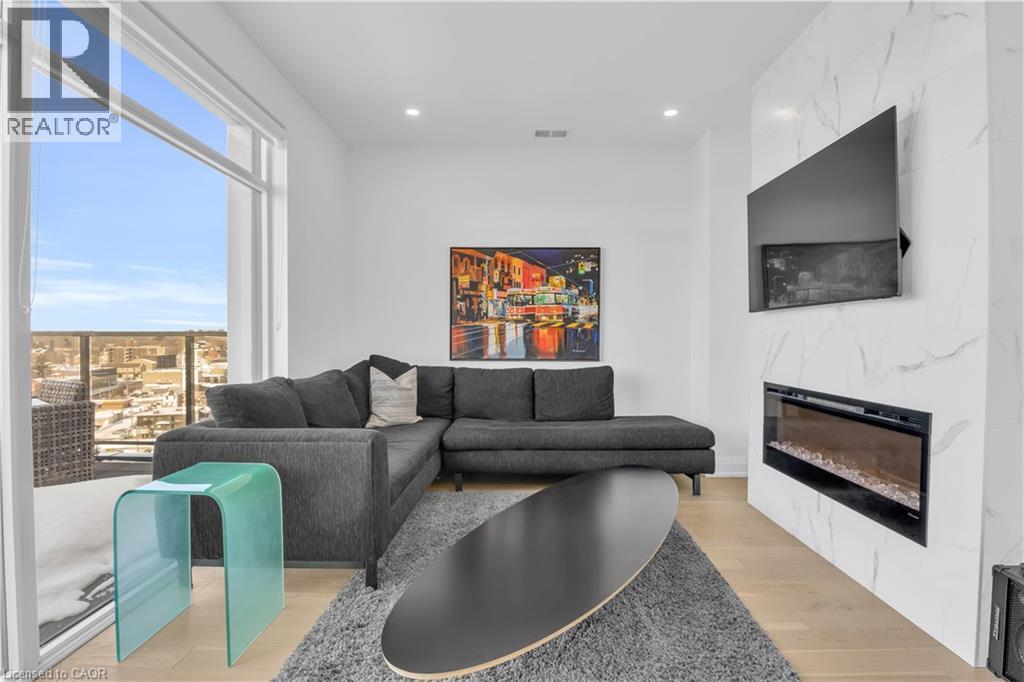Welcome to 1105-71 Wyndham Street South, an elegant two bedroom plus den, two bathroom residence offering over 1,300 square feet of well-appointed living space in one of Guelph’s most prestigious condominium communities. Ideally situated along the Speed River and just steps to downtown, this suite combines generous proportions with a refined waterfront setting. A welcoming foyer with ample closet storage leads to a private den enclosed with French doors, ideal as a dedicated home office, reading retreat, or quiet lounge. This flexible space adds functionality while maintaining separation from the main living areas. The open-concept kitchen, dining, and living space is designed for comfortable everyday living and hosting. Large windows bring in natural light and showcase river views. The kitchen features built-in stainless steel appliances, quartz countertops, and a peninsula with seating. The living room is centred around a gas fireplace with a marble surround, creating a warm focal point. Step out to the expansive private terrace with views of the Speed River, offering ample space for outdoor seating and dining. The primary suite also enjoys its own private balcony overlooking the river, along with a walk-in closet and ensuite bath. A spacious second bedroom is located near a four-piece bathroom, and ensuite laundry provides added convenience. Residents have access to premium amenities including a library, games room, exercise room, and billiard room. With over 1,300 square feet, multiple outdoor spaces, and a walkable location close to downtown shops, dining, and trails, this residence presents an exceptional opportunity in the heart of Guelph. (id:64974)