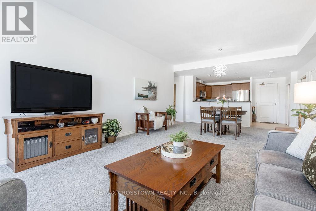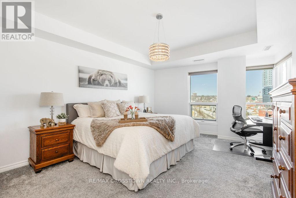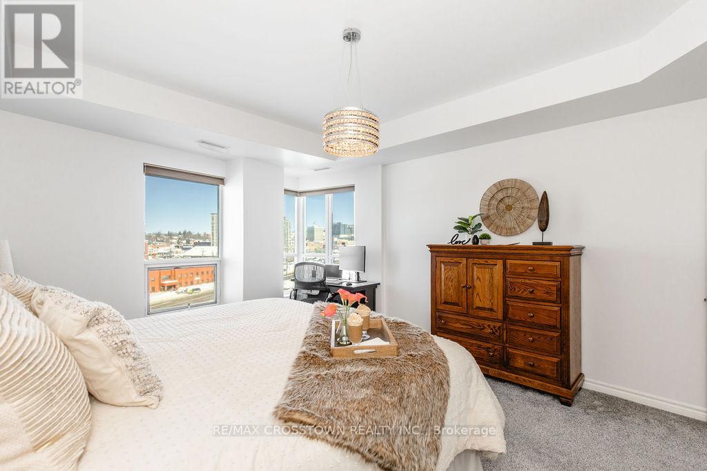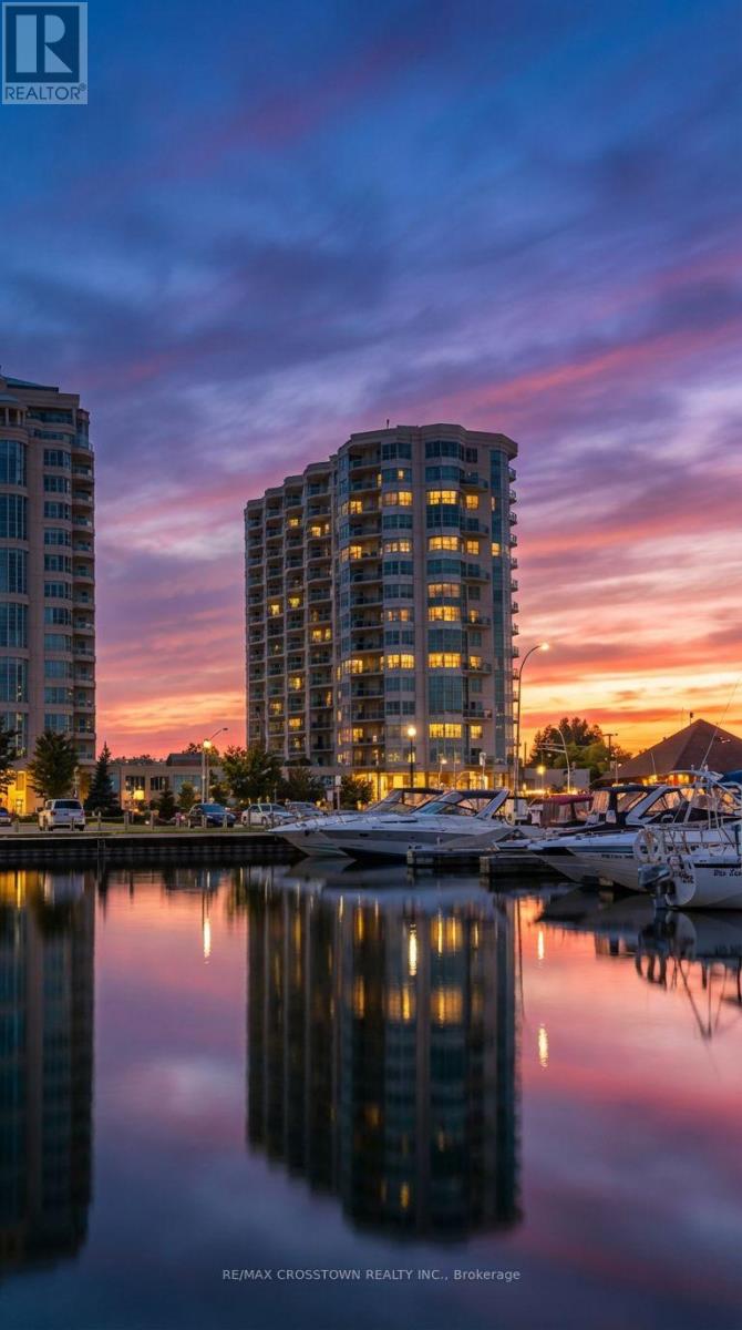 Welcome to one of Barrie's most sought-after waterfront residences, perfectly positioned across from Kempenfelt Bay and steps to the marina, Centennial Beach, scenic waterfront trails, parks, and year-round recreation. Enjoy the best of downtown living with shopping, dining, patios, and entertainment just a short stroll away, while commuters will appreciate easy access to Highway 400, the Allandale Waterfront GO Station, and public transit. This 2-bedroom, 2-bathroom 1389 SF suite with a large den offers a bright and functional layout designed for comfort and flexibility. Natural light fills the open-concept living, dining, and kitchen space, flowing seamlessly to a private balcony where bay views create the perfect backdrop for morning coffee or evening relaxation. The spacious den provides an ideal home office, reading nook, or additional living space. The primary bedroom features generous closet space and a private ensuite, while the second bedroom and full bathroom offer comfort for guests or family. In-suite laundry adds everyday convenience. Freshly updated and move in ready, 2024 upgrades include new carpet, new paint throughout the unit, new light fixtures, new faucets, new doorknobs and hinges throughout, new cabinet knobs in kitchen and in bathrooms, new towel bars, and new kitchen backsplash. Residents enjoy a full suite of premium amenities, including an indoor pool, sauna, hot tub, fitness centre, party/games room, guest suites, visitor parking, and more. Underground parking and a storage locker complete this exceptional offering. A rare opportunity to enjoy waterfront scenery, downtown energy, and resort-style living in one unforgettable setting. (id:64974)