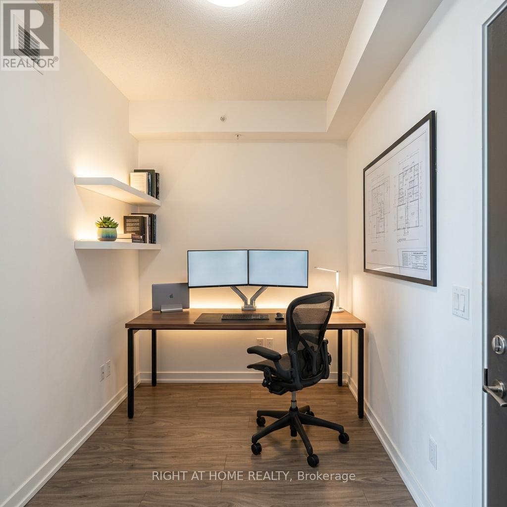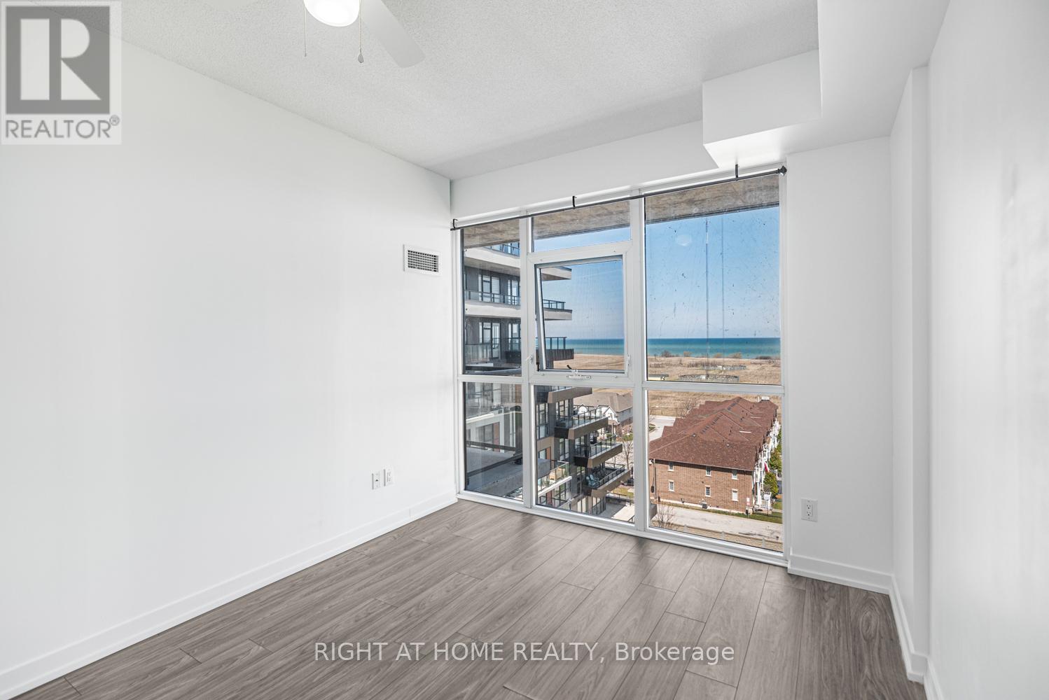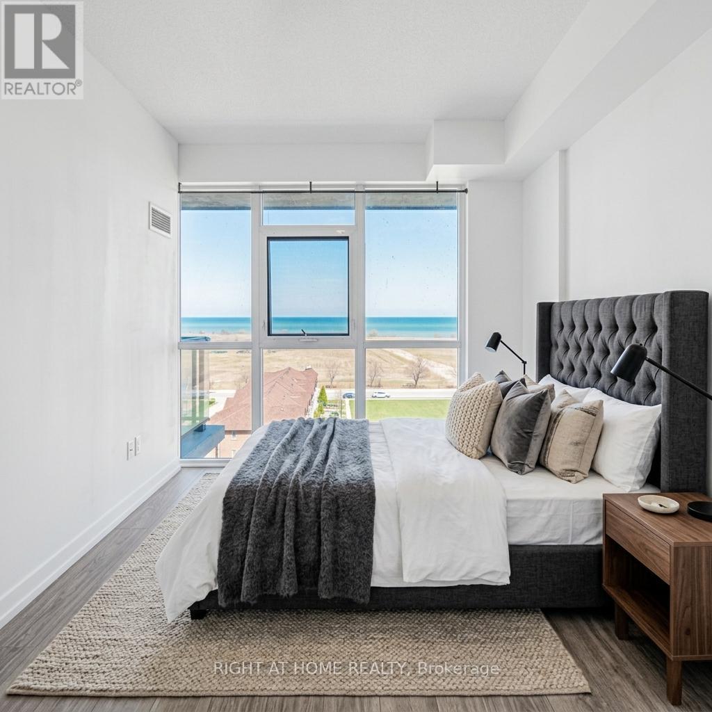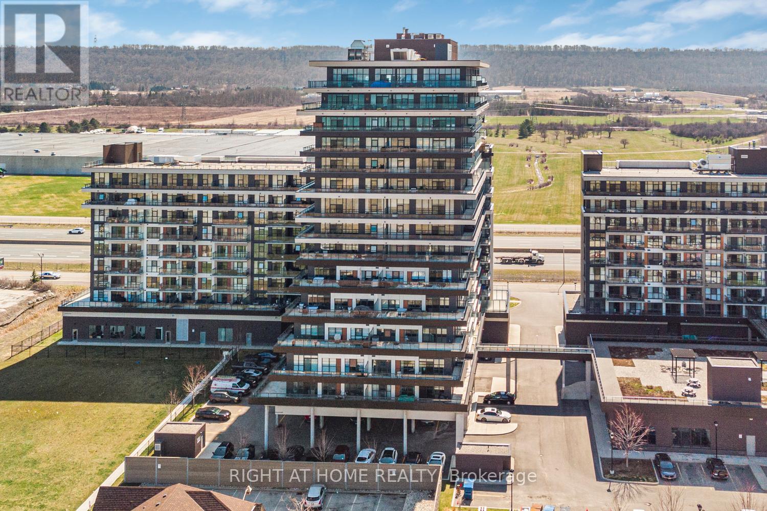 NORTH FACING LAKE VIEWS AND 9 FT CEILINGS IN GRIMSBY WATERFRONT COMMUNITY! It feels different from the moment you step inside. The space breathes. With 9 ft ceilings overhead and floor to ceiling windows pulling Lake Ontario into the room, the light is generous without the afternoon sun baking through, and there is a stillness here that the city simply cannot offer. Over 700 sq ft of open concept living, carpet free throughout, private balcony with nothing but water and sky ahead. The kitchen earns its place with granite countertops, stainless steel appliances, a grey subway tile backsplash, white shaker cabinetry and a centre island. Primary bedroom with walk in closet and a clean 3 piece bath with glass shower. The den handles the office, the guests, or whatever life asks of it. In suite laundry, one underground parking space and a storage locker. The building brings 24 hour concierge, a rooftop terrace and BBQ, fitness centre, party room and guest suites so the amenities match the lifestyle. Step outside and Casablanca Waterfront Park is right next door, a km of shoreline with beaches, trails, pavilions and open green space that most city dwellers drive an hour to find. Fifty Point Conservation Area with its marina and beach is a 5 minute drive west. The Bruce Trail and Beamer Memorial Conservation Area are minutes up the escarpment. Wine country begins right here in Grimsby with over 88 wineries within easy reach along the Niagara Bench. The QEW and GO Station are minutes away for when the city calls. This is the life people keep saying they will get around to one day. (id:64974)