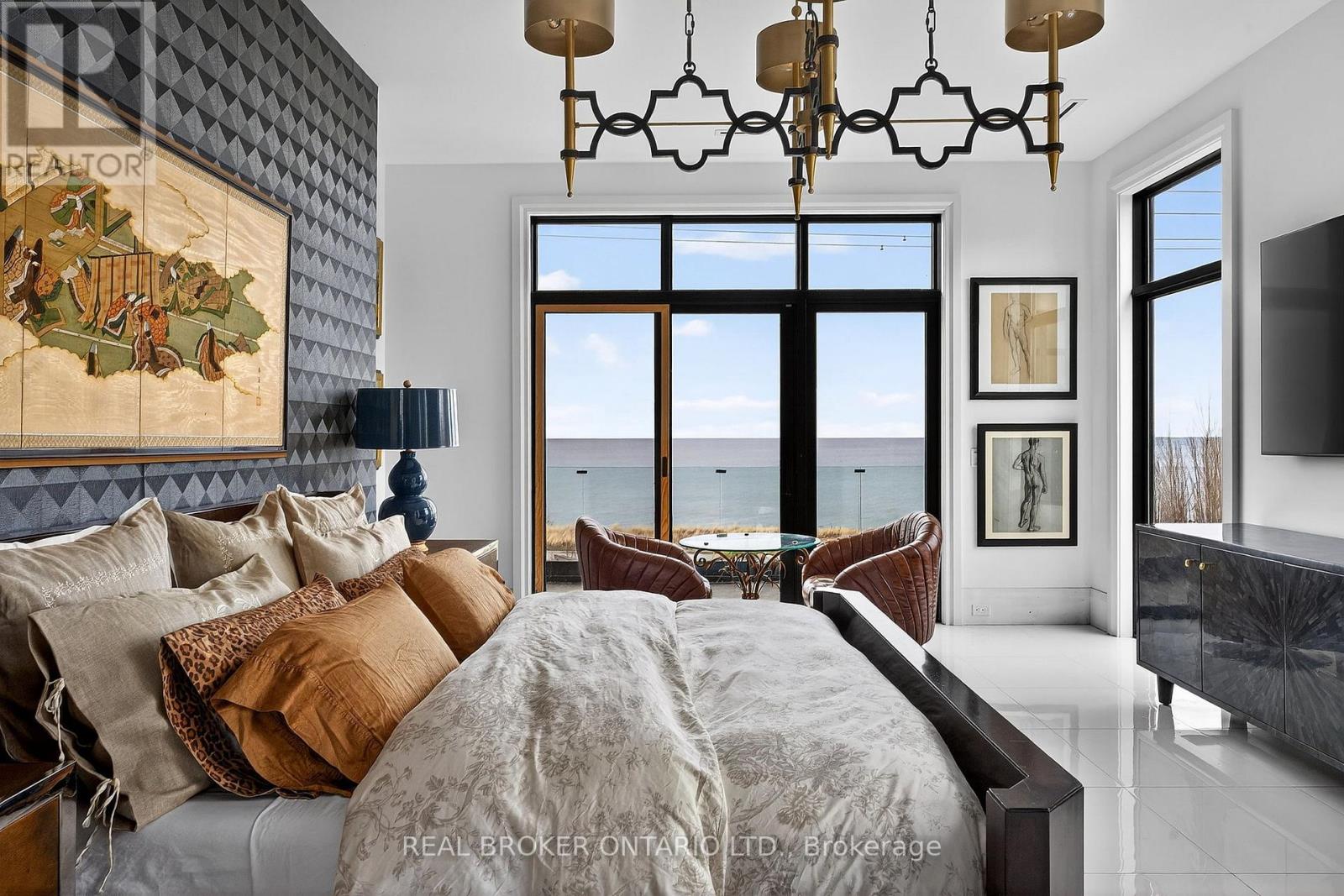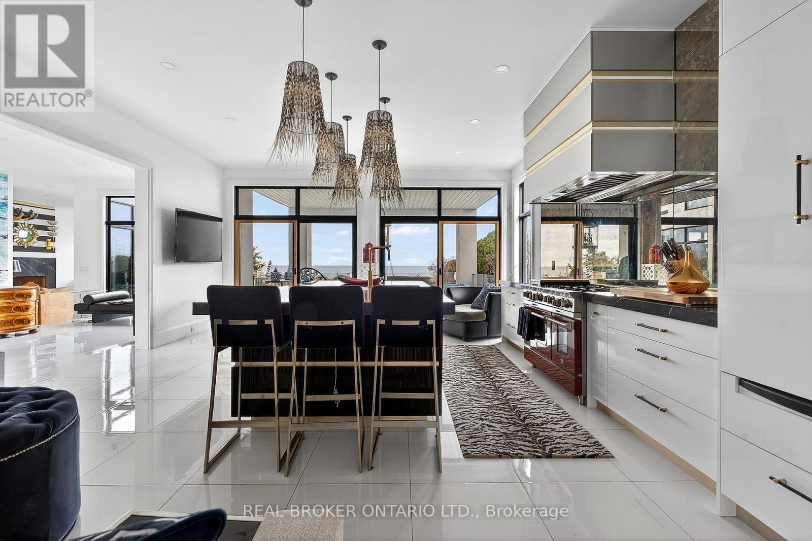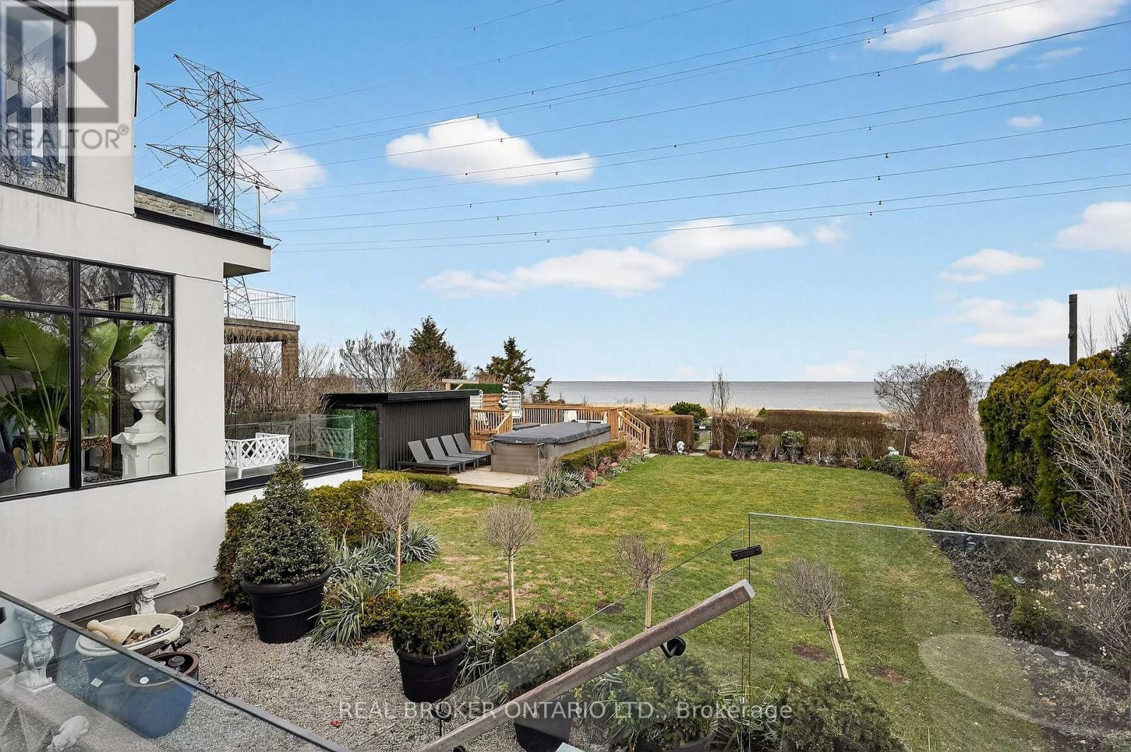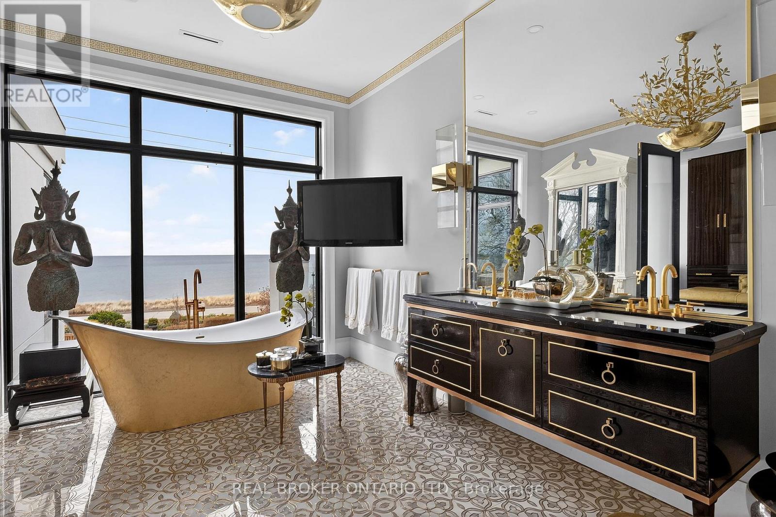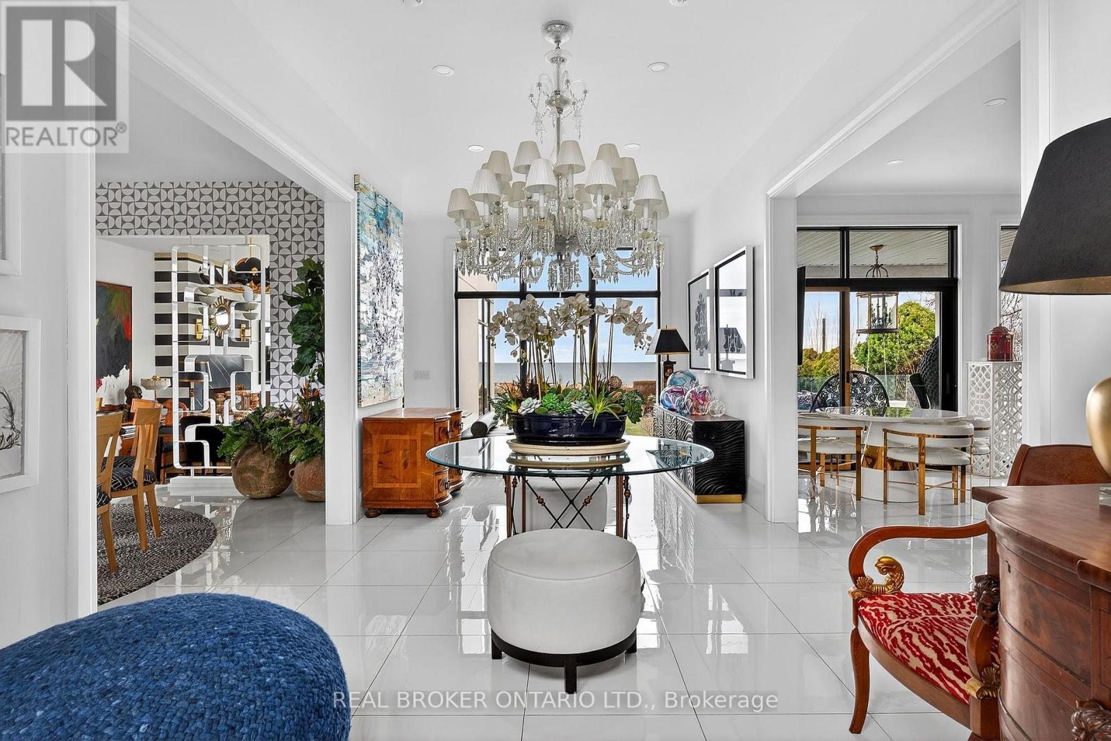 DIRECT WATERFRONT LUXURY. Experience refined lakeside living at 711 Beach Blvd, a 6,700+ sq ft custom masterpiece (2020) situated directly on the 10km Hamilton Waterfront Trail with private beach access. This 3+2 bed, 5 bath sanctuary blends architectural grit with coastal elegance.10' ceilings, bespoke millwork, and hand-cut marble inlays. The grand foyer features a showstopping chandelier of 600 gold spoons and Swarovski accents. A true Chef's kitchen boasts an 8-burner range, dual dishwashers & fridges and a dedicated coffee/bar room overlooking the lake.The primary suite offers a double-sided fireplace and a spa-style bath with a signature gold soaking tub. The lower level adds a gym, media room, and 2 extra bedrooms/offices.4 Duradek terraces, a Jacuzzi swim spa, and professional landscaping on a lot that widens to 72' at the water. Double garage with lift potential + parking for 6. A rare, high-design sanctuary on the shores of Lake Ontario. (id:64974)