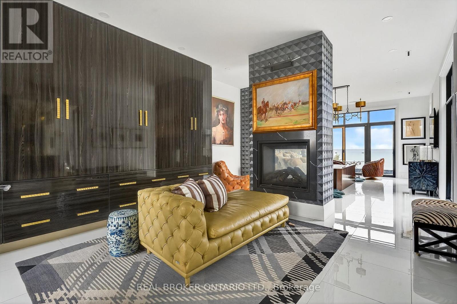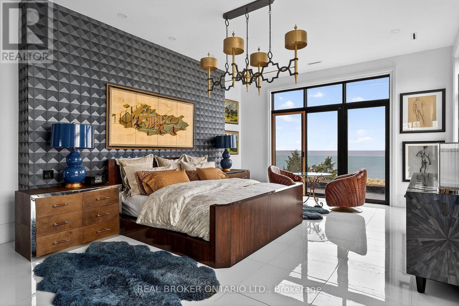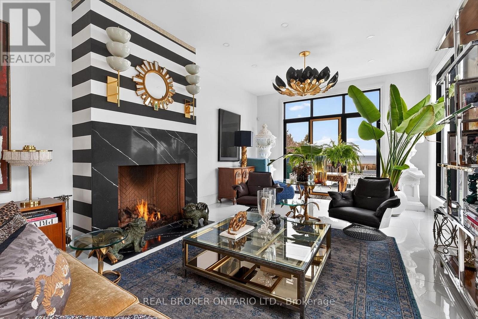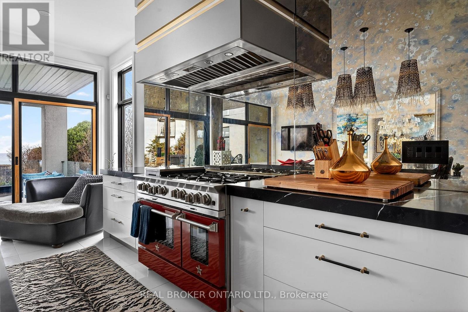 DIRECT WATERFRONT LUXURY. Experience refined lakeside living at 711 Beach Blvd, a 6,700+ sq ft custom masterpiece (2020) situated directly on the 10km Hamilton Waterfront Trail with private beach access. This 3+2 bed, 5 bath sanctuary blends architectural grit with coastal elegance.10' ceilings, bespoke millwork, and hand-cut marble inlays. The grand foyer features a showstopping chandelier of 600 gold spoons and Swarovski accents. A true Chef's kitchen boasts an 8-burner range, dual dishwashers & fridges and a dedicated coffee/bar room overlooking the lake.The primary suite offers a double-sided fireplace and a spa-style bath with a signature gold soaking tub. The lower level adds a gym, media room, and 2 extra bedrooms/offices.4 Duradek terraces, a Jacuzzi swim spa, and professional landscaping on a lot that widens to 72' at the water. Double garage with lift potential + parking for 6. A rare, high-design sanctuary on the shores of Lake Ontario. (id:64974)