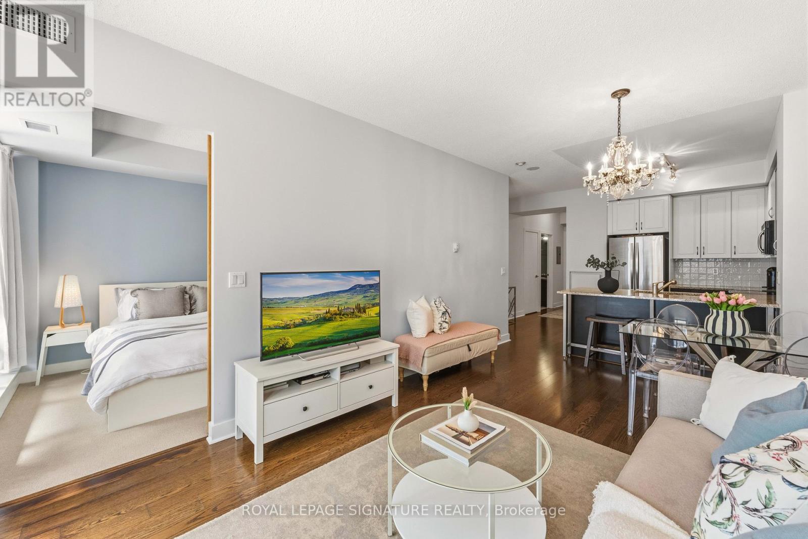 Welcome to stylish downtown living at The Hudson. This highly coveted address places you steps from some of the city's best restaurants, cafés and nightlife. Transit at your doorstep for easy access to the Financial District, waterfront and short walk to The Well. This bright and spacious one-bedroom plus den suite offers a well designed layout filled with natural sunlight. The large south facing balcony provides the perfect space for a morning coffee or evening cocktail. A modern Gluckstein designed kitchen with breakfast bar seamlessly connects to the open-concept living and dining area, while the versatile den provides the perfect space for a home office or guest area. Also included is parking and a locker, resort style amenities including party room, state of the art gym & garden terrace. This is the perfect building & unit to call home. (id:64974)