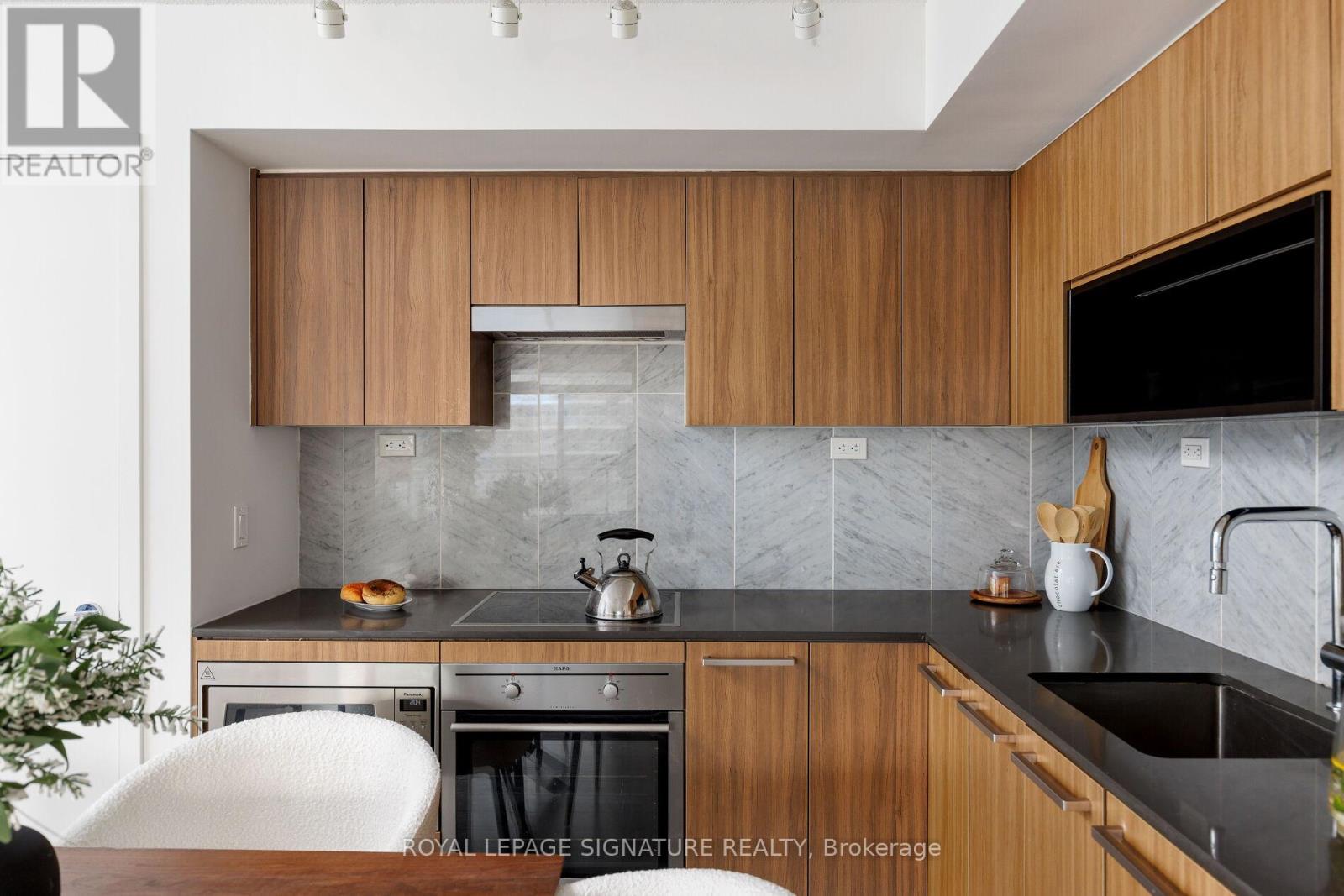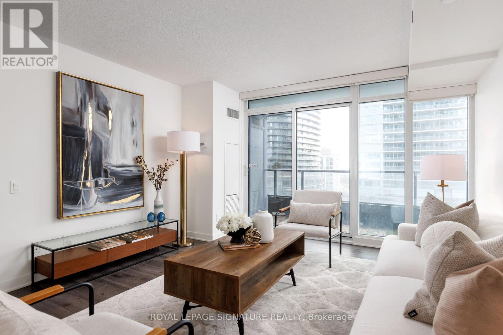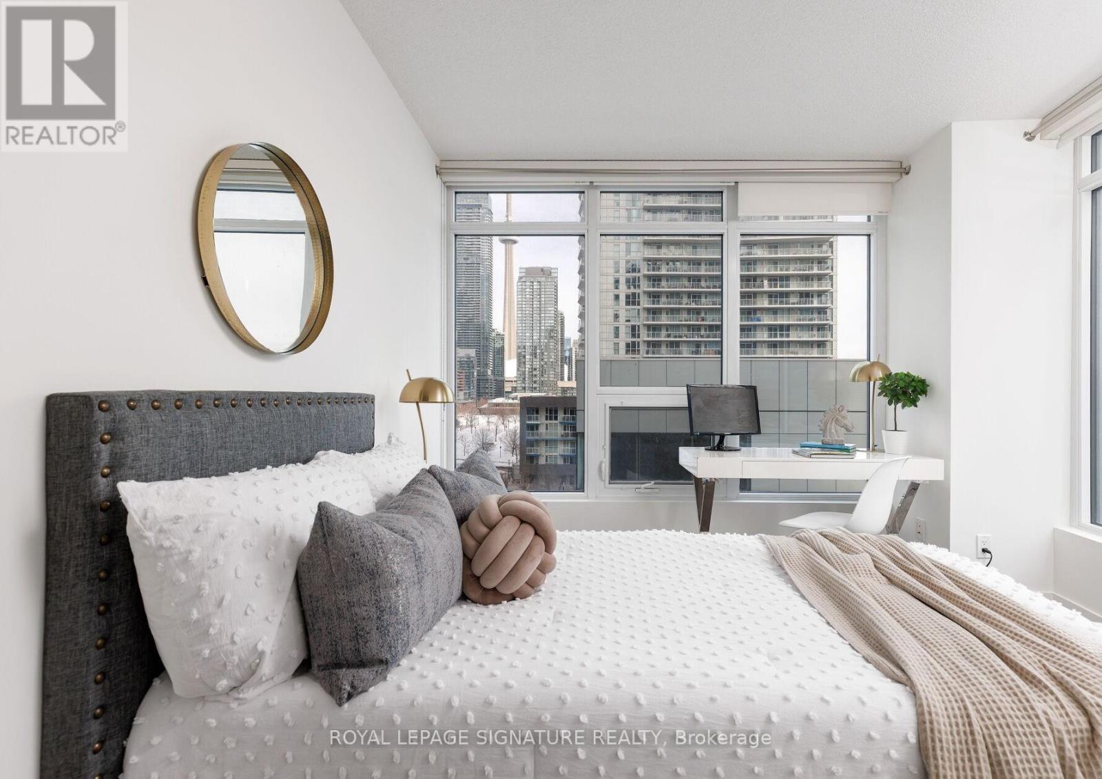Featuring over 1,000 sq ft of thoughtfully designed living in the heart of downtown. This rare 3-bedroom, 2-bath south-facing suite offers true flexibility for growing families, professionals working from home, or anyone ready to upgrade from a smaller condo. Enjoy CN Tower views from your private balcony, fresh paint and laminate flooring throughout. The modern kitchen features composite quartz countertops, Carrara marble backsplash, thermofoil cabinetry, undermount sink, premium chrome fixtures and integrated stainless steel appliances. Spa-inspired bathrooms showcase polished and honed Carrara marble tile, quartz counters, custom medicine cabinets and dual-flush toilets. Spacious bedrooms, walk-in closet and ensuite in the primary retreat. (id:64974)