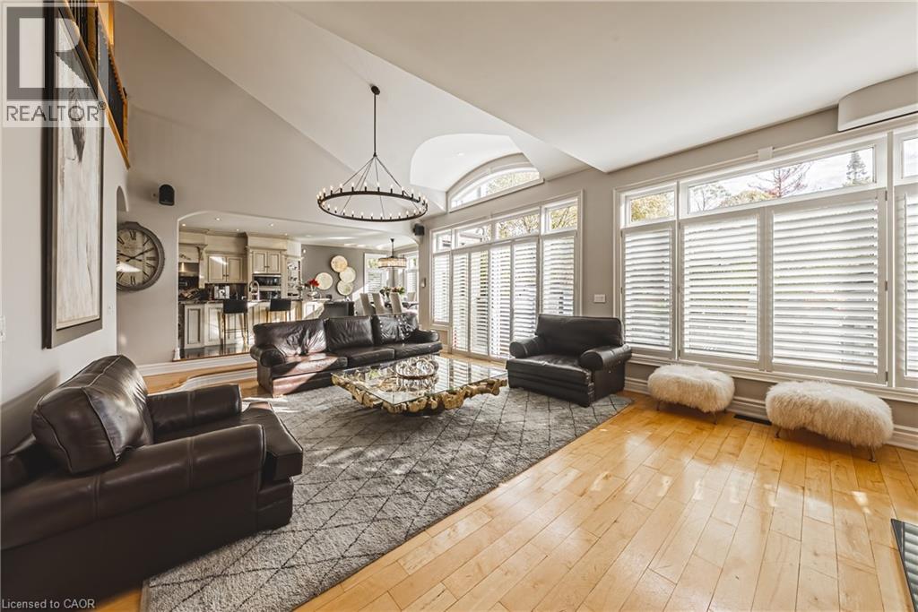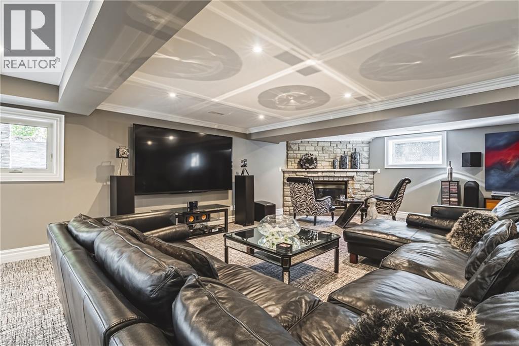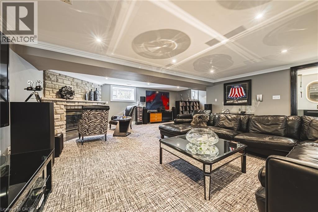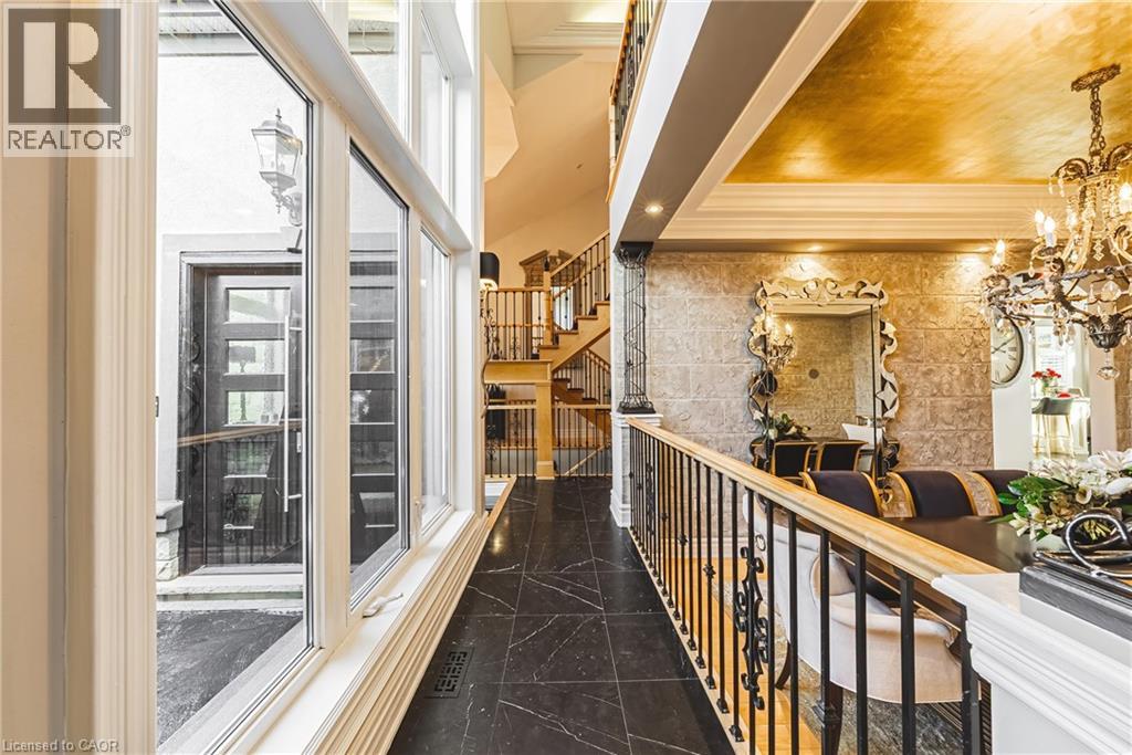 Unique, custom-built luxury home offering just over 5000 sq ft of Finished Living Space. Attention to detail & fine construction throughout, this home offers elegance, comfort, & functionality. Step into the grand sitting area, featuring soaring ceilings, stunning windows, & an impressive open staircase that connects all levels of the home. Sunken dining room boasts coffered gold leafing ceilings for refined entertaining. Custom Built Downsview kitchen offers abundant cabinetry, granite countertops, & top-of-the-line stainless steel appliances, including a Sub-Zero refrigerator, Wolf gas range, Gaggenau built-in oven, Miele dishwasher, & microwave storage. Relax or entertain in the expansive great room, featuring dramatic ceiling heights & a backlit onyx walls for your tv. An open-concept office with natural light, perfect workspace. Main-floor laundry room includes garage access. Upstairs, the spacious primary suite offers a large walk-in closet & a renovated 5-piece ensuite (2025). Two generous bedrooms share a beautifully appointed 4-piece bathroom, & a bright loft area overlooks both the front & rear of the home. The lower level features large windows & offers in-law suite potential with separate walk-ups to both the rear yard & garage. Cozy recreation room with fireplace, a fully equipped gym, a sauna for relaxation, 3 pc bath (2025), workshop, cold room, & plenty of storage space. The outdoor oasis includes a composite deck with built-in BBQ, hot tub, & an oversized waterfall feature with fireplace, artificial turf & a storage shed. Additional highlights include an oversized 2-car garage with abundant storage & a long interlock driveway accommodating up to 8 vehicles & irrigation system. Trillium award several years for landscaping. Ideally located near Tiffany Falls, Tamahaac Club, Highway 403, the Linc, Costco, schools, parks, & trails, luxury living with convenience & lifestyle. (id:64974)