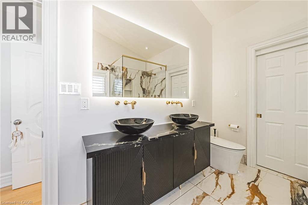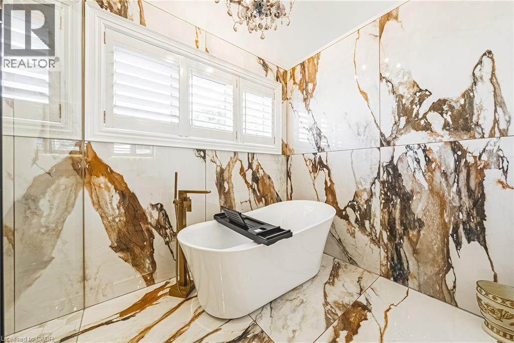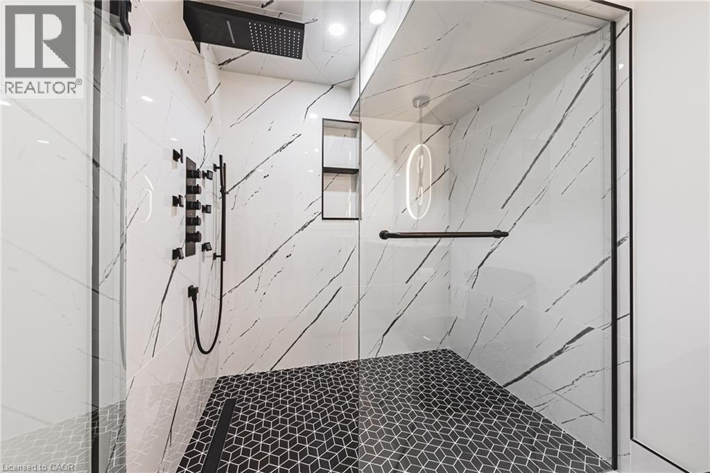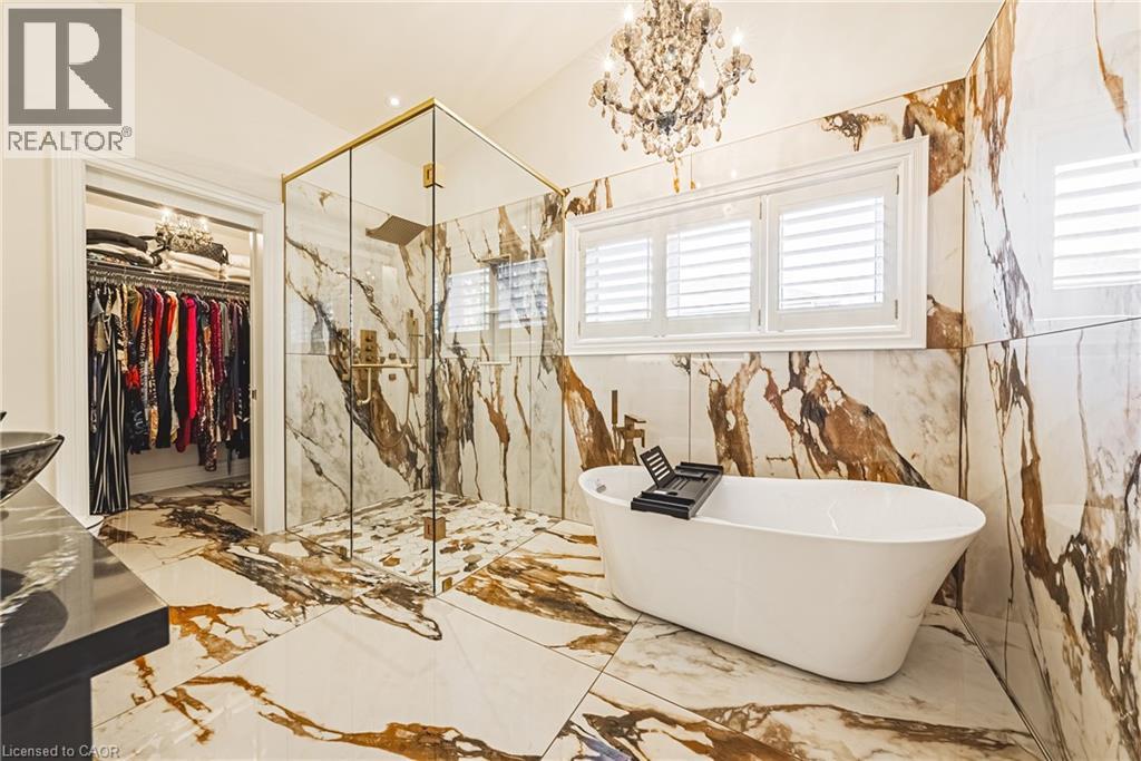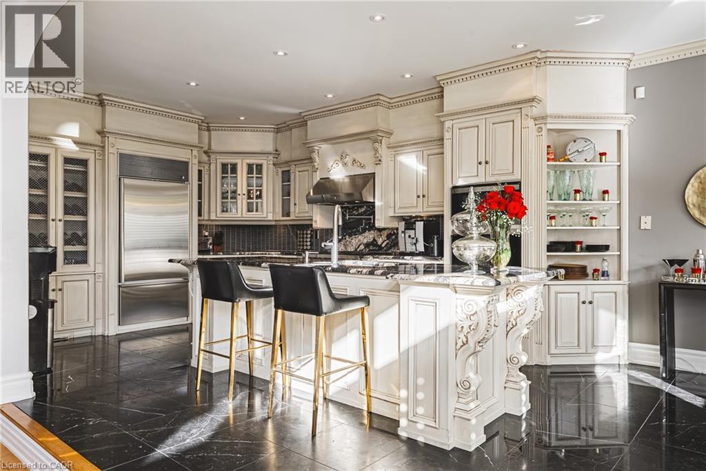 Unique, custom-built luxury home offering just over 5000 sq ft of Finished Living Space. Attention to detail & fine construction throughout, this home offers elegance, comfort, & functionality. Step into the grand sitting area, featuring soaring ceilings, stunning windows, & an impressive open staircase that connects all levels of the home. Sunken dining room boasts coffered gold leafing ceilings for refined entertaining. Custom Built Downsview kitchen offers abundant cabinetry, granite countertops, & top-of-the-line stainless steel appliances, including a Sub-Zero refrigerator, Wolf gas range, Gaggenau built-in oven, Miele dishwasher, & microwave storage. Relax or entertain in the expansive great room, featuring dramatic ceiling heights & a backlit onyx walls for your tv. An open-concept office with natural light, perfect workspace. Main-floor laundry room includes garage access. Upstairs, the spacious primary suite offers a large walk-in closet & a renovated 5-piece ensuite (2025). Two generous bedrooms share a beautifully appointed 4-piece bathroom, & a bright loft area overlooks both the front & rear of the home. The lower level features large windows & offers in-law suite potential with separate walk-ups to both the rear yard & garage. Cozy recreation room with fireplace, a fully equipped gym, a sauna for relaxation, 3 pc bath (2025), workshop, cold room, & plenty of storage space. The outdoor oasis includes a composite deck with built-in BBQ, hot tub, & an oversized waterfall feature with fireplace, artificial turf & a storage shed. Additional highlights include an oversized 2-car garage with abundant storage & a long interlock driveway accommodating up to 8 vehicles & irrigation system. Trillium award several years for landscaping. Ideally located near Tiffany Falls, Tamahaac Club, Highway 403, the Linc, Costco, schools, parks, & trails, luxury living with convenience & lifestyle. (id:64974)