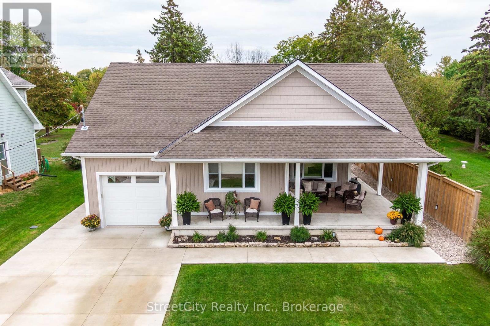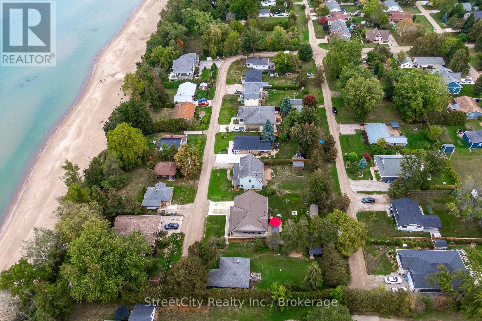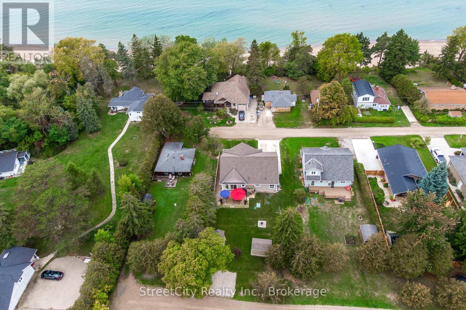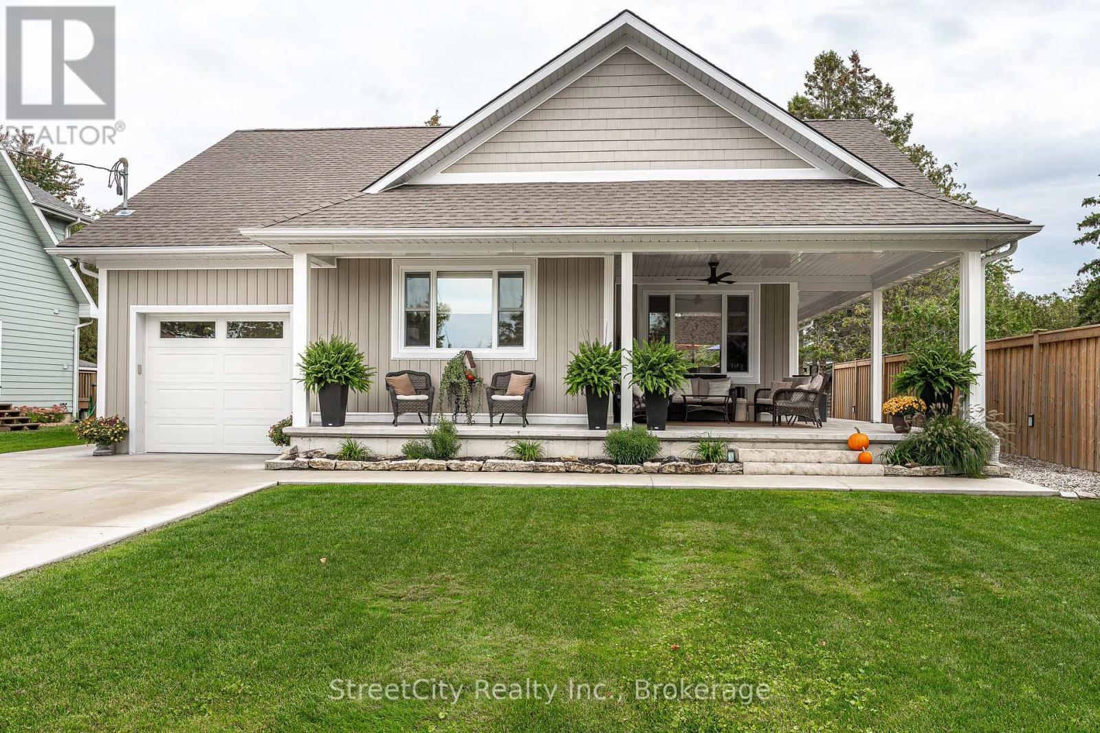 Discover tranquility in this charming lakeside community. Just steps away from Lake Huron's shores, this lake house offers private beach access for sun-soaked days and stunning sunsets. Minutes north of Grand Bend, built in 2018, this 1500sq ft 2-bedroom 2-bath property offers high end finishes and meticulously kept grounds. The interior of this home boasts an open concept living area & quartz kitchen w/ soaring cathedral ceilings, ample cabinet space and massive 2 tier island for family and guests to gather around. Main floor bedroom & gorgeous 4 pc bath w/ walk in shower & soaker tub. The upper level features a Primary bedroom w/ 4 pc washroom. Insulated & heated garage has been converted to a 3rd bedroom/games room/media room and is used year-round by the current owner. Main floor laundry w/ custom cabinetry. On demand water heater, furnace, air exchanger and central air, gas generator. The exterior of this home features an expansive beautiful fully covered front porch and side entrance, double concrete driveway, outdoor shower, ample deck with built-in cantilevered umbrella, 2 storage sheds and accessory parking in rear. All located on a private street with no through traffic a few steps from the private beaches. Call for more information or to schedule a private showing. (id:64974)