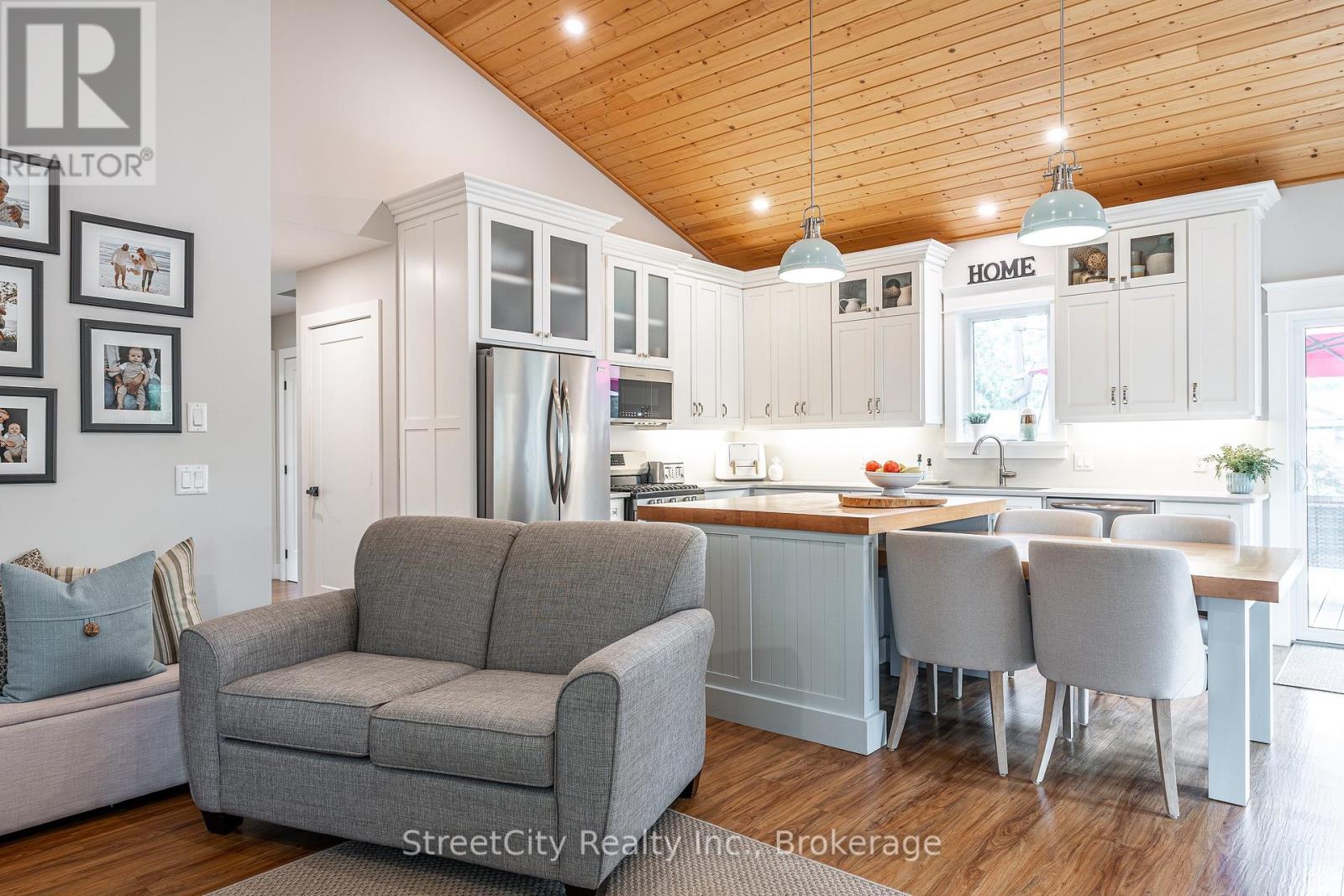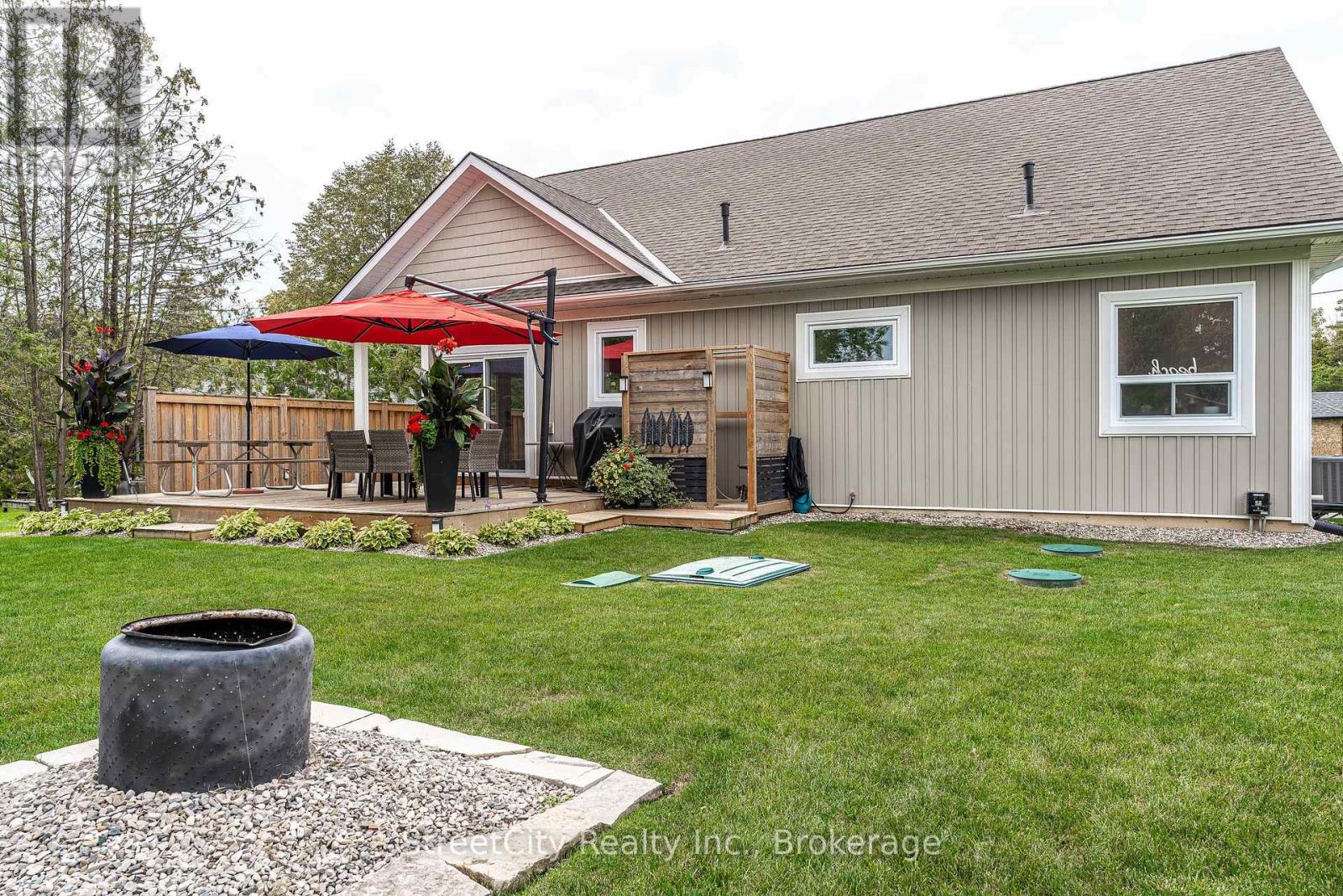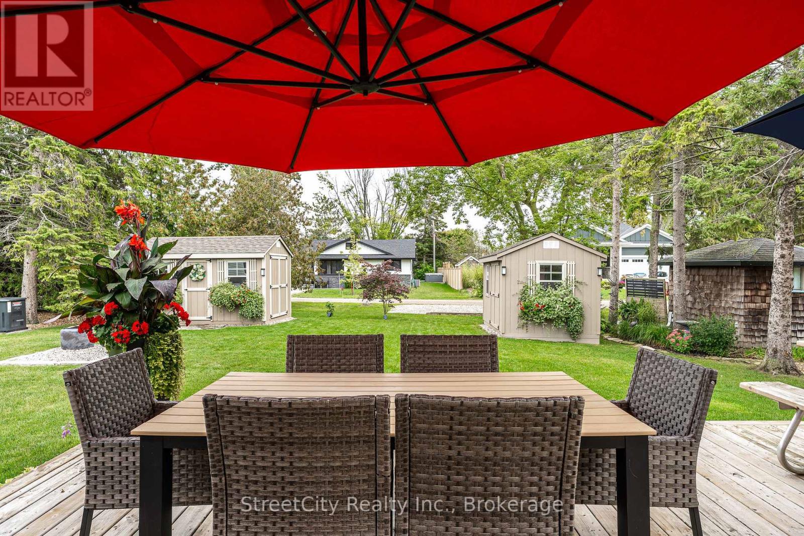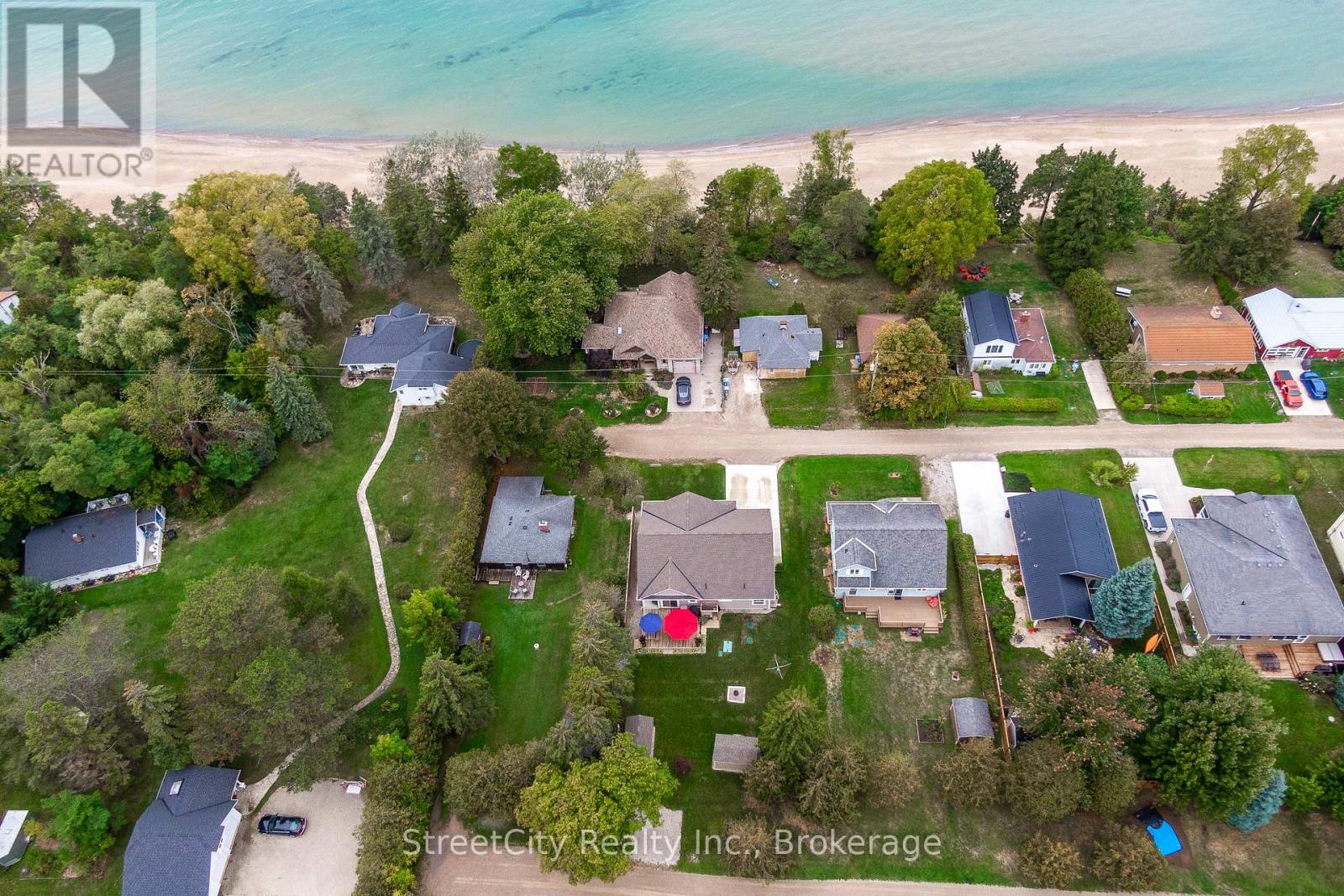 Discover tranquility in this charming lakeside community. Just steps away from Lake Huron's shores, this lake house offers private beach access for sun-soaked days and stunning sunsets. Minutes north of Grand Bend, built in 2018, this 1500sq ft 2-bedroom 2-bath property offers high end finishes and meticulously kept grounds. The interior of this home boasts an open concept living area & quartz kitchen w/ soaring cathedral ceilings, ample cabinet space and massive 2 tier island for family and guests to gather around. Main floor bedroom & gorgeous 4 pc bath w/ walk in shower & soaker tub. The upper level features a Primary bedroom w/ 4 pc washroom. Insulated & heated garage has been converted to a 3rd bedroom/games room/media room and is used year-round by the current owner. Main floor laundry w/ custom cabinetry. On demand water heater, furnace, air exchanger and central air, gas generator. The exterior of this home features an expansive beautiful fully covered front porch and side entrance, double concrete driveway, outdoor shower, ample deck with built-in cantilevered umbrella, 2 storage sheds and accessory parking in rear. All located on a private street with no through traffic a few steps from the private beaches. Call for more information or to schedule a private showing. (id:64974)