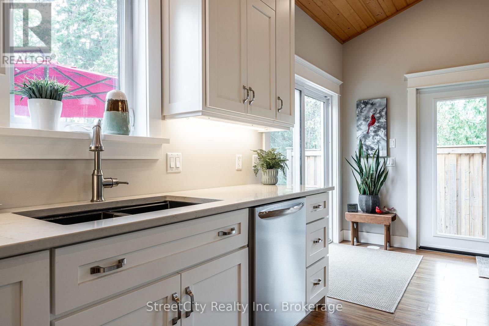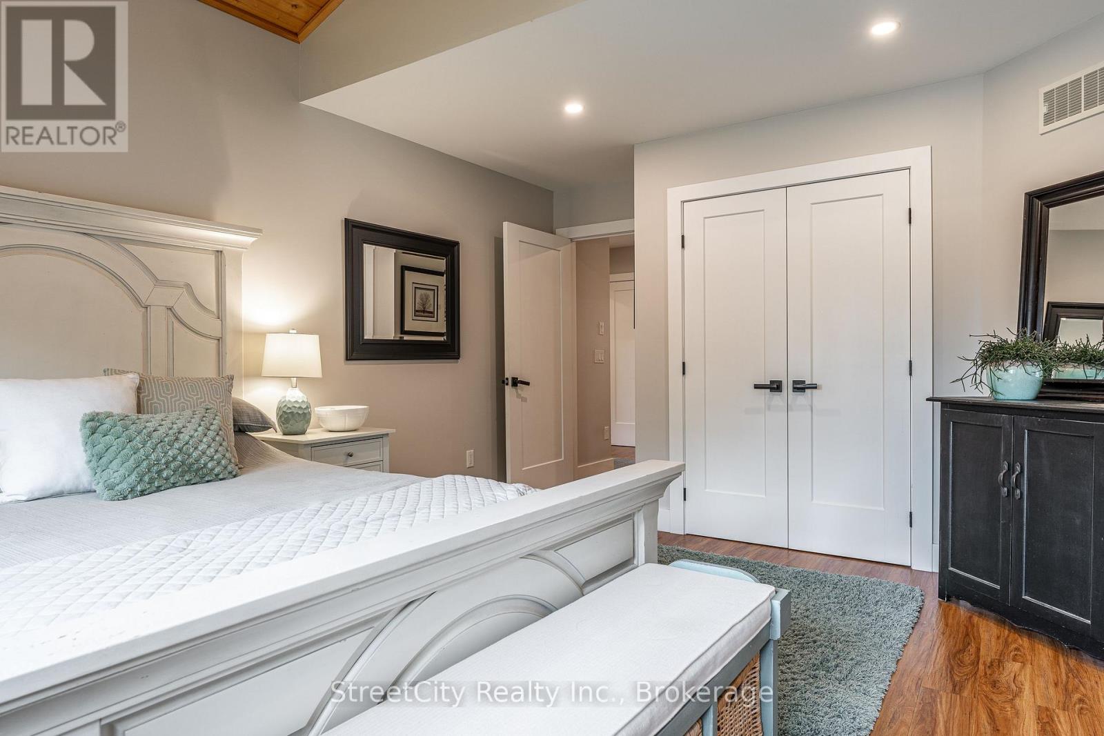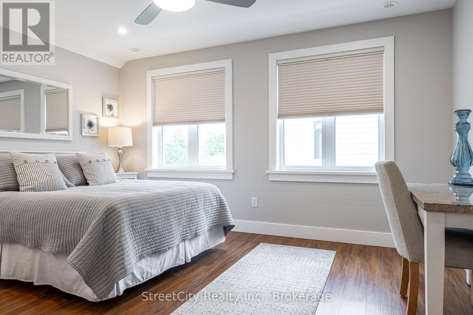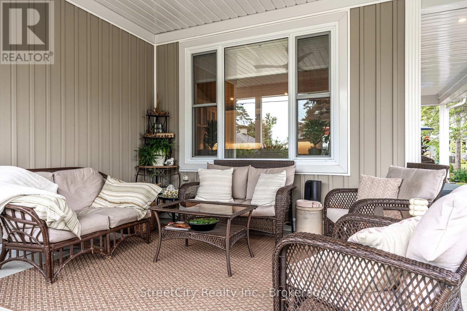 Discover tranquility in this charming lakeside community. Just steps away from Lake Huron's shores, this lake house offers private beach access for sun-soaked days and stunning sunsets. Minutes north of Grand Bend, built in 2018, this 1500sq ft 2-bedroom 2-bath property offers high end finishes and meticulously kept grounds. The interior of this home boasts an open concept living area & quartz kitchen w/ soaring cathedral ceilings, ample cabinet space and massive 2 tier island for family and guests to gather around. Main floor bedroom & gorgeous 4 pc bath w/ walk in shower & soaker tub. The upper level features a Primary bedroom w/ 4 pc washroom. Insulated & heated garage has been converted to a 3rd bedroom/games room/media room and is used year-round by the current owner. Main floor laundry w/ custom cabinetry. On demand water heater, furnace, air exchanger and central air, gas generator. The exterior of this home features an expansive beautiful fully covered front porch and side entrance, double concrete driveway, outdoor shower, ample deck with built-in cantilevered umbrella, 2 storage sheds and accessory parking in rear. All located on a private street with no through traffic a few steps from the private beaches. Call for more information or to schedule a private showing. (id:64974)