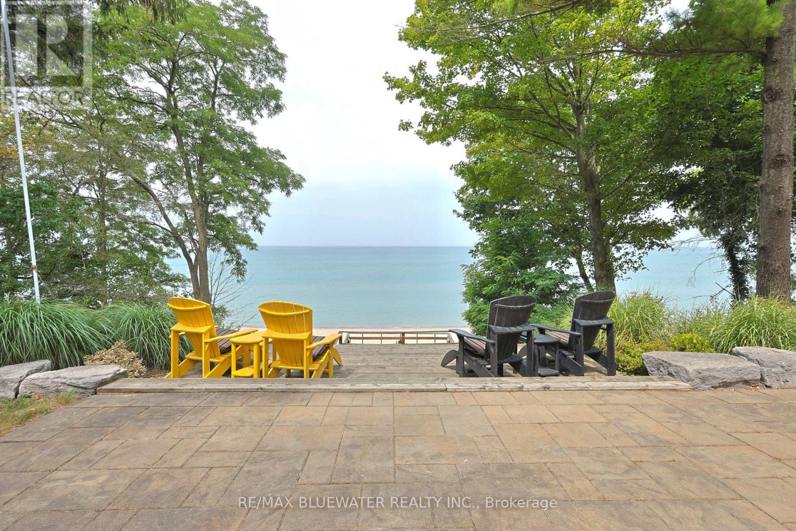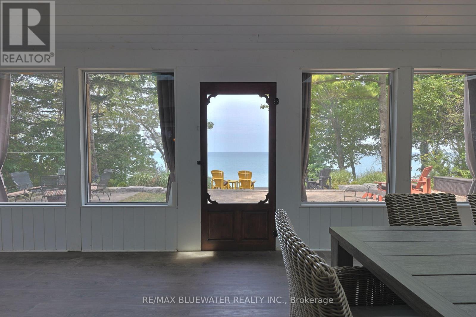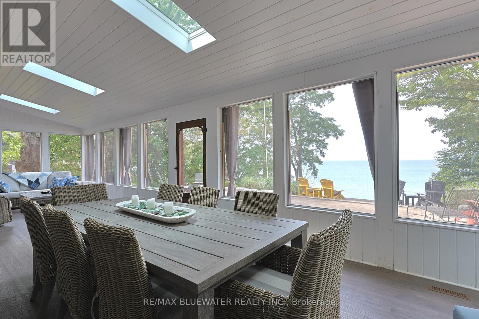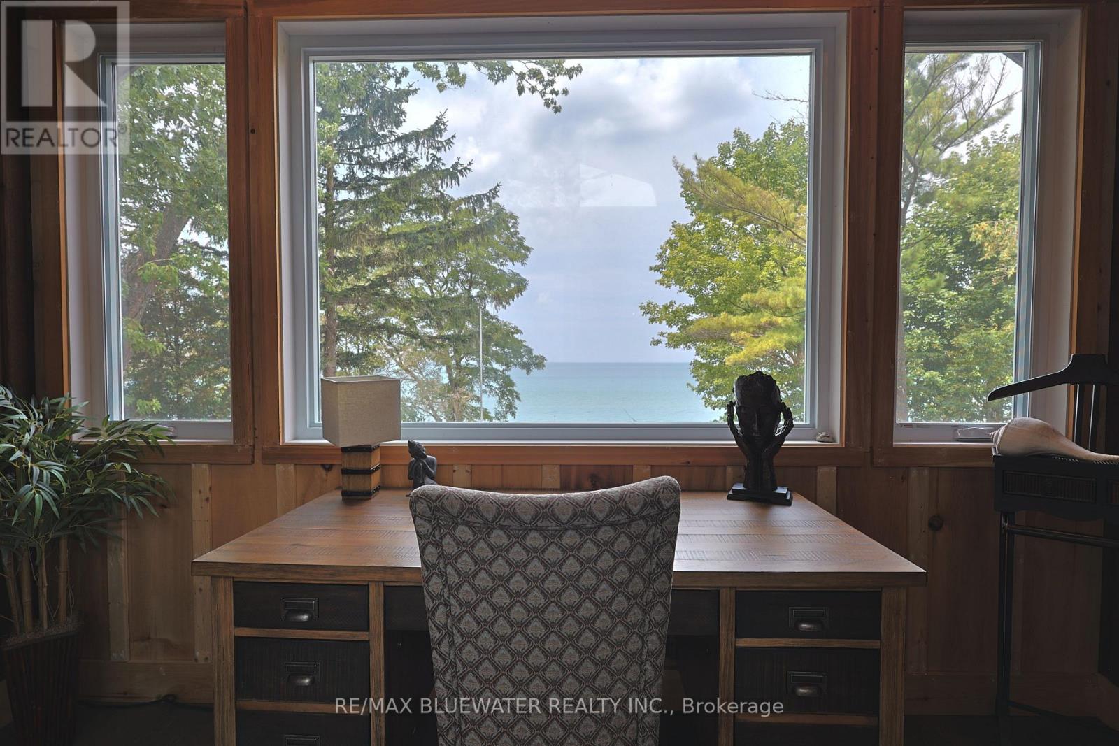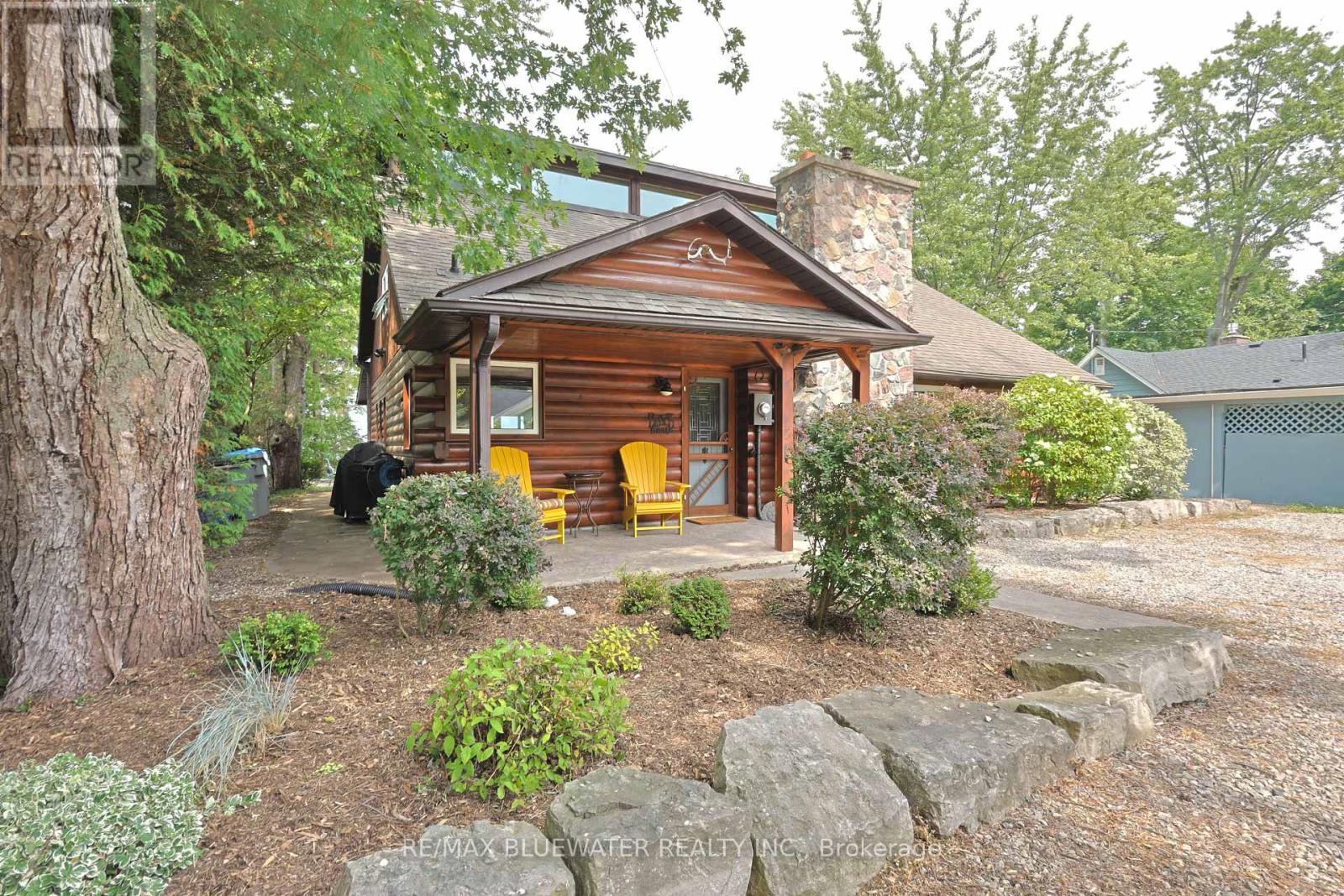 The picture-perfect lakefront retreat just north of Grand Bend! Start checking the boxes off for sandy beaches, panoramic lake views, private setting, spacious updated living space and turnkey with furniture included. Situated in the Highlands III neighborhood this year-round home catches your eye. With the charming log home wood siding finish complimented by the covered front entrance, landscaped gardens, second floor transom windows and stone chimney. On the lakeside its your private oasis with a 400 sqft three season sunroom that transitions you from the inside living space to your back yard. The sunroom is a great screened in space during the day with lexan coverings for colder nights. Large patio space leads to a three-tiered deck down to the sandy beaches of Lake Huron. Inside you have an updated open concept design with engineered hardwood flooring, vaulted knotty pine ceilings and a living space flowing with natural light. Enjoy the panoramic lake views found throughout the home. The kitchen includes stainless steel appliances, wood cabinetry, pantry for storage and granite countertops with eat up island. Living room with large lakeview windows and patio doors leading to the lakeside sunroom. A large eating area is great for entertaining family and the reading space at the front of the home is the perfect spot to get cozy by the gas fireplace. Main floor primary bedroom suite with double closets, full ensuite and lake views. The main floor also includes a second bedroom and additional full bathroom with laundry. Upstairs you have an open loft area that leads to the perfect office space with a large panoramic window overlooking the lake no need for a screen saver with this view. The second floor also includes a third bedroom and space for guests in the guest room. Come enjoy the relaxing days on the beach, the long walks along the sandy shores of Lake Huron, the nightly sunsets over the water and the calming lifestyle of living on the Lake. (id:64974)