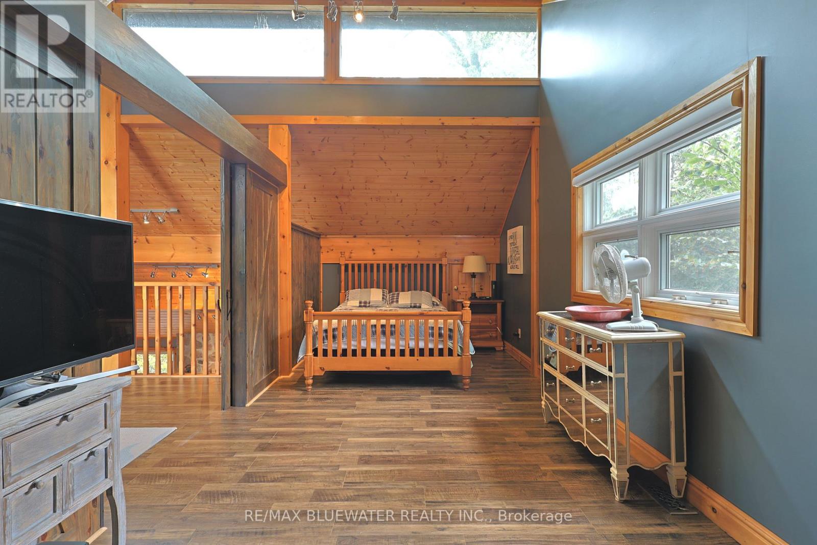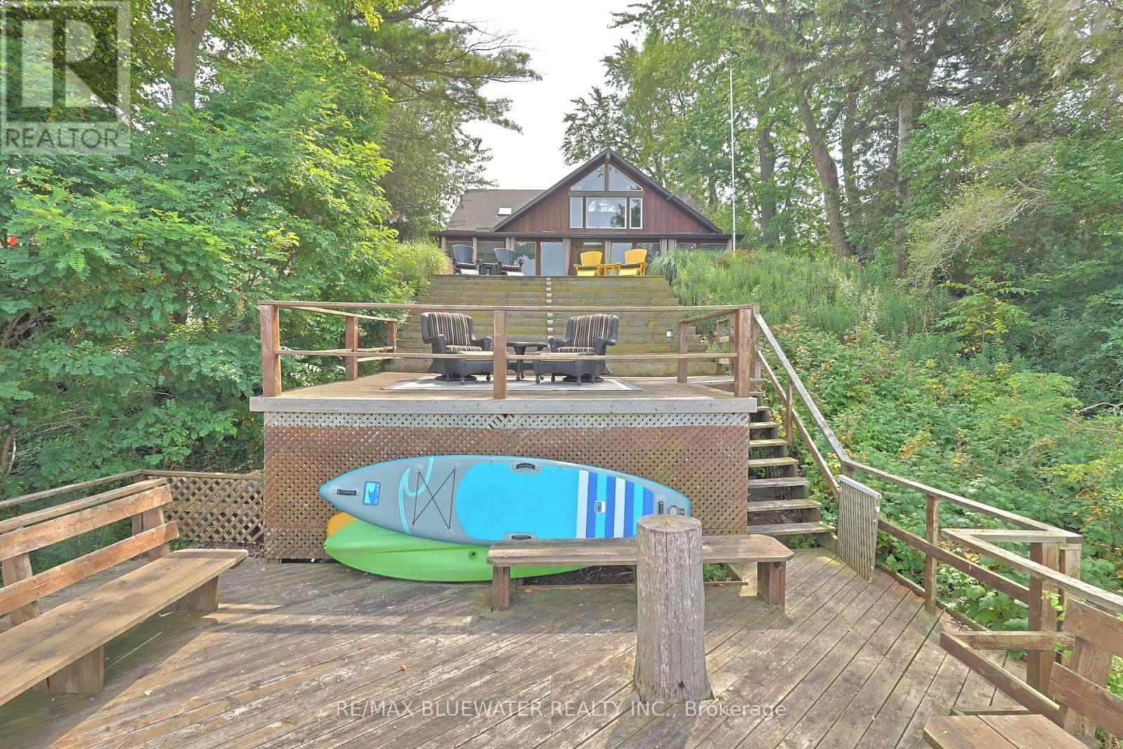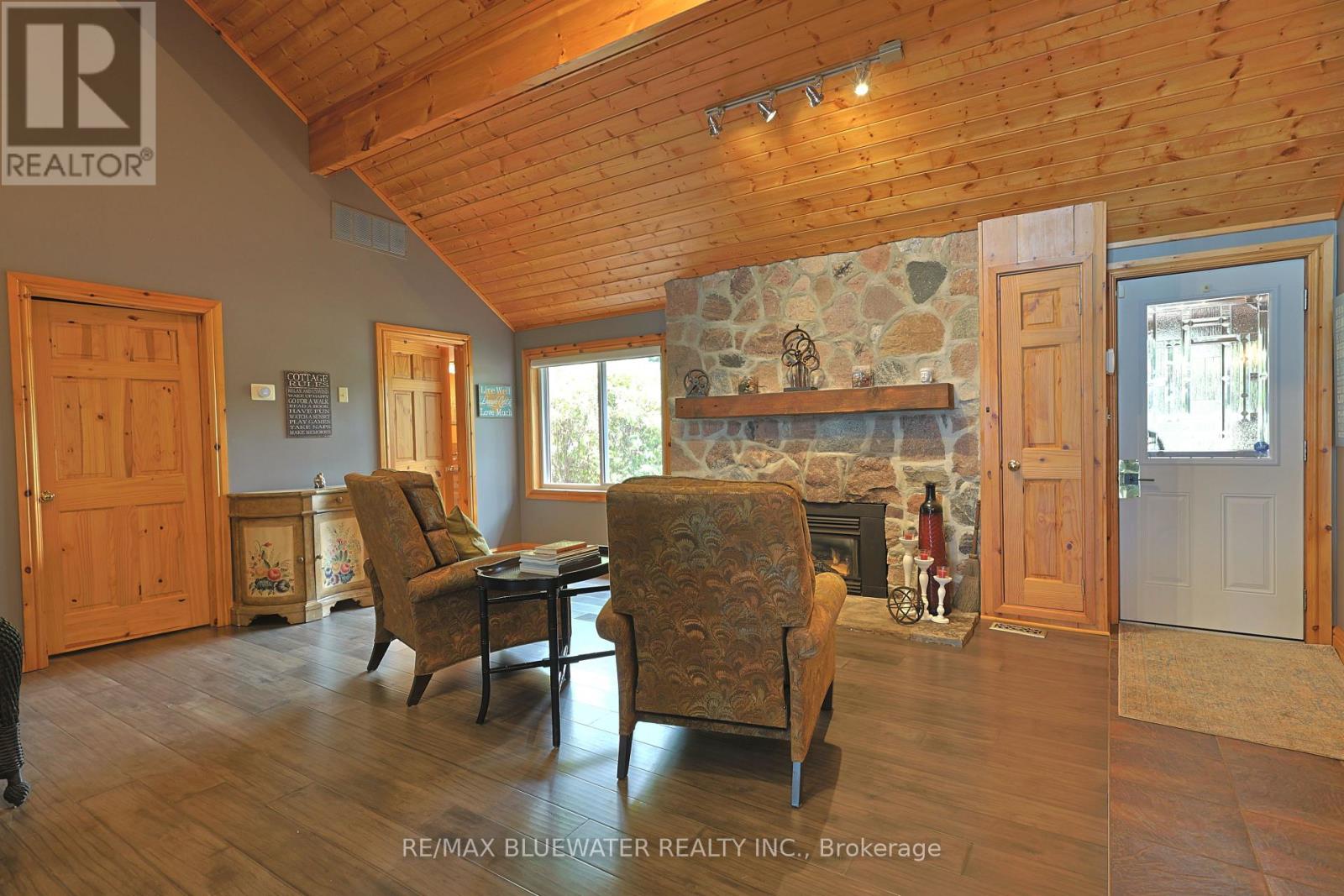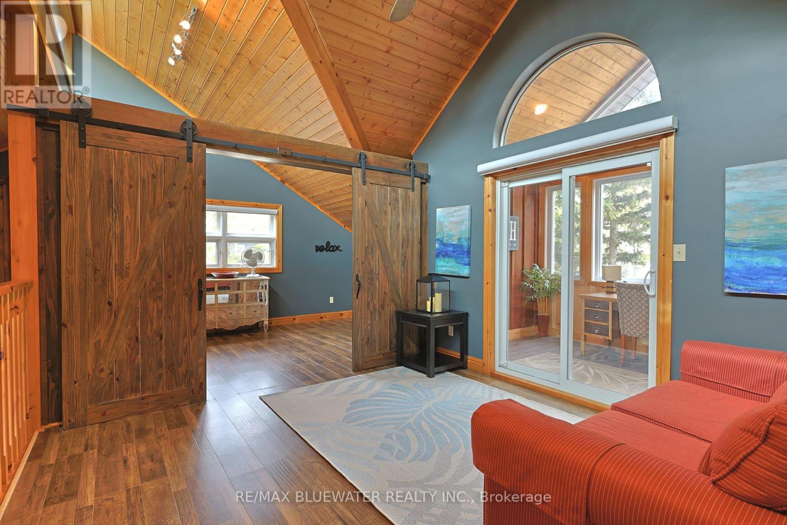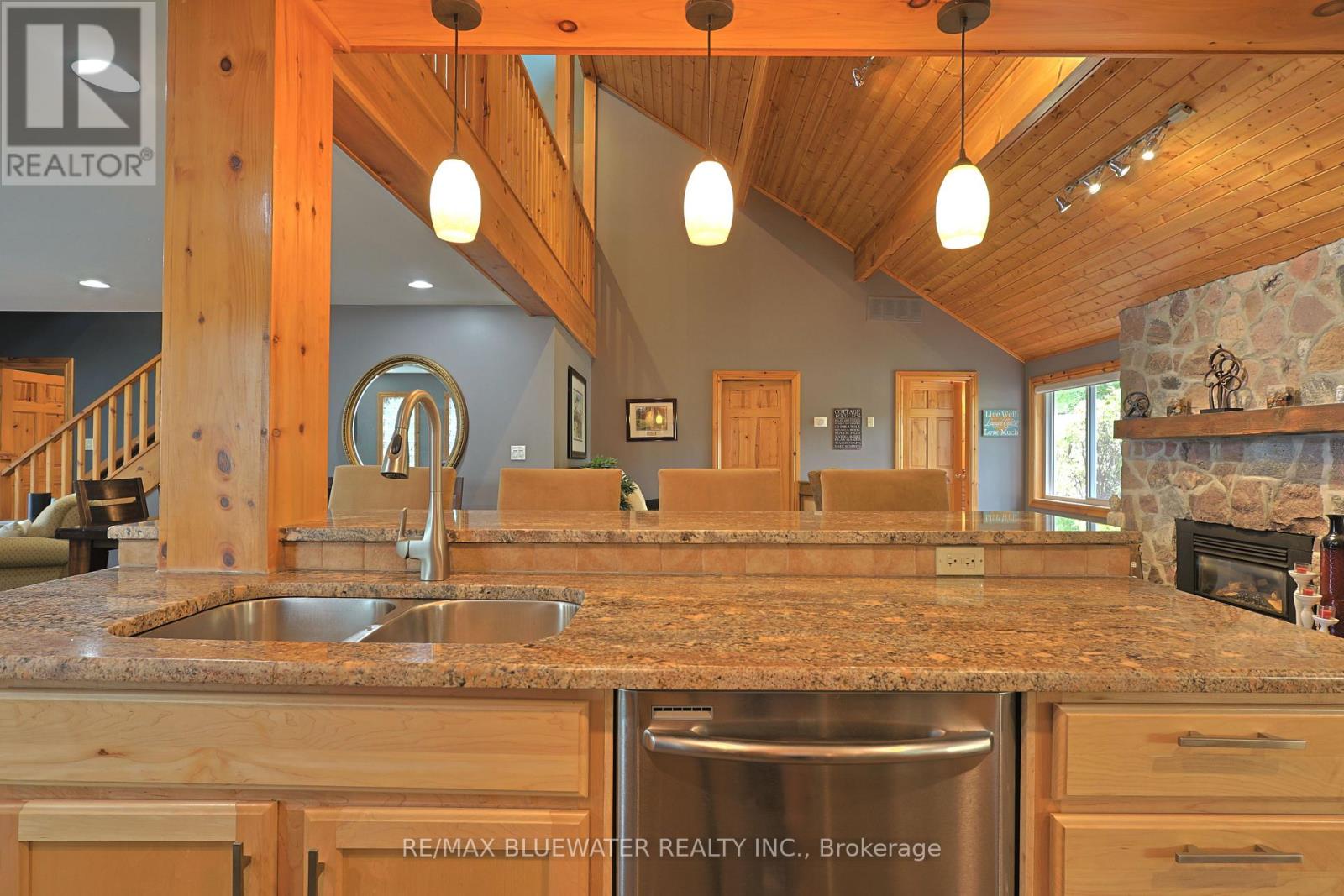 The picture-perfect lakefront retreat just north of Grand Bend! Start checking the boxes off for sandy beaches, panoramic lake views, private setting, spacious updated living space and turnkey with furniture included. Situated in the Highlands III neighborhood this year-round home catches your eye. With the charming log home wood siding finish complimented by the covered front entrance, landscaped gardens, second floor transom windows and stone chimney. On the lakeside its your private oasis with a 400 sqft three season sunroom that transitions you from the inside living space to your back yard. The sunroom is a great screened in space during the day with lexan coverings for colder nights. Large patio space leads to a three-tiered deck down to the sandy beaches of Lake Huron. Inside you have an updated open concept design with engineered hardwood flooring, vaulted knotty pine ceilings and a living space flowing with natural light. Enjoy the panoramic lake views found throughout the home. The kitchen includes stainless steel appliances, wood cabinetry, pantry for storage and granite countertops with eat up island. Living room with large lakeview windows and patio doors leading to the lakeside sunroom. A large eating area is great for entertaining family and the reading space at the front of the home is the perfect spot to get cozy by the gas fireplace. Main floor primary bedroom suite with double closets, full ensuite and lake views. The main floor also includes a second bedroom and additional full bathroom with laundry. Upstairs you have an open loft area that leads to the perfect office space with a large panoramic window overlooking the lake no need for a screen saver with this view. The second floor also includes a third bedroom and space for guests in the guest room. Come enjoy the relaxing days on the beach, the long walks along the sandy shores of Lake Huron, the nightly sunsets over the water and the calming lifestyle of living on the Lake. (id:64974)
