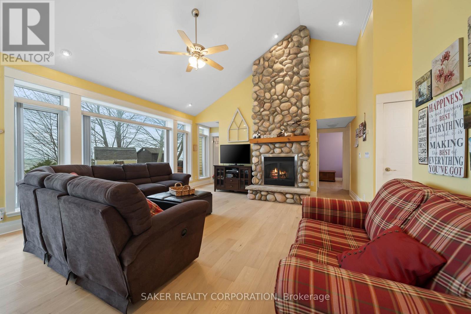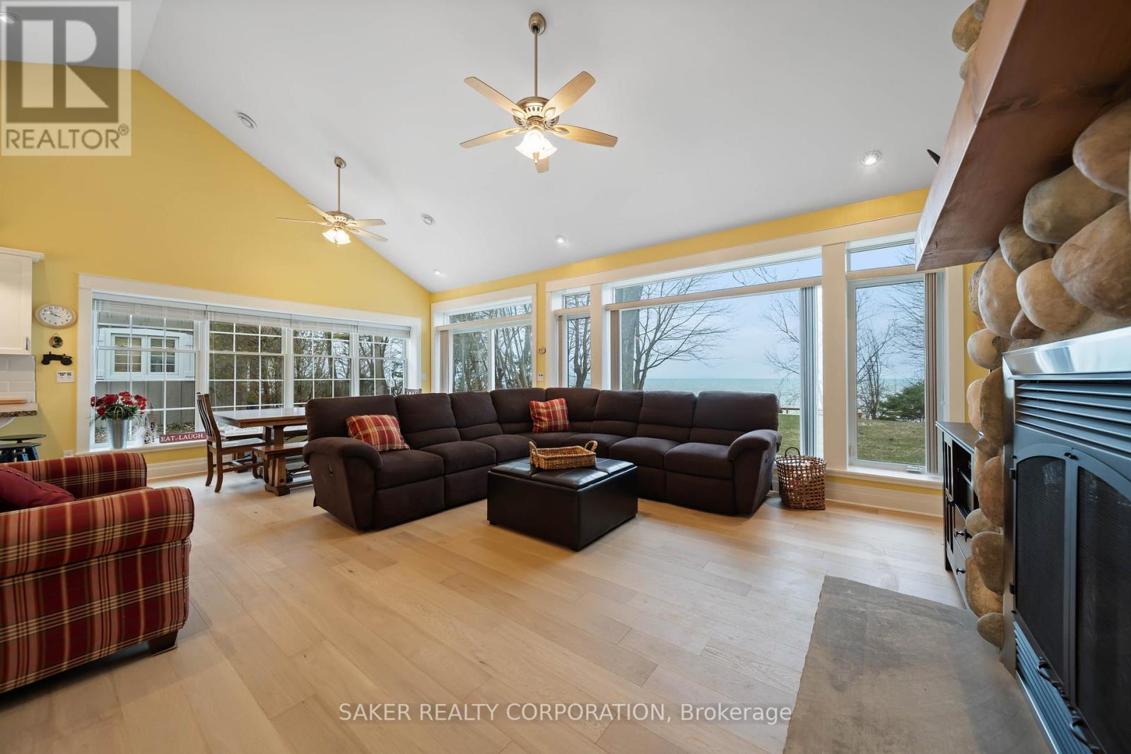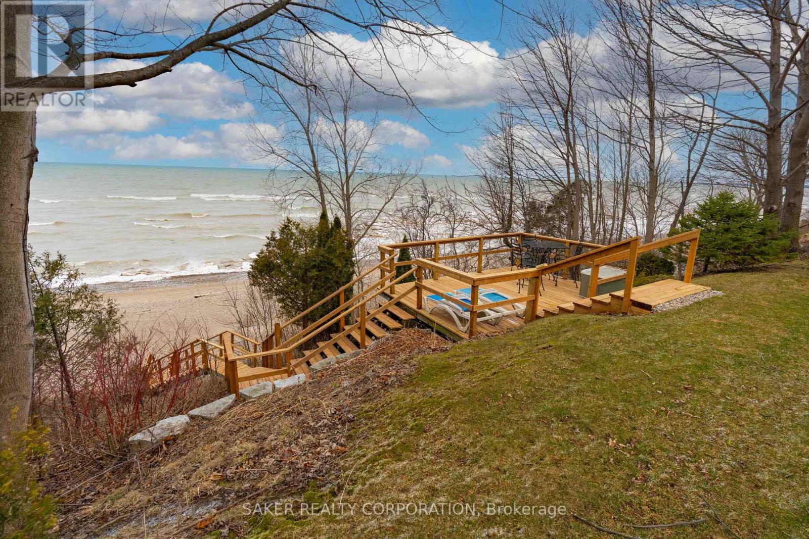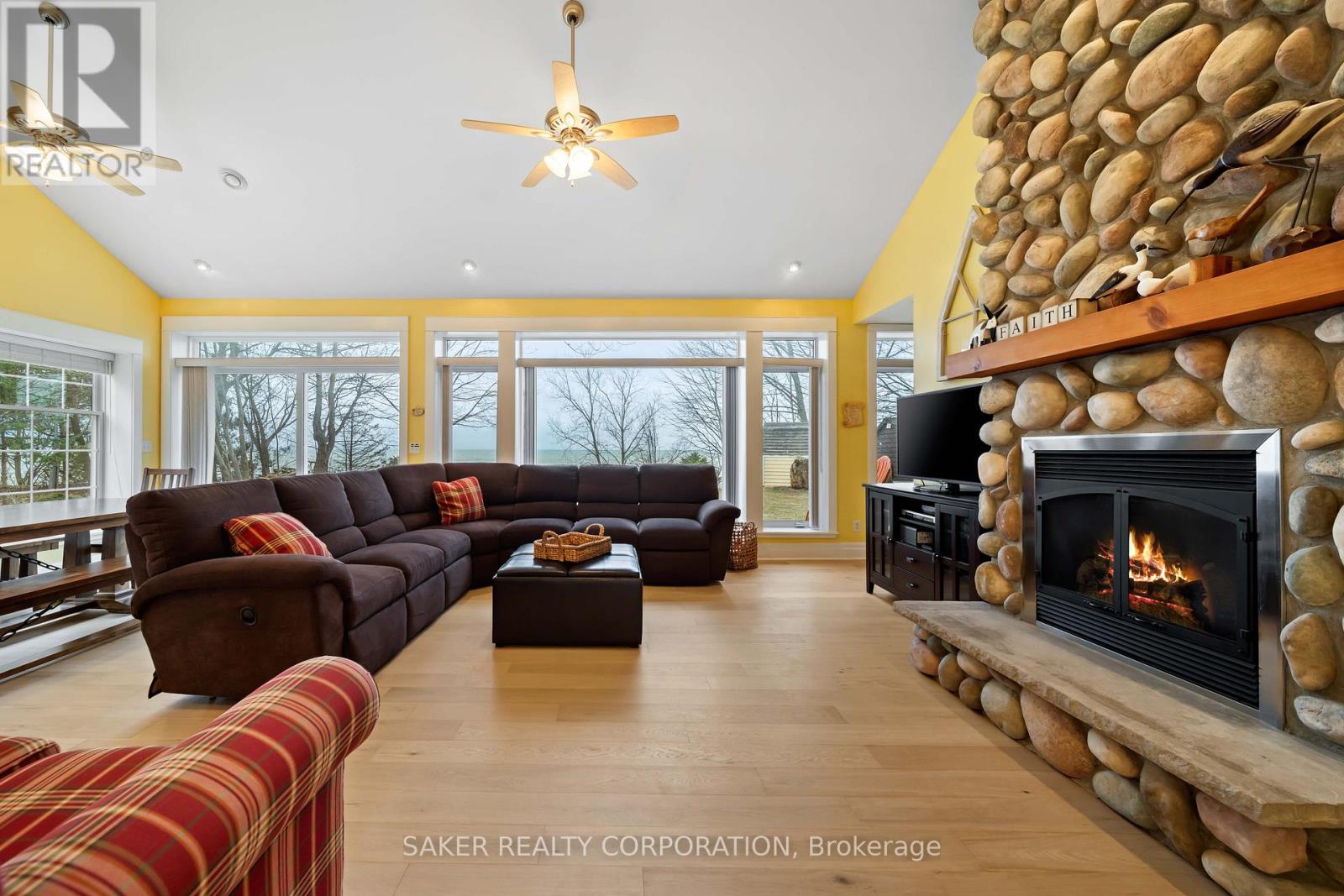 LAKE FRONT Experience with one of the most beautiful beaches on Lake Huron, where silky smooth sand meets shallow, Caribbean-blue waters and just a few steps down the newly reconstructed staircase, 5 minute drive to Grand Bend and is located in the Highland 3 subdivision. This property is protected by a seawall and offers unparalleled views both from the hilltop and the home itself, designed to capture ever-changing scenery and breathtaking sunsets. The private yard is shaded by mature trees, while a pressure-treated staircase leads down to a wide, sandy beach with ample space for kayaks, Seadoos, and more. Inside, the 3-bedroom home features an open-concept layout with floor-to-ceiling windows, all new wide plank Harwood flooring throughout (2026), a striking gas fieldstone fireplace, and unobstructed lake vistas. The master suite occupies its own private second-floor retreat with a luxurious ensuite and sweeping views. Additional highlights include a new roof (2024), generous parking for up to eight vehicles on a concrete laneway, and potential for a double-car garage. perfect for lakeside living at its finest. (id:64974)