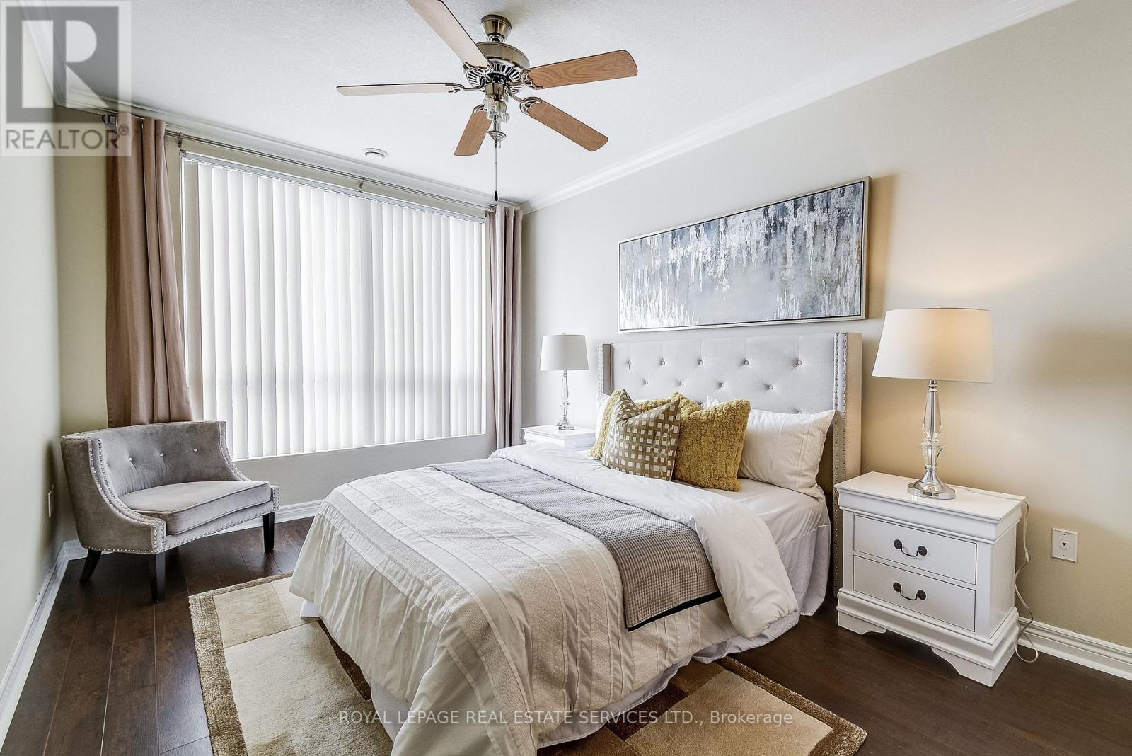 Experience condo living at its best at Millcroft Place.This beautiful south facing unit, with views to the lake, offers 1,146 square feet of living space. When you walk in the door, you are greeted by a spacious foyer. Off the foyer is a walk-in laundry room and a 4-piece main bath.The open-concept layout features a lovely kitchen with granite countertops, tiled backsplash, stainless steel appliances, and a breakfast bar. Beautiful laminate flooring and crown moulding throughout the living and dining areas. The living room offers an electric fireplace and a walkout to the large balcony with views down to the lake. Laminate flooring continues into both bedrooms. The primary bedroom boasts a large walk-in closet and a 3-piece ensuite bathroom with a walk-in shower.Included are 1 underground tandem parking space for 2 cars with EV charger and 1 locker. Millcroft Place offers amenities such as an exercise room, workshop, and party room with a kitchen, pool table, and TV. A live-in superintendent ensures prompt assistance.Pets are welcome (1 dog and 1 cat, up to 25 lbs each). (id:64974)