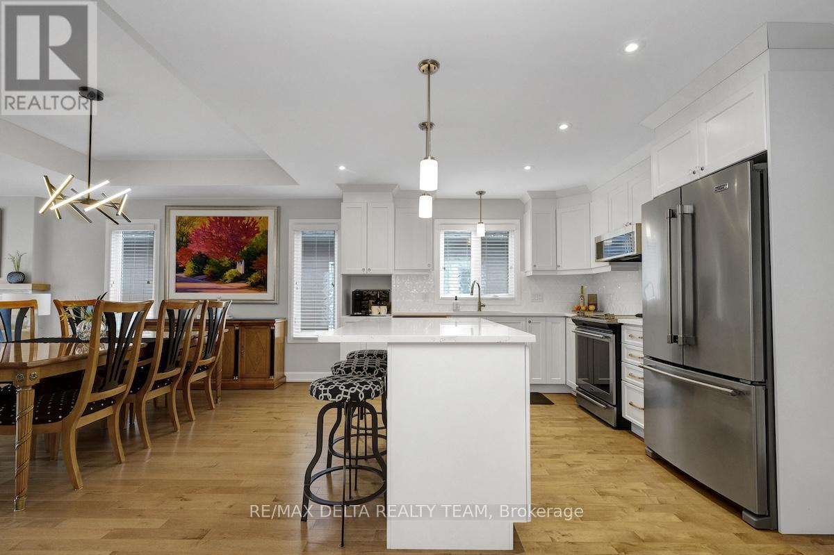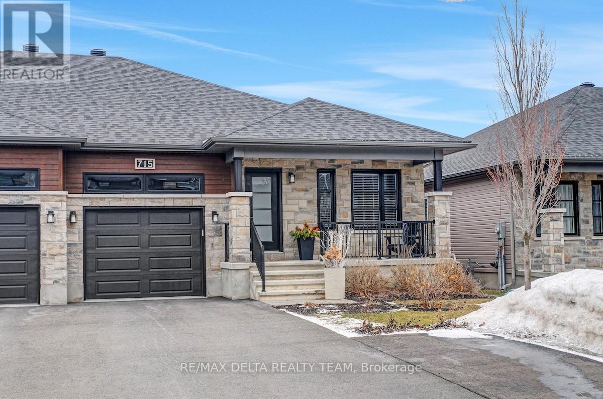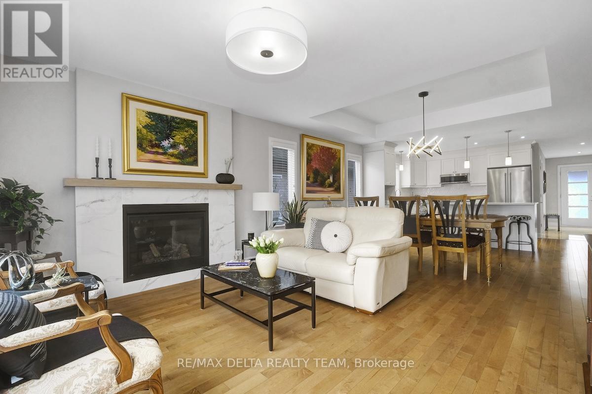 Prepare to fall in love! Stunning and modern semi-detached bungalow in the desirable community of Sunset Flats in Russell, just minutes to amenities, top-rated schools, steps away from the New York Central Fitness Trail, surrounded by walking and biking paths ! Built in 2020 by Melanie Construction (Cambrai I option B model, floor plan in attachments), this spacious bungalow is filled with natural light and boasts a functional layout throughout and it is loaded with quality builder upgrades (over $55,000 in upgrades, which included a REDESIGNED main floor plan). Gorgeous open concept main level with gleaming hardwood flooring and smooth ceilings, that boasts a large entrance with porcelain tiles, a dining room with coffered ceilings, a spacious family room with large natural gas fireplace, a stunning kitchen with tons of cabinets and quartz counter space, upgraded backsplash, an oversized centre island, ideal for family gatherings. Also equipped with stainless steel appliances and a coffee station. Spacious primary bedroom on main level with a large 3 pc ensuite bath. The other main floor bedroom (currently used as office and music room) is also generous in size with a large window that sunlight bathes the room creating a bright, warm and inviting space. There is also a 3 pc modern full bath on the main level, as well as main floor laundry with lots of shelving for added convenience. Fully finished basement (by the builder) has quality laminate flooring, smooth ceilings and it is equipped with a large rec room with bar sink, 1 additional spacious bedroom and a large 3 piece bathroom, plus tons and tons of storage space. Fully fenced landscaped backyard with stone walkways and private sitting area is perfect for entertaining. Oversized 1 car garage and driveway with an additional parking space. Book your showing now! (id:64974)
