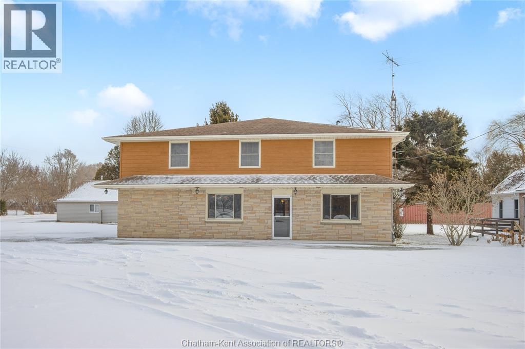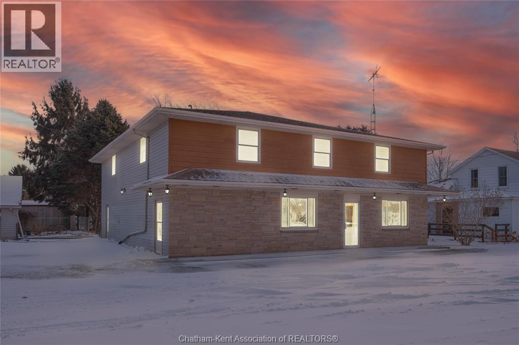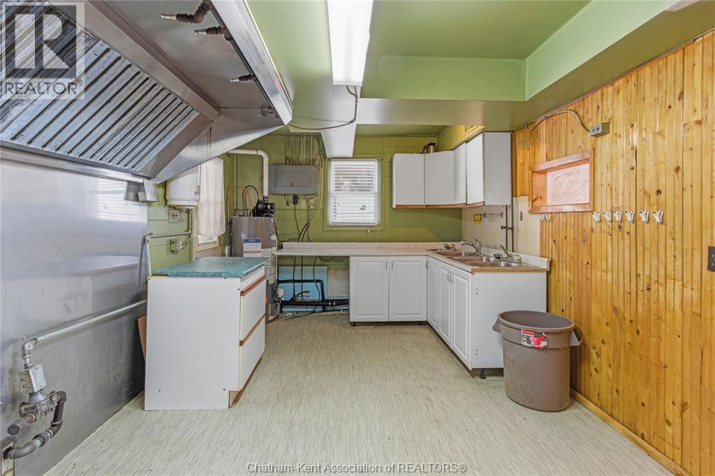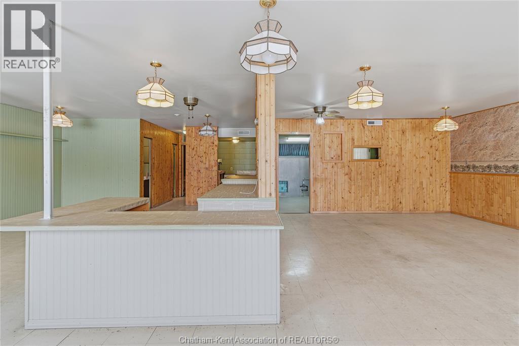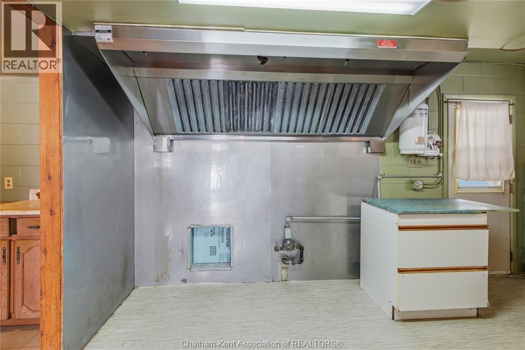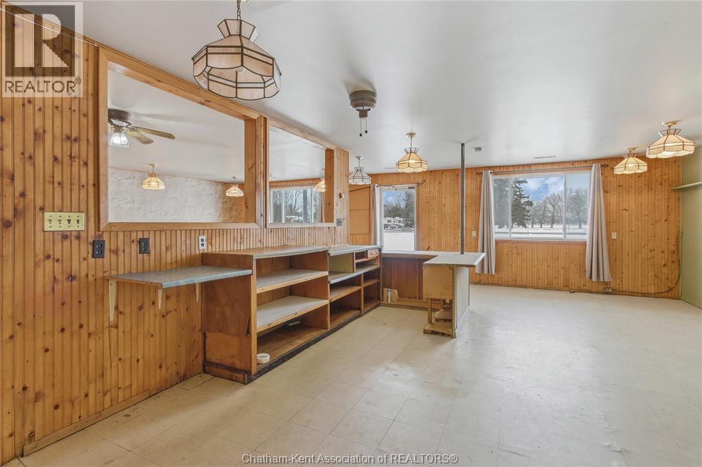Versatile live/work/investment opportunity in the heart of Dealtown, ideally located on Talbot Trail just minutes from Lake Erie and within an easy commute to Chatham. This high-visibility corner lot offers excellent exposure along with ample on-site parking. The expansive main floor commercial space, previously operated as a restaurant and variety store, features a functional layout with generous square footage, two 2-piece bathrooms, a commercial range hood, and the flexibility to re-establish a food service operation or adapt the space for a wide range of potential uses, subject to approvals. Upstairs, the bright and well-thought-out residential unit offers two bedrooms and two full bathrooms, including a spacious primary suite with walk-in closet and private ensuite, along with in-unit laundry, a warm wood kitchen, beautiful natural wood finishes throughout, a cozy gas fireplace, and a separate bar room ideal for entertaining. Enjoy stunning Lake Erie views from the enclosed rear porch, providing the perfect setting for morning coffee or evening relaxation. A heated, detached 2.5-car garage adds further value with options for additional parking, storage, or workshop space, making this a rare and flexible opportunity for entrepreneurs, investors, or those seeking a unique mixed-use property. Conveniently located near the Lake Erie waterfront and within easy reach of Chatham, the property may also be purchased on its own or together with the neighbouring residential property (MLS® #26001429). (id:64974)