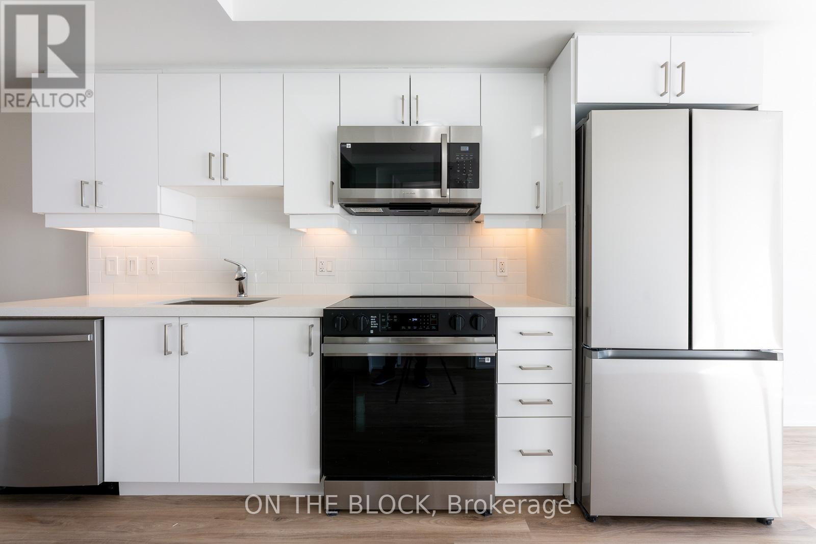 Welcome home to this bright, modern residence featuring an open-concept layout, contemporary finishes, and abundant natural light throughout. The sleek kitchen offers stainless steel appliances, quartz countertops, white cabinetry, and a subway tile backsplash, seamlessly flowing into the airy living space. Enjoy in-suite laundry, a spa-inspired bathroom, and a spacious bedroom with mirrored closet. Step out onto your private balcony to relax and unwind. Move-in ready and ideal for stylish, low-maintenance urban living. (id:64974)