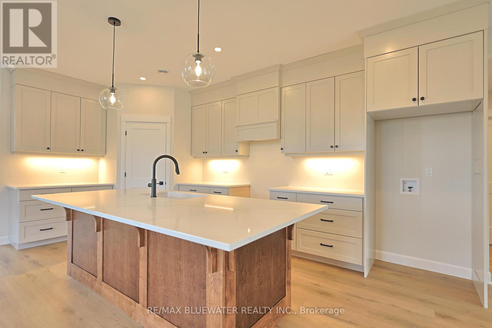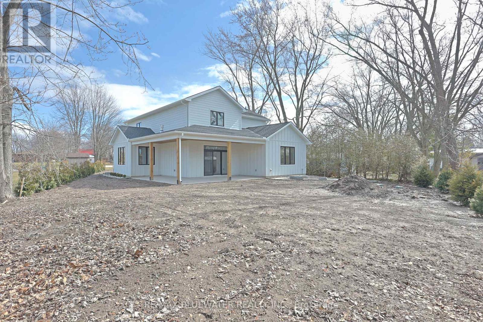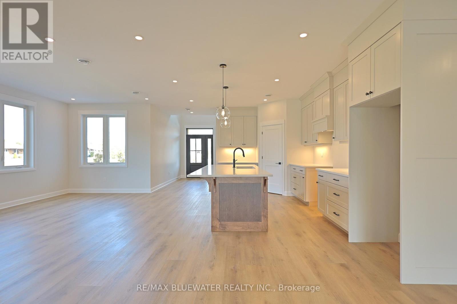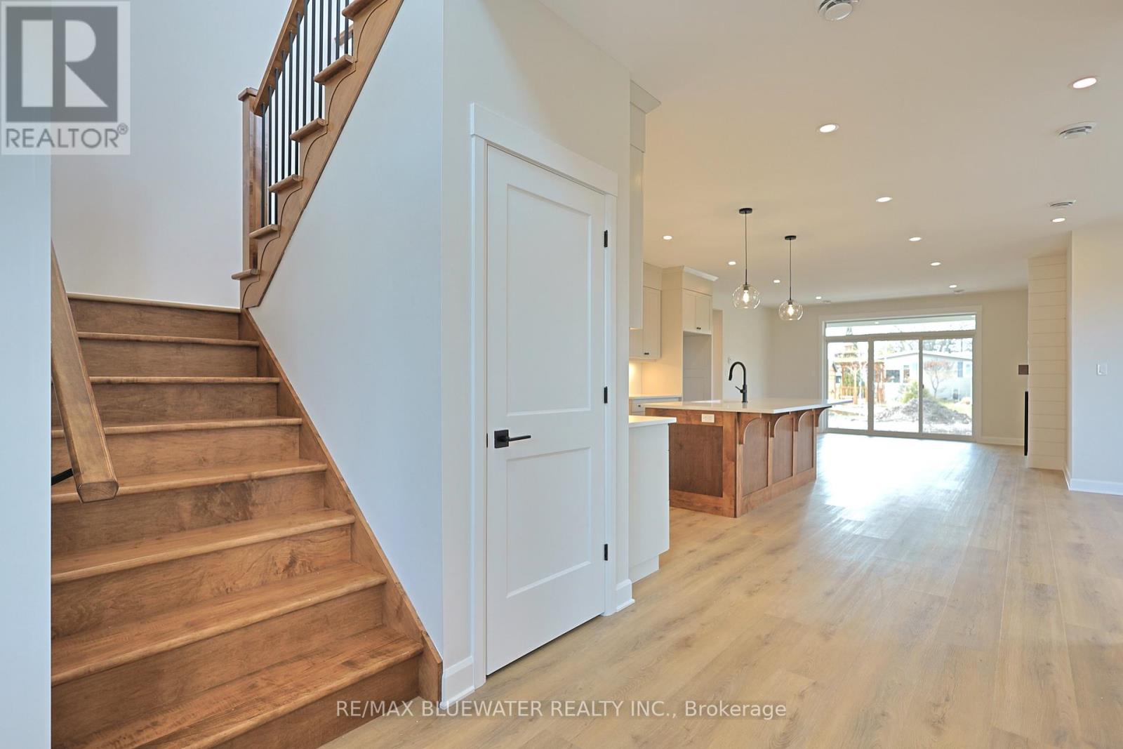 Are you searching for a lakeside property but nothing checks all the boxes? Take a look at this NEW BUILD home by Steeper Construction. Just steps to the beach, new construction, Tarion warranty, modern finishes, open concept design, covered front and back patio, low maintenance exterior and attached oversized garage. Located just north of Grand Bend at Bayview Subdivision this home is just steps to Lake Huron, the community playground and only 800 meters to the White Squirrel Golf Course. The exterior features hardie board siding with a board and batten finish on the main level complimented with horizontal siding on the upper level. Covered front entry with sitting area and a gravel walkway with landscaped gardens welcomes you to the property. Inside, the main floor features an open concept design with pot lighting, luxury vinyl plank flooring and a floor plan flowing with natural light. Two level foyer provides an entrance area that feels spacious. The kitchen features custom maple cabinetry with quartz countertops, island with contrasting wood finish and corner pantry. Spacious eating areas allows lots of room for friends and family to gather. Living room includes a gas insert fireplace on a white ship lap feature wall with patio doors leading to the covered patio. Main floor primary bedroom suite with walk in closet and access to the main floor bathroom, complete with tile shower walls and quartz countertops. Mudroom off the garage entrance with built in cubbies for organized storage above the bench seating for convenience. Bonus main floor laundry in the utility room with forced air gas furnace, on demand hot water heater and central air. Additional living space on the second level with a large family room, two additional bedrooms for guests or the kids and a full bathroom. Enjoy the back yard space of the large lot, Gas hookup so the BBQ is always ready to go and entertaining on the large covered concrete patio complete with wood ceiling and pot lighting. (id:64974)