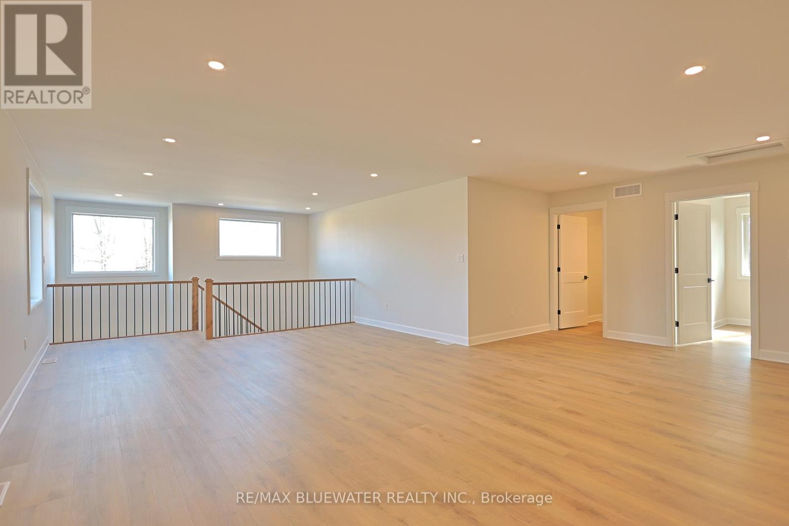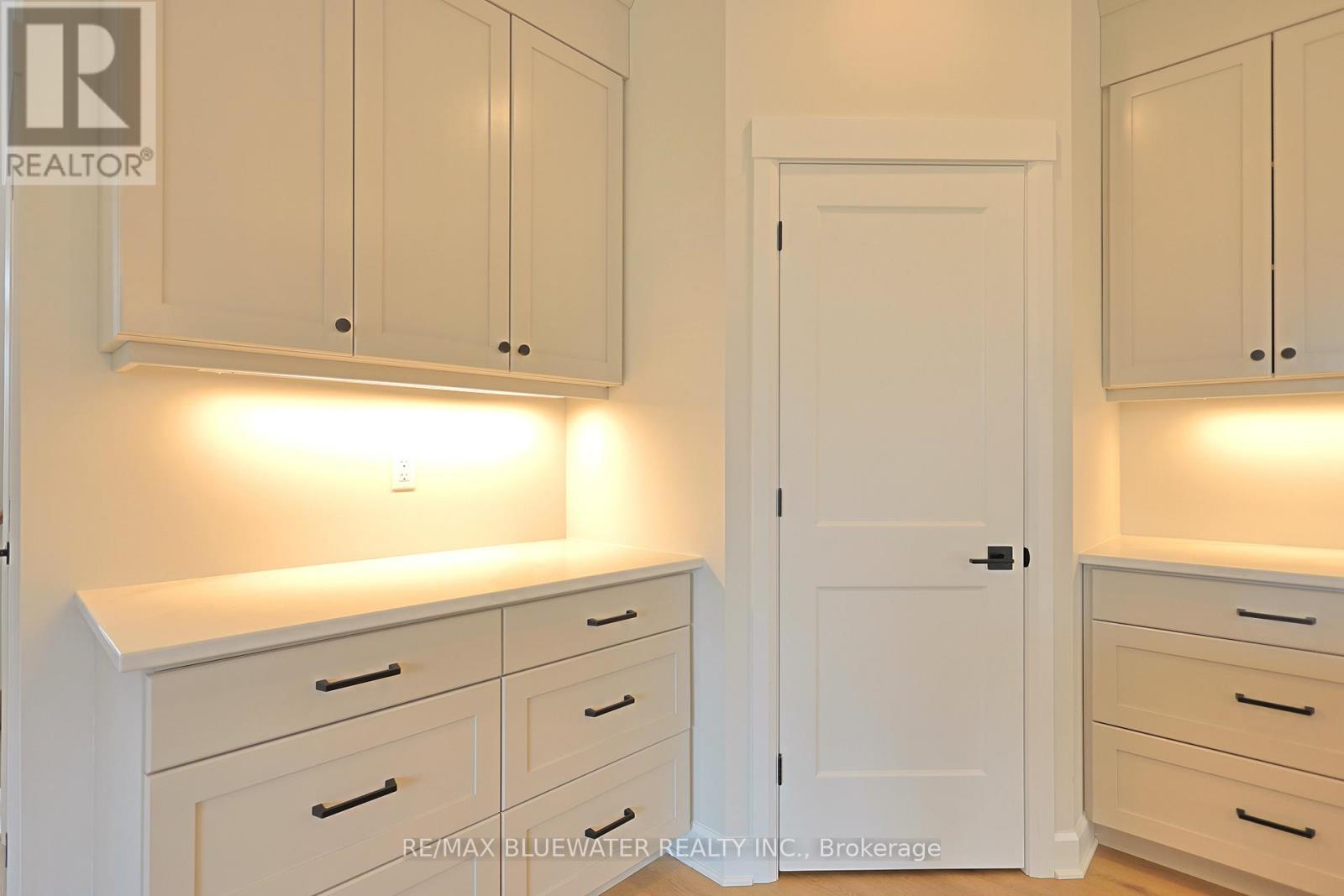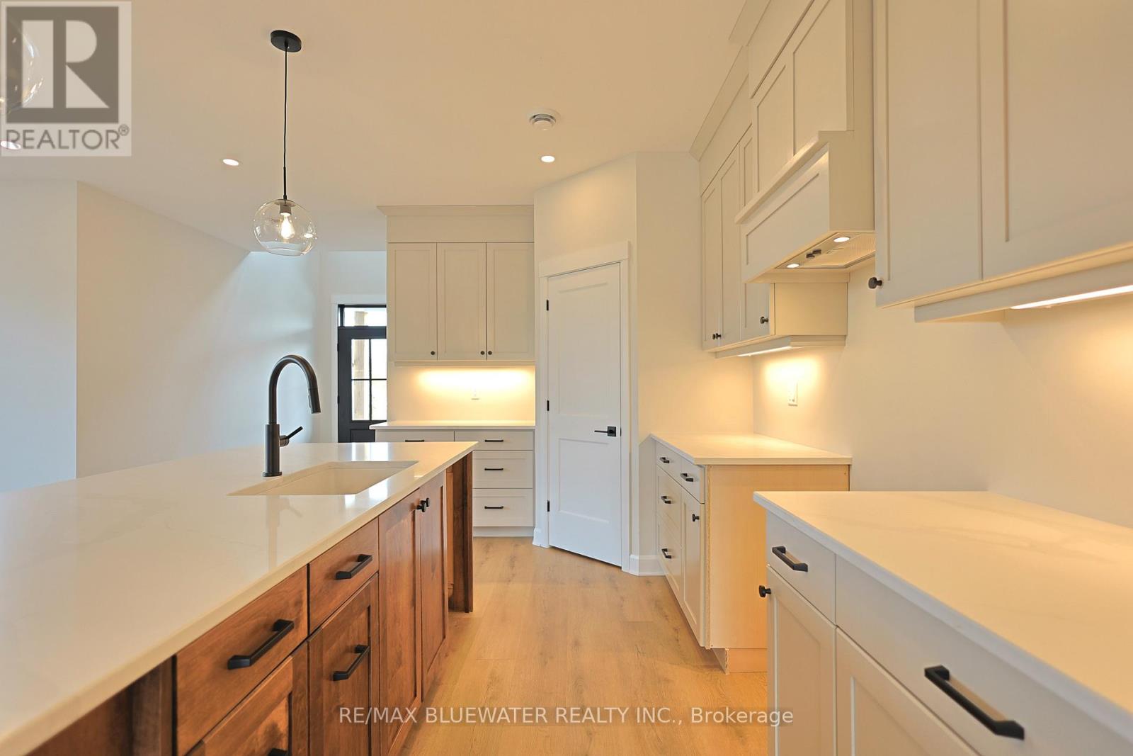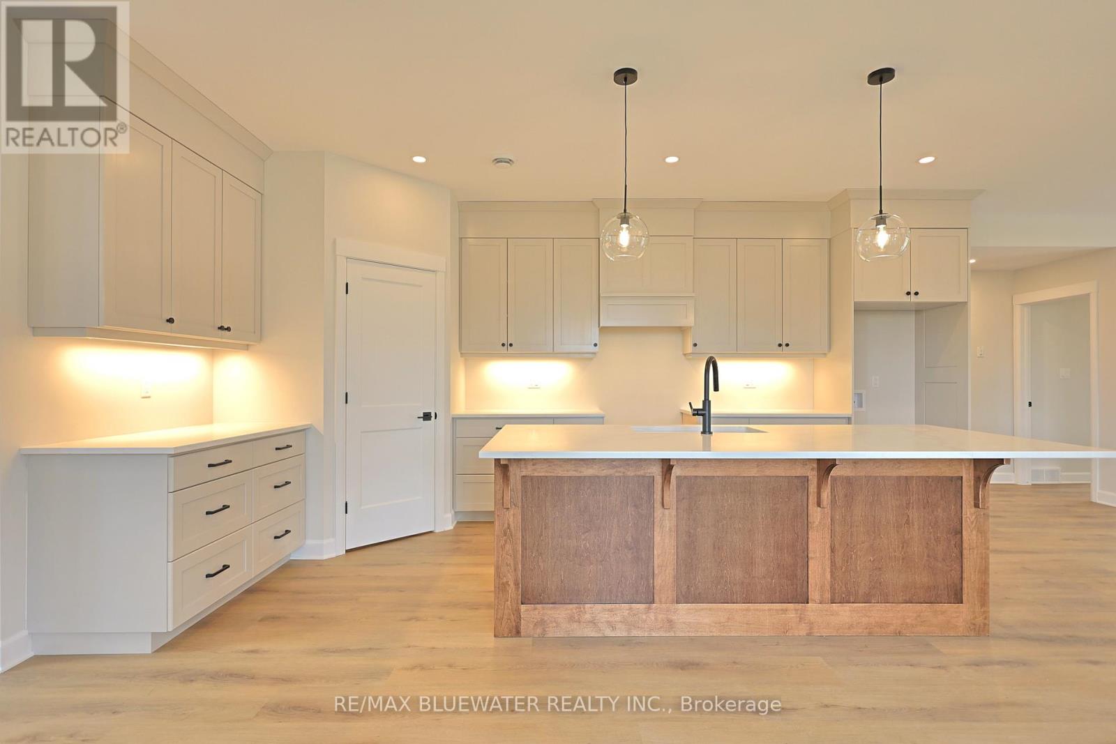 Are you searching for a lakeside property but nothing checks all the boxes? Take a look at this NEW BUILD home by Steeper Construction. Just steps to the beach, new construction, Tarion warranty, modern finishes, open concept design, covered front and back patio, low maintenance exterior and attached oversized garage. Located just north of Grand Bend at Bayview Subdivision this home is just steps to Lake Huron, the community playground and only 800 meters to the White Squirrel Golf Course. The exterior features hardie board siding with a board and batten finish on the main level complimented with horizontal siding on the upper level. Covered front entry with sitting area and a gravel walkway with landscaped gardens welcomes you to the property. Inside, the main floor features an open concept design with pot lighting, luxury vinyl plank flooring and a floor plan flowing with natural light. Two level foyer provides an entrance area that feels spacious. The kitchen features custom maple cabinetry with quartz countertops, island with contrasting wood finish and corner pantry. Spacious eating areas allows lots of room for friends and family to gather. Living room includes a gas insert fireplace on a white ship lap feature wall with patio doors leading to the covered patio. Main floor primary bedroom suite with walk in closet and access to the main floor bathroom, complete with tile shower walls and quartz countertops. Mudroom off the garage entrance with built in cubbies for organized storage above the bench seating for convenience. Bonus main floor laundry in the utility room with forced air gas furnace, on demand hot water heater and central air. Additional living space on the second level with a large family room, two additional bedrooms for guests or the kids and a full bathroom. Enjoy the back yard space of the large lot, Gas hookup so the BBQ is always ready to go and entertaining on the large covered concrete patio complete with wood ceiling and pot lighting. (id:64974)