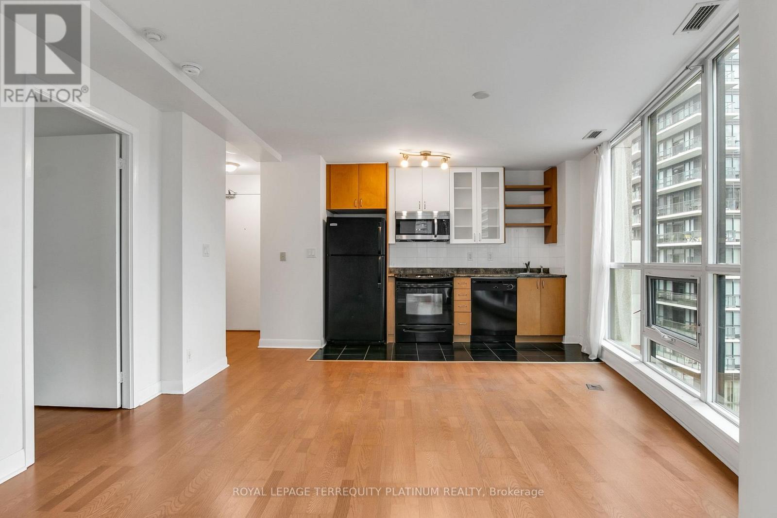 It's time to make your new year's resolution of moving downtown happen! This total package is located in downtown Toronto's thriving waterfront neighbourhood, steps to the lake, park, running trails, dog park, TTC at your door, Billy Bishop Airport, Loblaws, LCBO, King West bars/ clubs/restaurants,local dining/cafes and so much more. This 1-bedroom corner suite at the end of the hall offers a functional open-concept layout with large northeast-facing windows overlooking the building's quiet courtyard. No wasted space! Wood floors run throughout, and the living area opens to a balcony for a breath of air any time of day. Residents enjoy some of the best amenities in the neighbourhood, including a 24-hour concierge, indoor pool and hot tub, a fully equipped gym, a rooftop terrace with BBQs, ample visitor parking, and a stylish party room with kitchen and bar. Owned locker for convenient storage of larger items, and the bonus is the owned parking space so you can take a drive with easy access to the Gardiner, getting you in and out of the downtown core efficiently. GO Train access at Exhibition Station is also a walkable, convenient option. Note that some images are virtually staged. (id:64974)