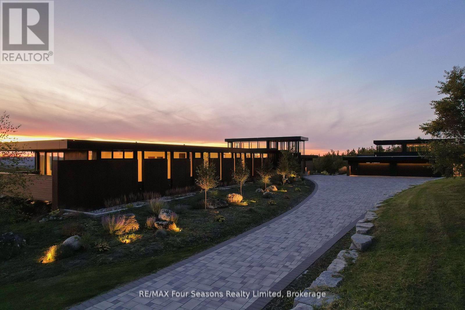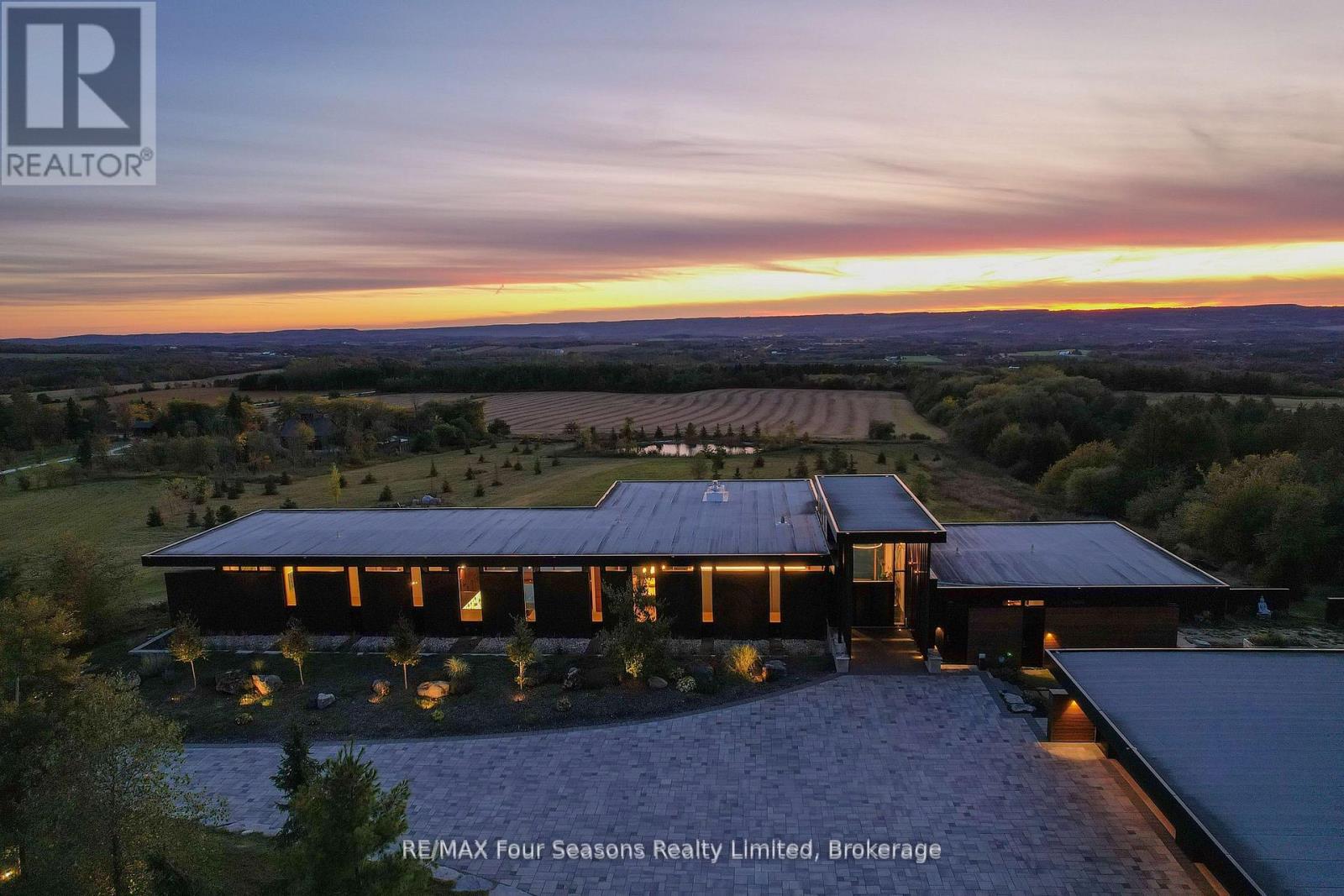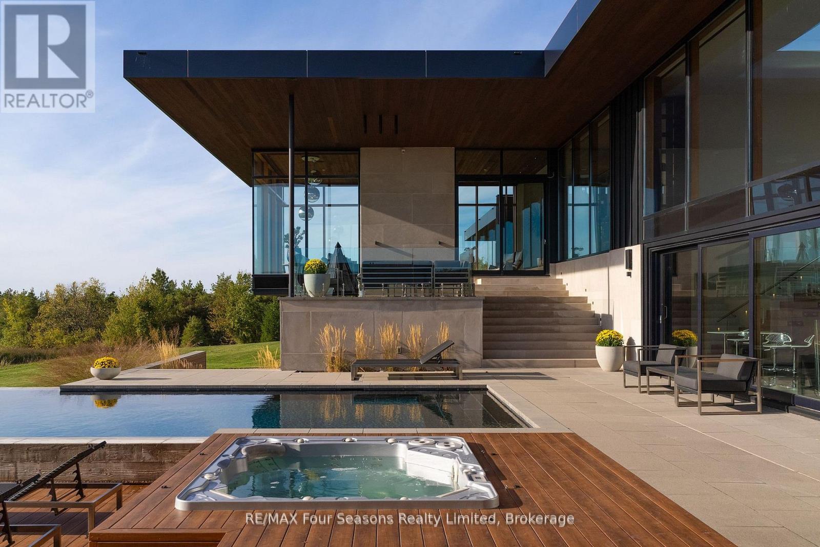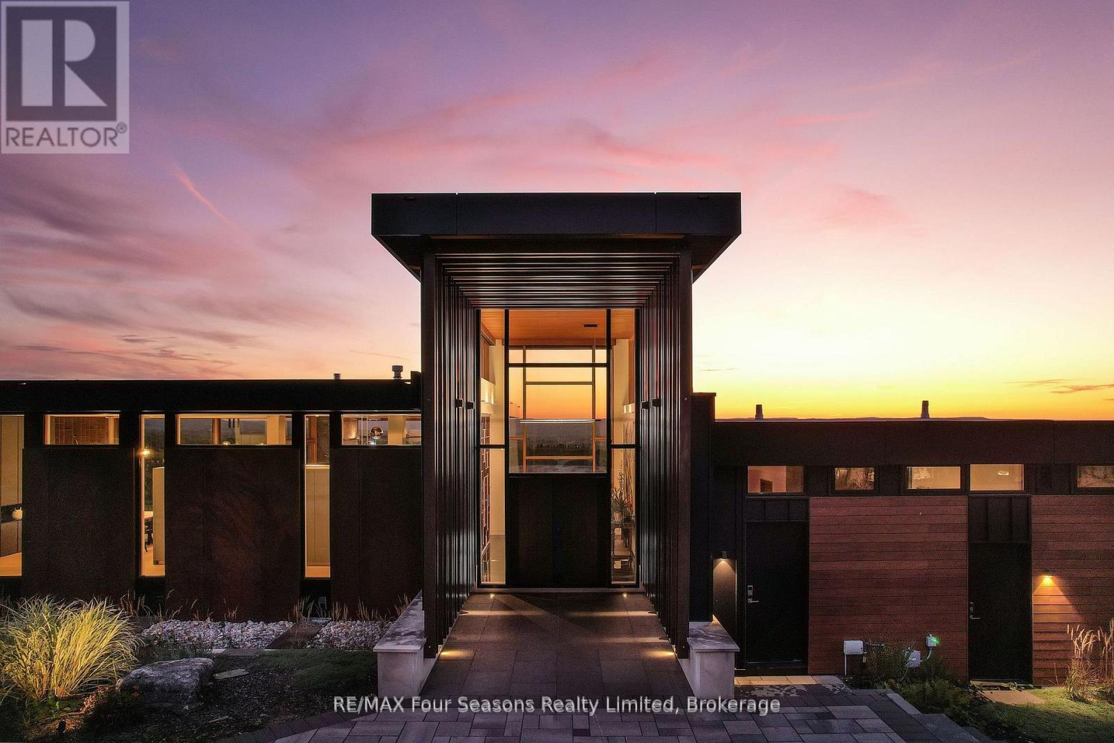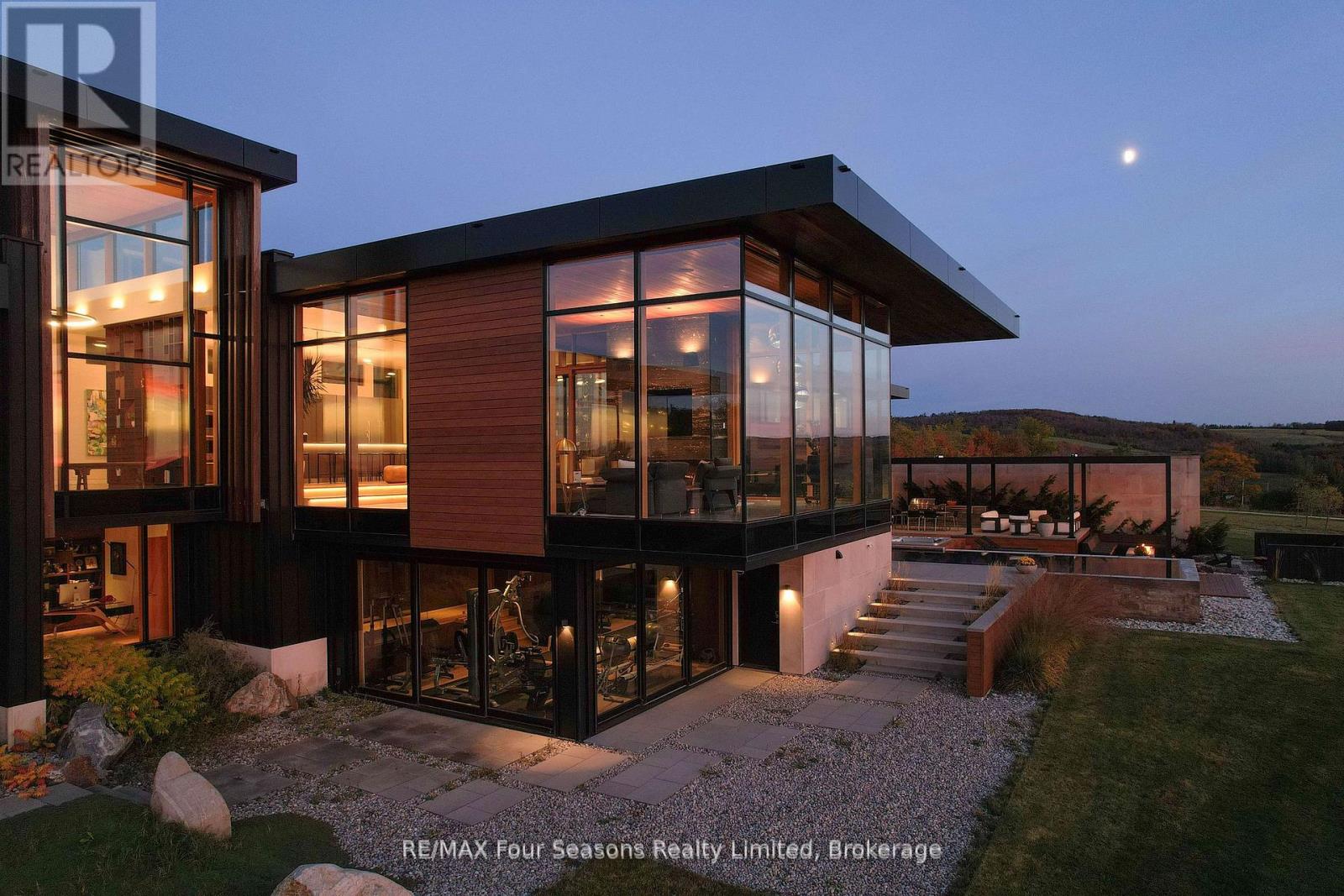 Majestically positioned upon eighty pristine acres within Clarksburg's most distinguished countryside enclave, this Frank Lloyd Wright-inspired architectural tour de force represents the pinnacle of luxury residential design. Approached through monitored gates and a winding driveway, this extraordinary five-bedroom, seven-bathroom estate exemplifies uncompromising craftsmanship, where the masterful fusion of Corten steel, cedar, and metallic exterior elements creates a striking modern silhouette set against a magnificent natural backdrop, enhanced by dramatic landscape lighting that elevates the estate's grandeur through twilight hours. The palatial interior reveals soaring eighteen-foot ceilings and resplendent marble floors, culminating in an open-concept masterpiece with polished concrete flooring and 12.5 ft. floor-to-ceiling windows framing the serene landscape. The Varenna Poliform kitchen impresses with a 20.5 ft. island, Sub-Zero and Wolf appliances, 11 ft. ceilings, and bespoke walnut cabinetry that flows with architectural harmony throughout. The lavish two-storey primary suite offers polished plaster walls, custom walnut built-ins, a marble ensuite with chronotherapy rain shower, and a private retreat lounge. Additional bedrooms include terraces or balconies, with two guest suites offering luxurious ensuites-one serving as a secondary primary with service bar. Entertainment abounds with a professional theatre, custom gym, and stunning two-storey lounge bar overlooking a 22 ft. infinity pool. A heated five-car garage and radiant flooring ensure year-round comfort. A separate two-storey guest house includes a full kitchen, loft bedroom, and soaring ceilings. A pristine barn provides premium equestrian facilities. Landscaped grounds feature a fire pit, hot tub, and pergola, all enhanced by elegant lighting. With Loree Forest nearby and a Generac generator, this estate blends architectural brilliance with modern sophistication. (id:64974)