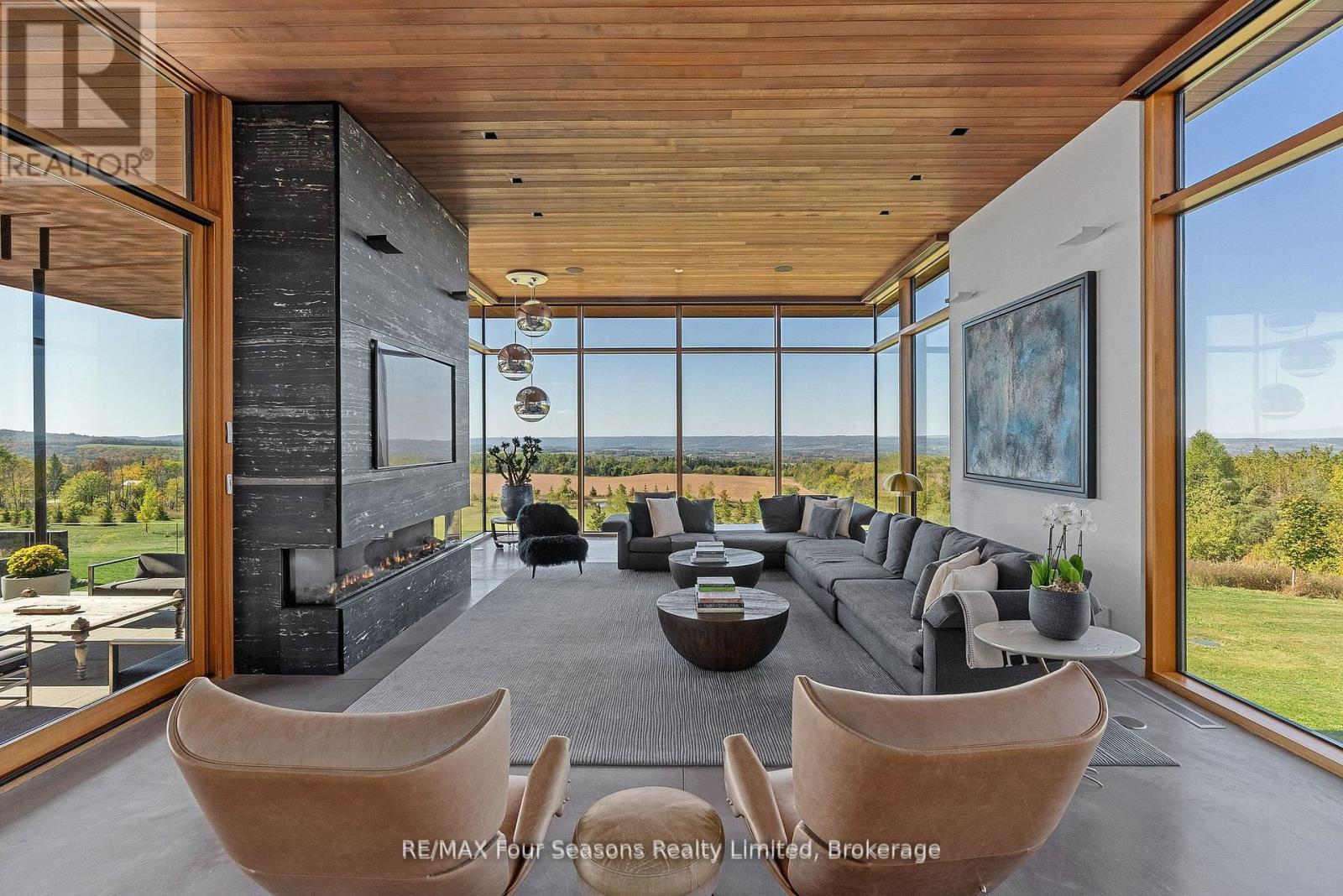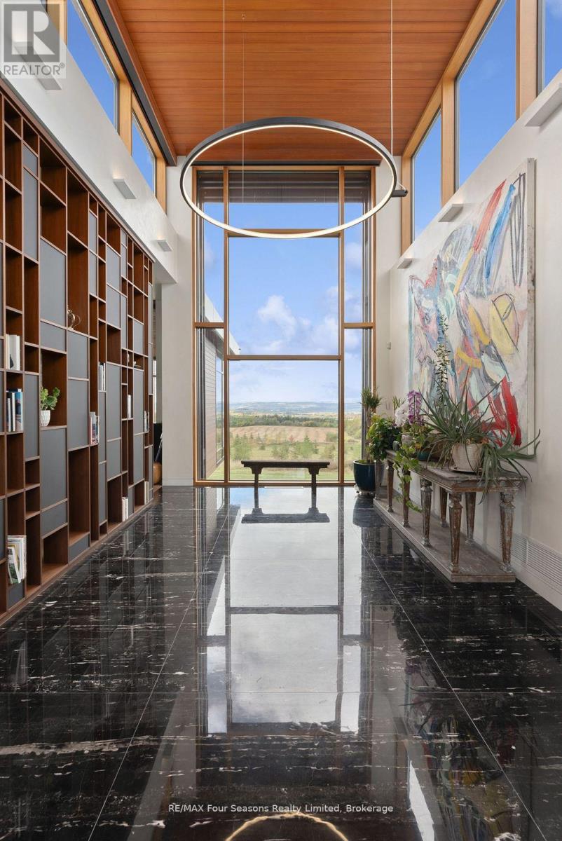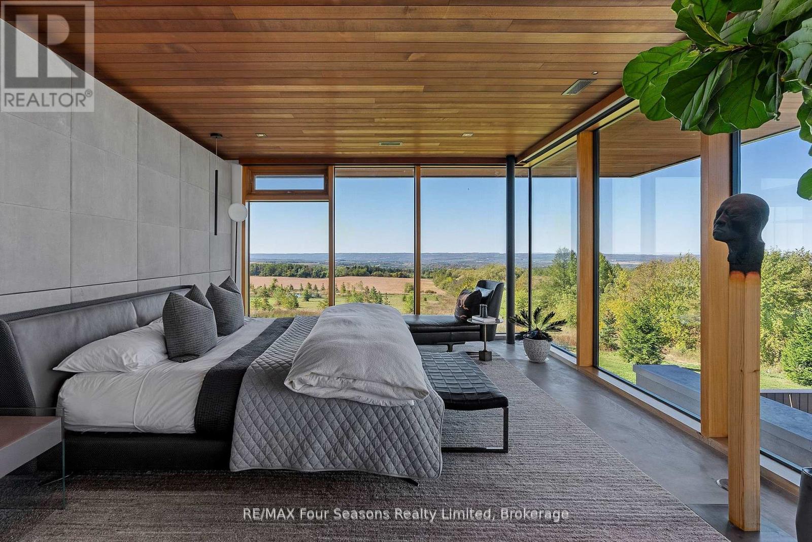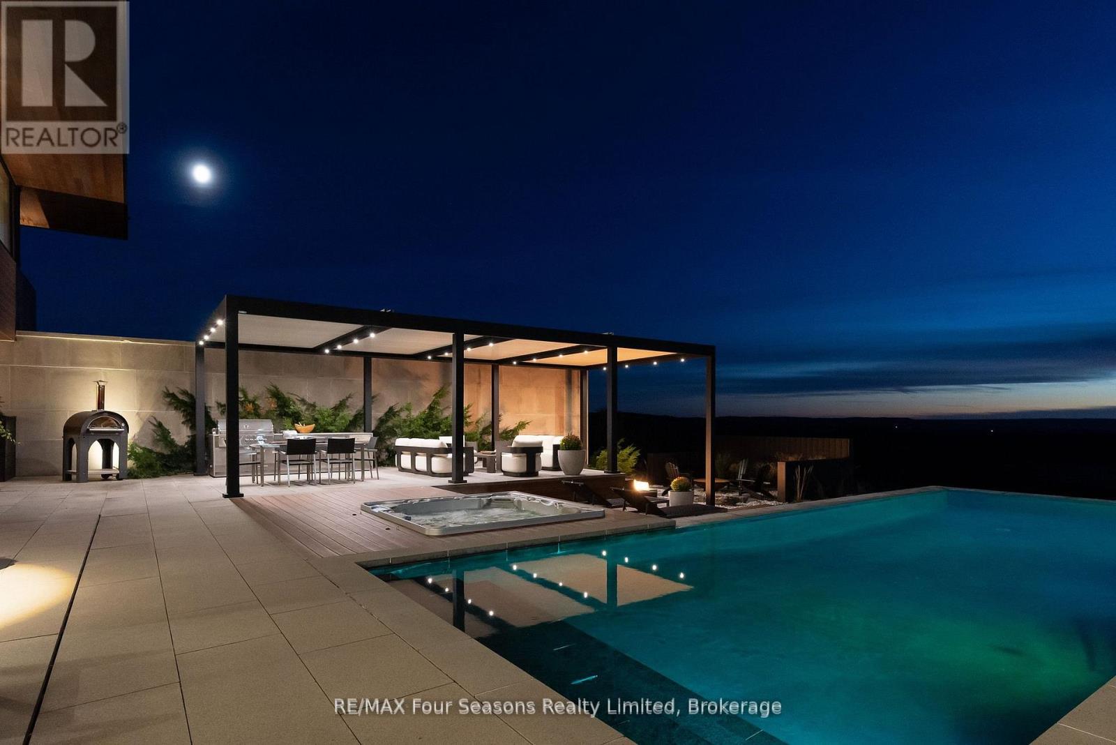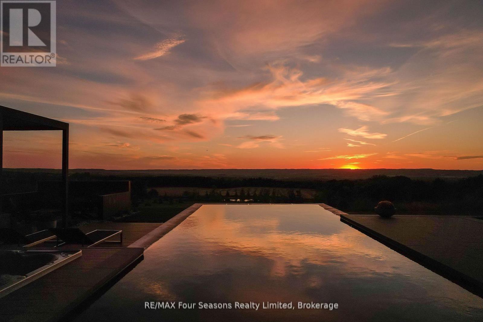 Majestically positioned upon eighty pristine acres within Clarksburg's most distinguished countryside enclave, this Frank Lloyd Wright-inspired architectural tour de force represents the pinnacle of luxury residential design. Approached through monitored gates and a winding driveway, this extraordinary five-bedroom, seven-bathroom estate exemplifies uncompromising craftsmanship, where the masterful fusion of Corten steel, cedar, and metallic exterior elements creates a striking modern silhouette set against a magnificent natural backdrop, enhanced by dramatic landscape lighting that elevates the estate's grandeur through twilight hours. The palatial interior reveals soaring eighteen-foot ceilings and resplendent marble floors, culminating in an open-concept masterpiece with polished concrete flooring and 12.5 ft. floor-to-ceiling windows framing the serene landscape. The Varenna Poliform kitchen impresses with a 20.5 ft. island, Sub-Zero and Wolf appliances, 11 ft. ceilings, and bespoke walnut cabinetry that flows with architectural harmony throughout. The lavish two-storey primary suite offers polished plaster walls, custom walnut built-ins, a marble ensuite with chronotherapy rain shower, and a private retreat lounge. Additional bedrooms include terraces or balconies, with two guest suites offering luxurious ensuites-one serving as a secondary primary with service bar. Entertainment abounds with a professional theatre, custom gym, and stunning two-storey lounge bar overlooking a 22 ft. infinity pool. A heated five-car garage and radiant flooring ensure year-round comfort. A separate two-storey guest house includes a full kitchen, loft bedroom, and soaring ceilings. A pristine barn provides premium equestrian facilities. Landscaped grounds feature a fire pit, hot tub, and pergola, all enhanced by elegant lighting. With Loree Forest nearby and a Generac generator, this estate blends architectural brilliance with modern sophistication. (id:64974)