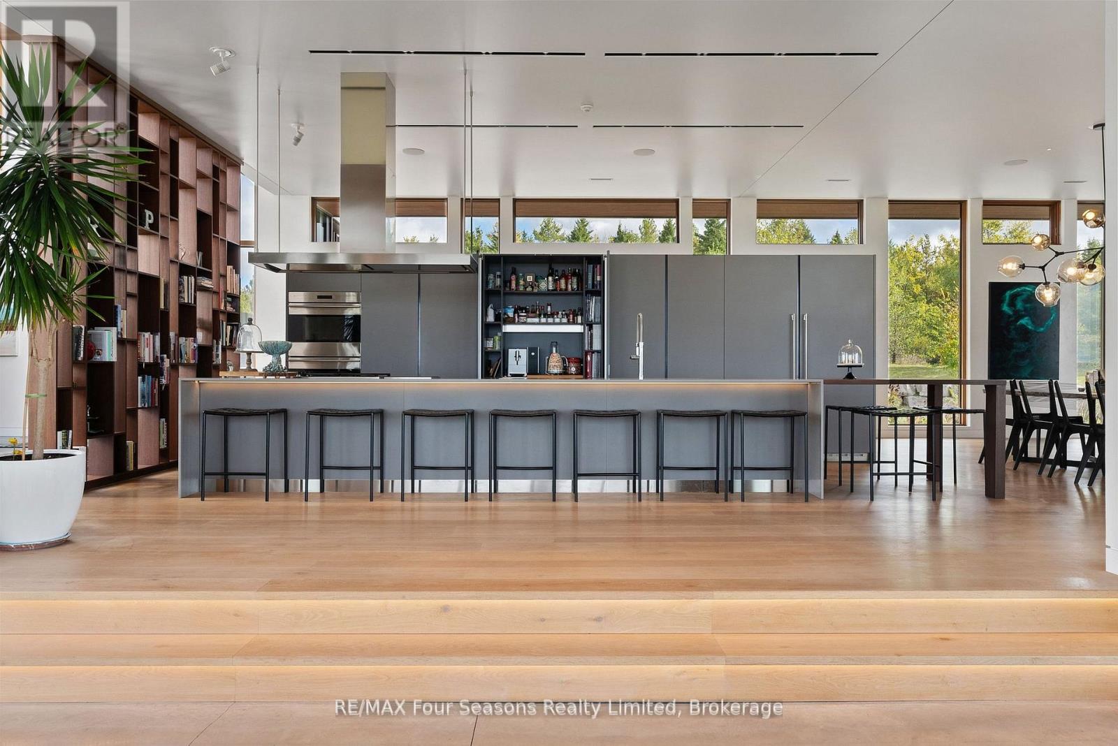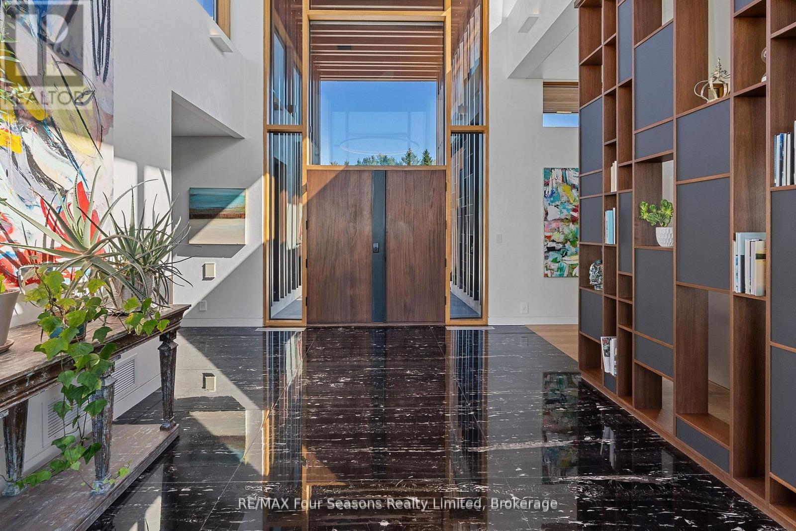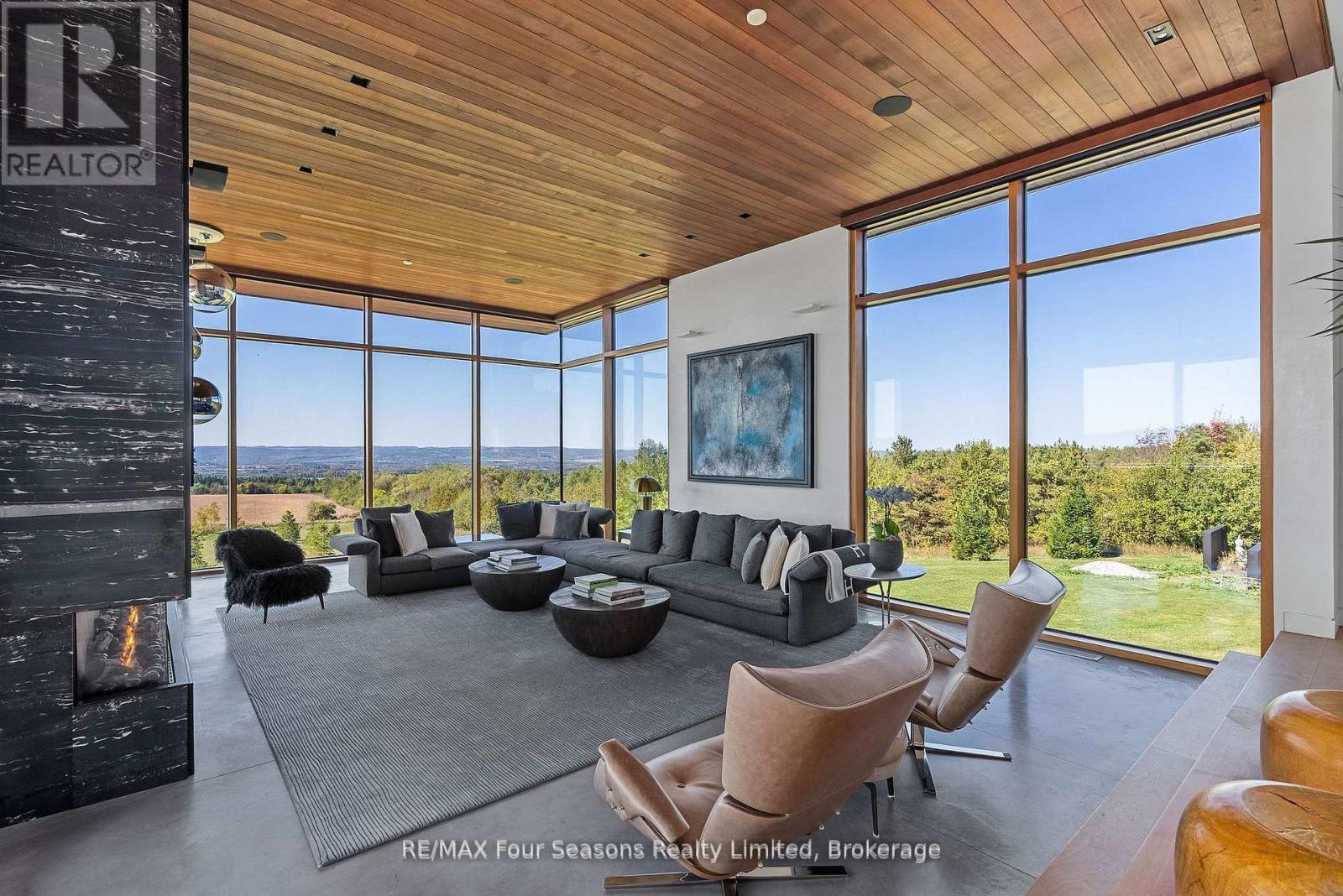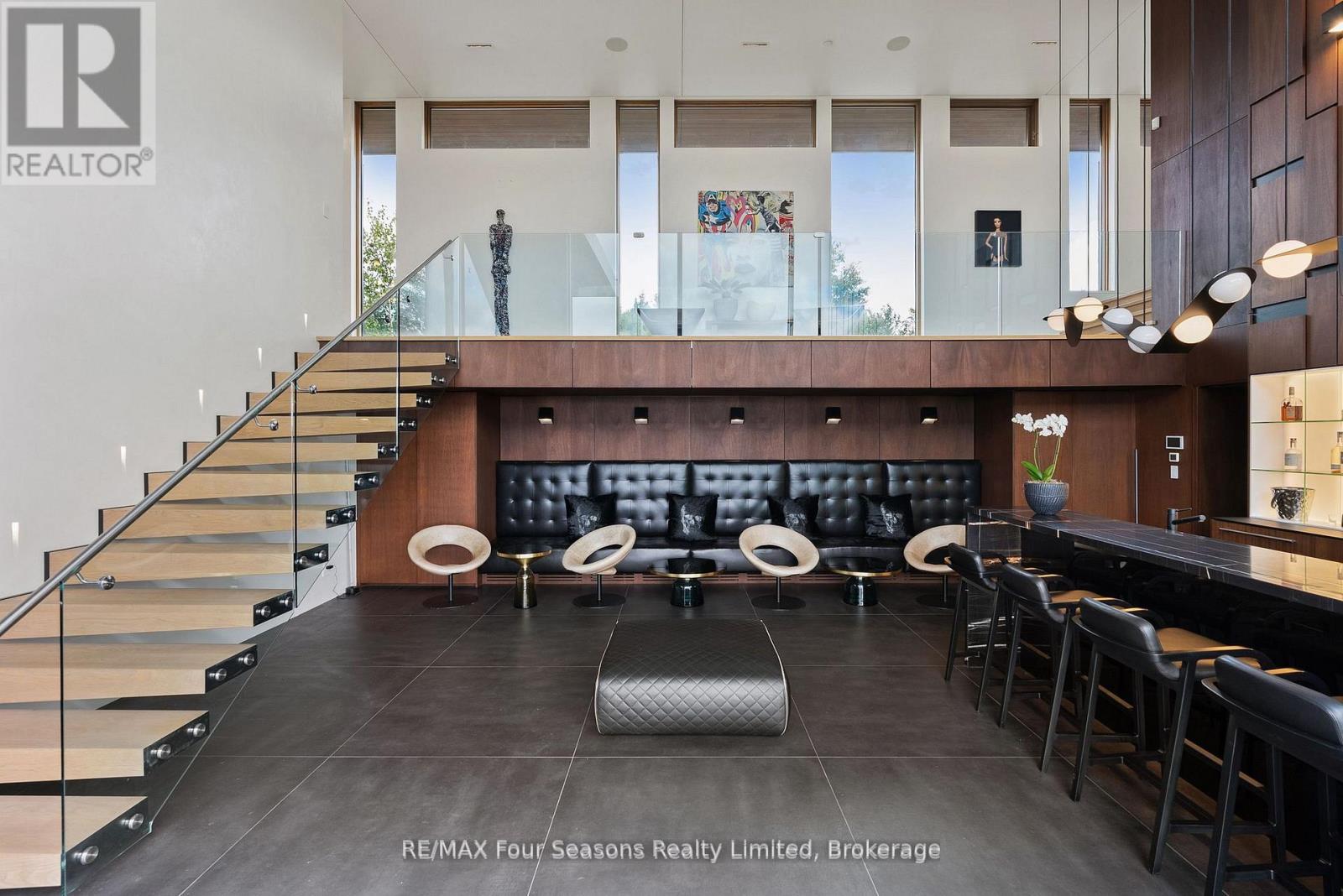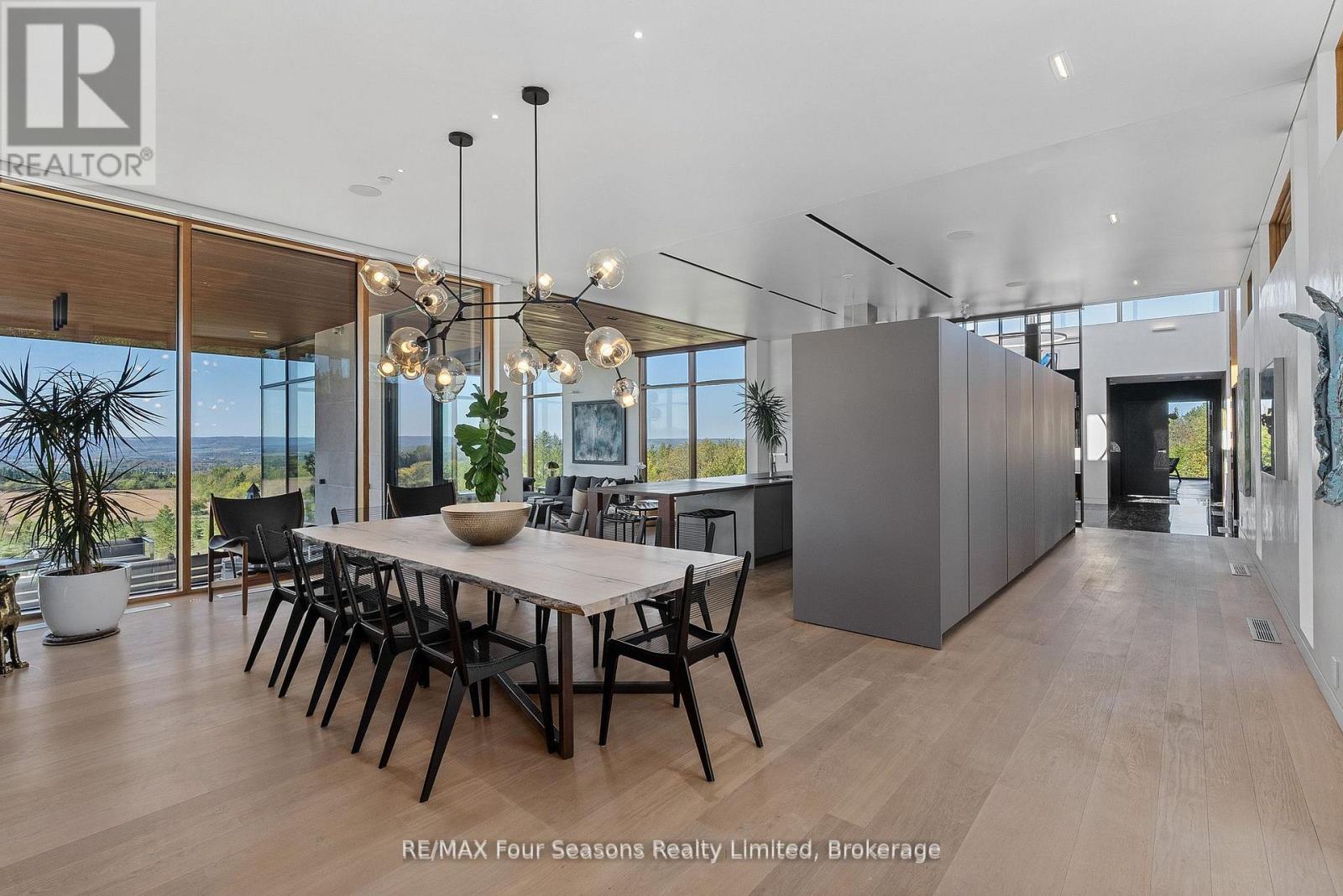 Majestically positioned upon eighty pristine acres within Clarksburg's most distinguished countryside enclave, this Frank Lloyd Wright-inspired architectural tour de force represents the pinnacle of luxury residential design. Approached through monitored gates and a winding driveway, this extraordinary five-bedroom, seven-bathroom estate exemplifies uncompromising craftsmanship, where the masterful fusion of Corten steel, cedar, and metallic exterior elements creates a striking modern silhouette set against a magnificent natural backdrop, enhanced by dramatic landscape lighting that elevates the estate's grandeur through twilight hours. The palatial interior reveals soaring eighteen-foot ceilings and resplendent marble floors, culminating in an open-concept masterpiece with polished concrete flooring and 12.5 ft. floor-to-ceiling windows framing the serene landscape. The Varenna Poliform kitchen impresses with a 20.5 ft. island, Sub-Zero and Wolf appliances, 11 ft. ceilings, and bespoke walnut cabinetry that flows with architectural harmony throughout. The lavish two-storey primary suite offers polished plaster walls, custom walnut built-ins, a marble ensuite with chronotherapy rain shower, and a private retreat lounge. Additional bedrooms include terraces or balconies, with two guest suites offering luxurious ensuites-one serving as a secondary primary with service bar. Entertainment abounds with a professional theatre, custom gym, and stunning two-storey lounge bar overlooking a 22 ft. infinity pool. A heated five-car garage and radiant flooring ensure year-round comfort. A separate two-storey guest house includes a full kitchen, loft bedroom, and soaring ceilings. A pristine barn provides premium equestrian facilities. Landscaped grounds feature a fire pit, hot tub, and pergola, all enhanced by elegant lighting. With Loree Forest nearby and a Generac generator, this estate blends architectural brilliance with modern sophistication. (id:64974)