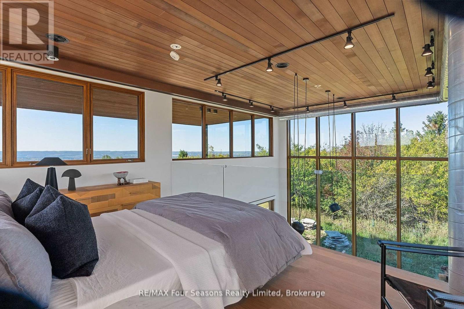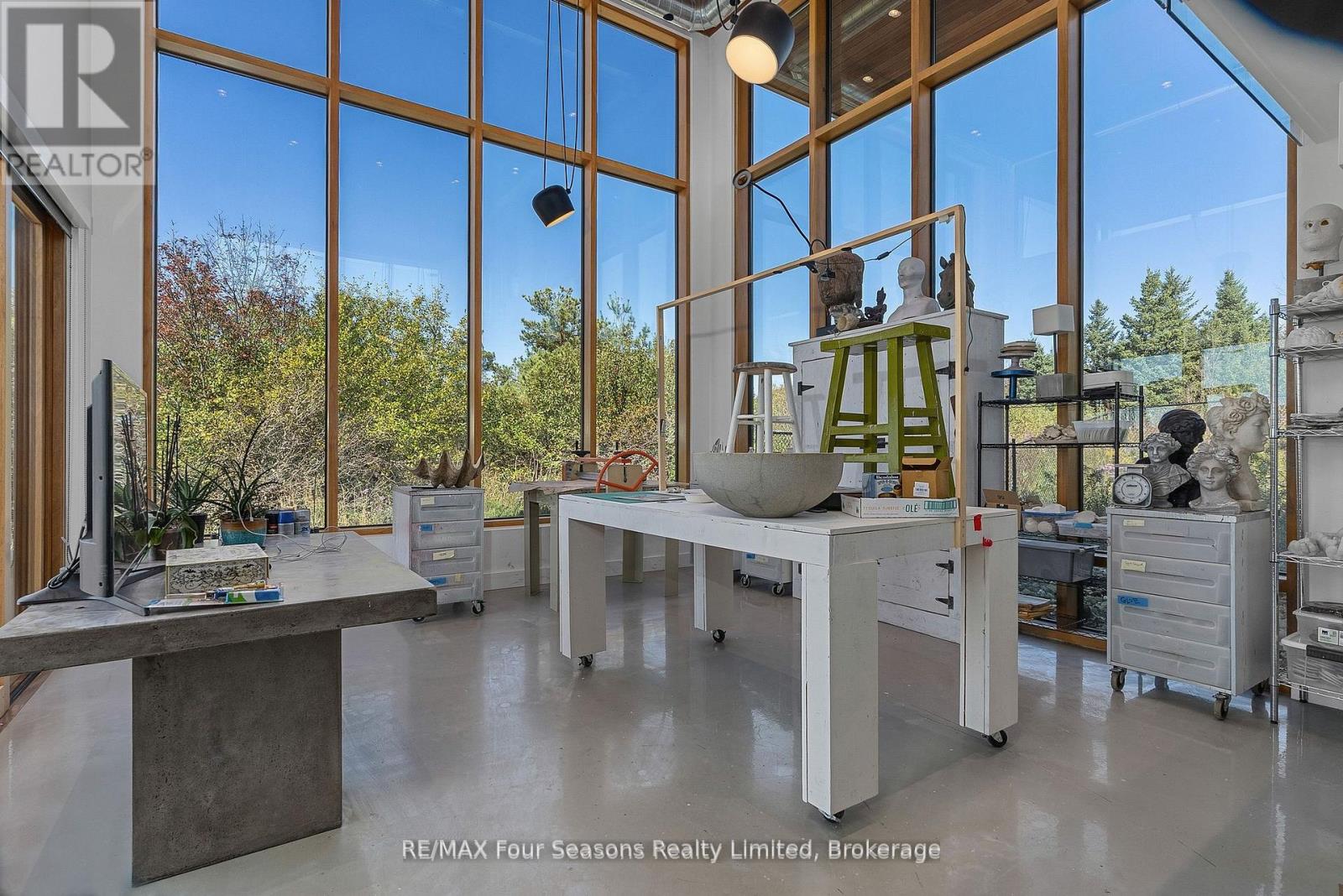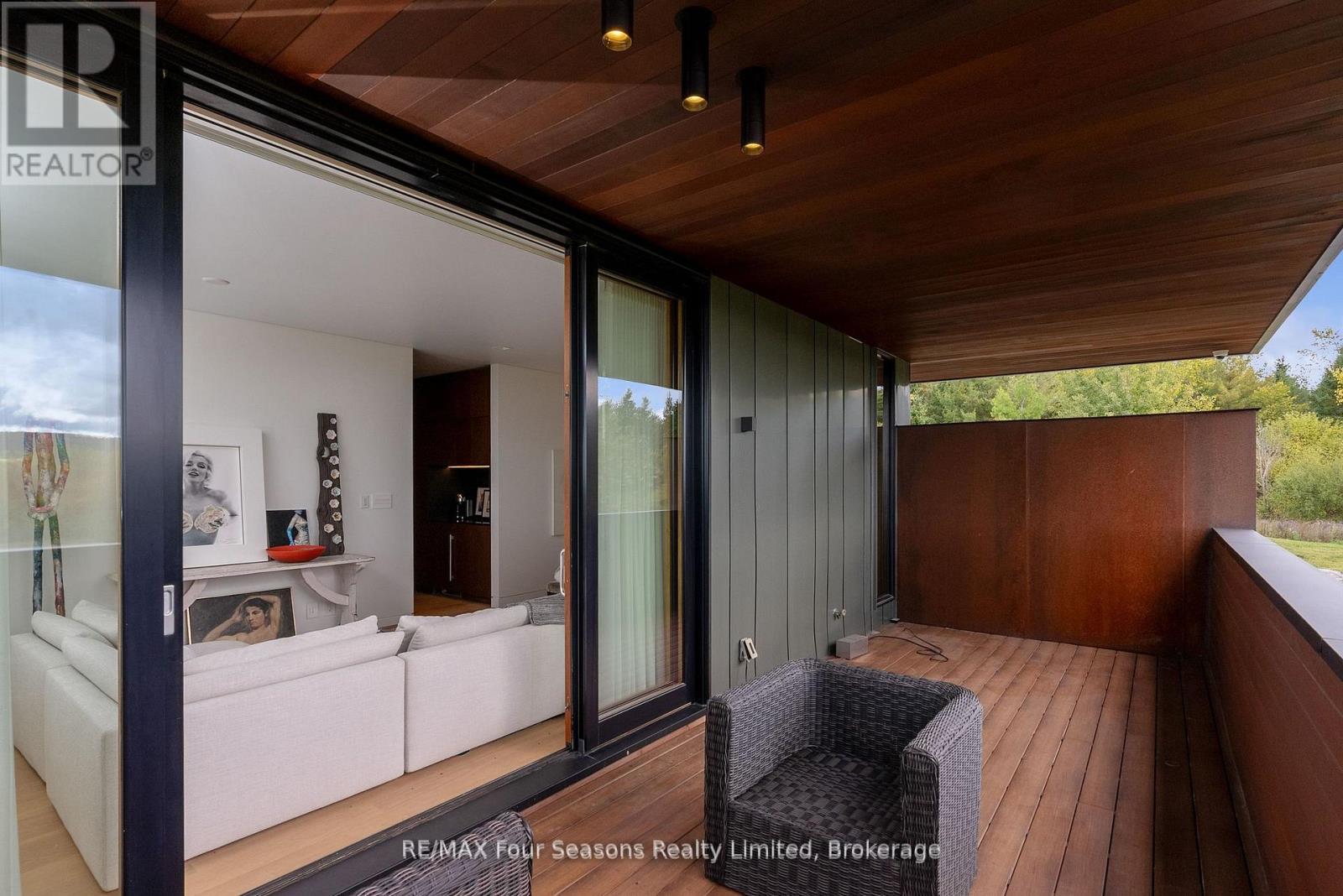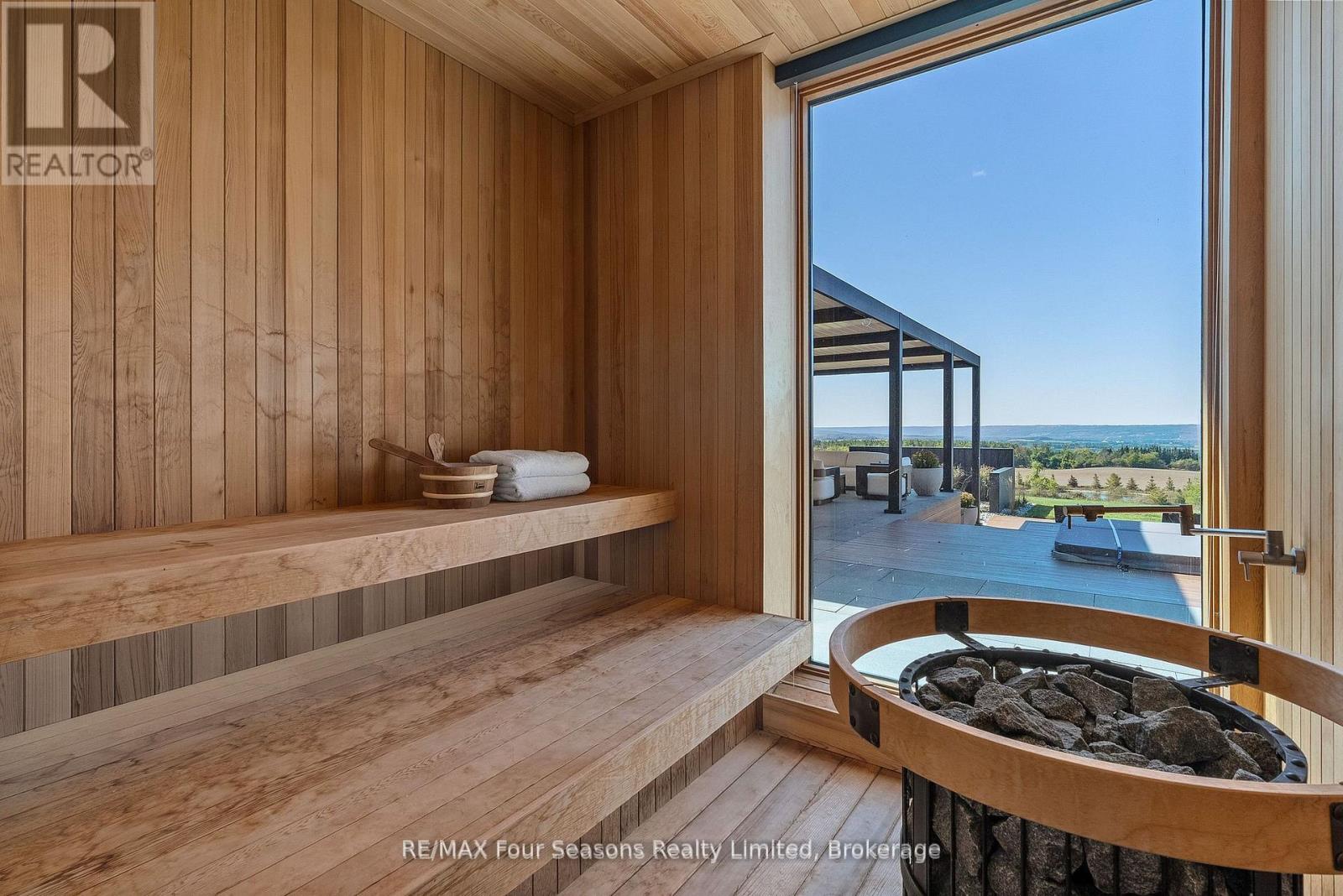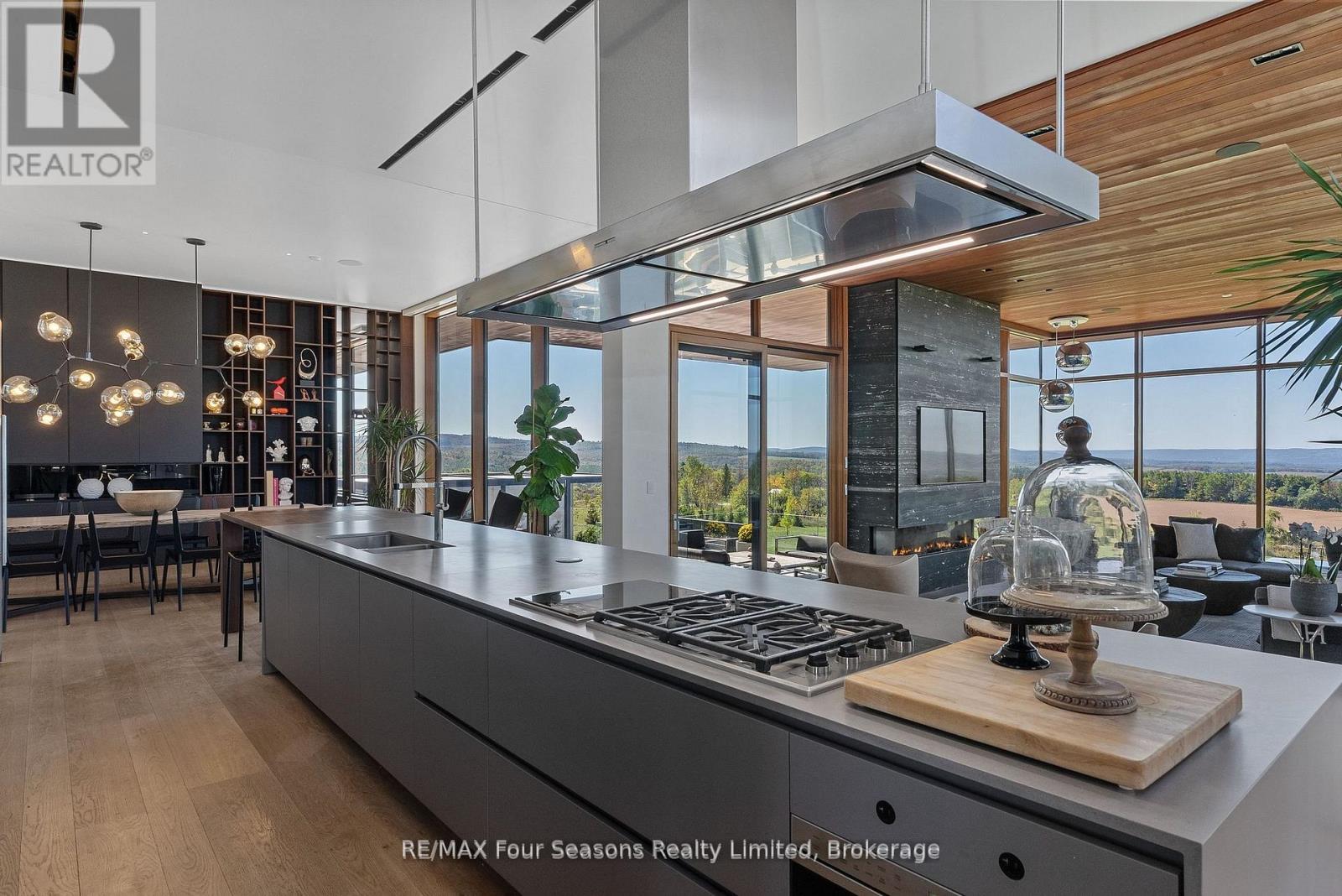 Majestically positioned upon eighty pristine acres within Clarksburg's most distinguished countryside enclave, this Frank Lloyd Wright-inspired architectural tour de force represents the pinnacle of luxury residential design. Approached through monitored gates and a winding driveway, this extraordinary five-bedroom, seven-bathroom estate exemplifies uncompromising craftsmanship, where the masterful fusion of Corten steel, cedar, and metallic exterior elements creates a striking modern silhouette set against a magnificent natural backdrop, enhanced by dramatic landscape lighting that elevates the estate's grandeur through twilight hours. The palatial interior reveals soaring eighteen-foot ceilings and resplendent marble floors, culminating in an open-concept masterpiece with polished concrete flooring and 12.5 ft. floor-to-ceiling windows framing the serene landscape. The Varenna Poliform kitchen impresses with a 20.5 ft. island, Sub-Zero and Wolf appliances, 11 ft. ceilings, and bespoke walnut cabinetry that flows with architectural harmony throughout. The lavish two-storey primary suite offers polished plaster walls, custom walnut built-ins, a marble ensuite with chronotherapy rain shower, and a private retreat lounge. Additional bedrooms include terraces or balconies, with two guest suites offering luxurious ensuites-one serving as a secondary primary with service bar. Entertainment abounds with a professional theatre, custom gym, and stunning two-storey lounge bar overlooking a 22 ft. infinity pool. A heated five-car garage and radiant flooring ensure year-round comfort. A separate two-storey guest house includes a full kitchen, loft bedroom, and soaring ceilings. A pristine barn provides premium equestrian facilities. Landscaped grounds feature a fire pit, hot tub, and pergola, all enhanced by elegant lighting. With Loree Forest nearby and a Generac generator, this estate blends architectural brilliance with modern sophistication. (id:64974)