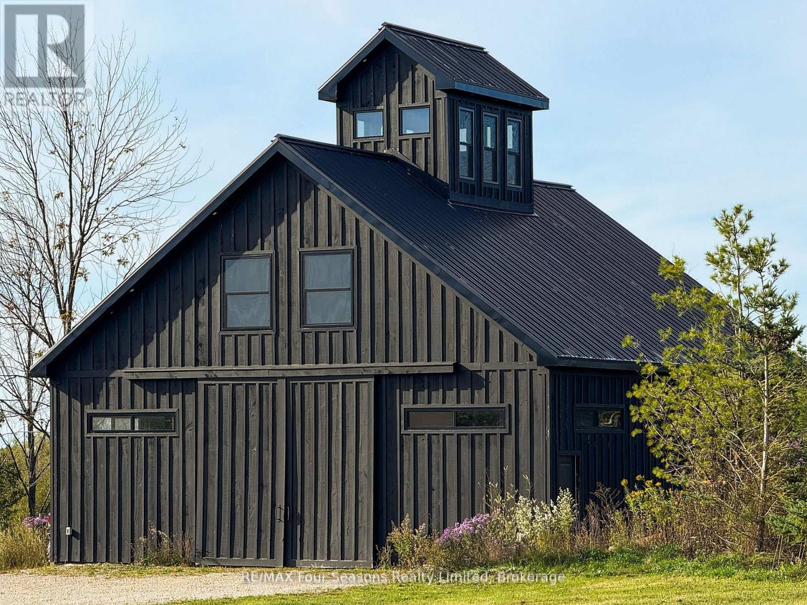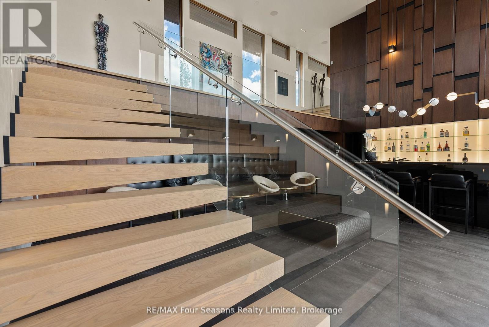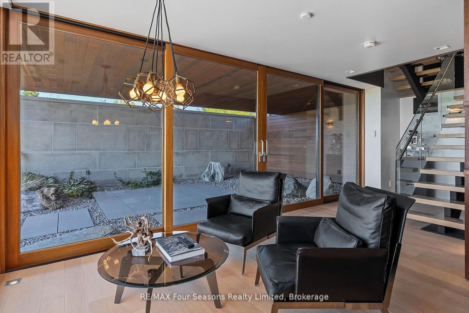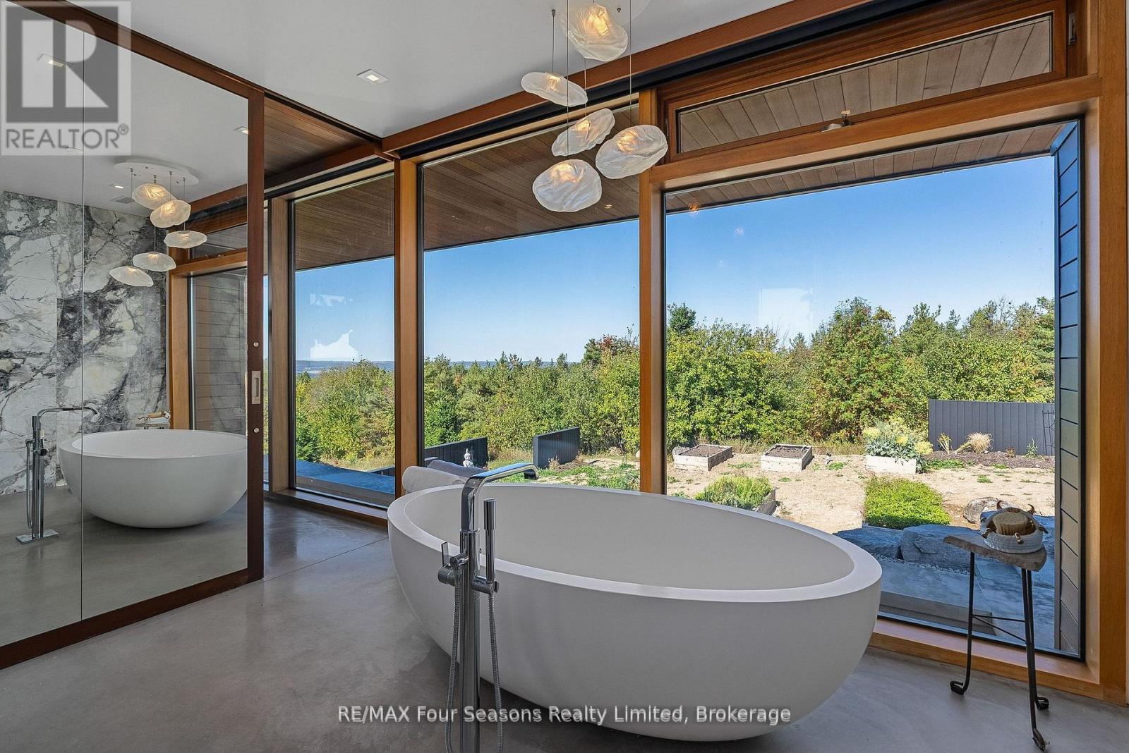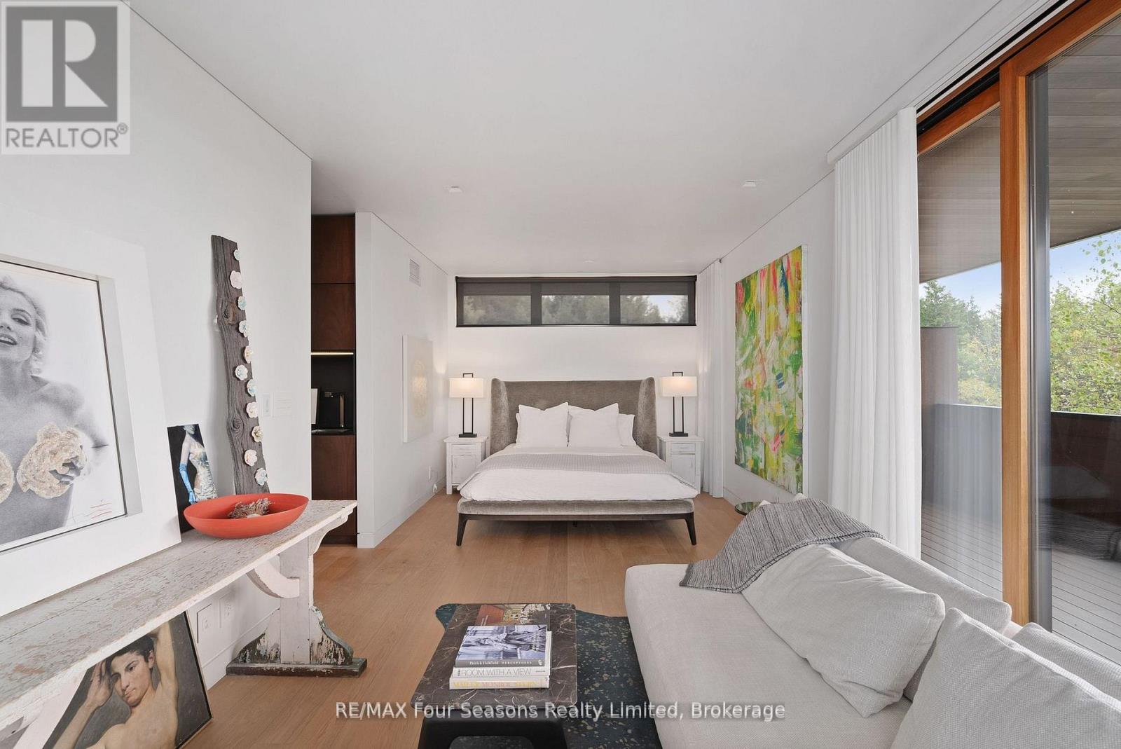 Majestically positioned upon eighty pristine acres within Clarksburg's most distinguished countryside enclave, this Frank Lloyd Wright-inspired architectural tour de force represents the pinnacle of luxury residential design. Approached through monitored gates and a winding driveway, this extraordinary five-bedroom, seven-bathroom estate exemplifies uncompromising craftsmanship, where the masterful fusion of Corten steel, cedar, and metallic exterior elements creates a striking modern silhouette set against a magnificent natural backdrop, enhanced by dramatic landscape lighting that elevates the estate's grandeur through twilight hours. The palatial interior reveals soaring eighteen-foot ceilings and resplendent marble floors, culminating in an open-concept masterpiece with polished concrete flooring and 12.5 ft. floor-to-ceiling windows framing the serene landscape. The Varenna Poliform kitchen impresses with a 20.5 ft. island, Sub-Zero and Wolf appliances, 11 ft. ceilings, and bespoke walnut cabinetry that flows with architectural harmony throughout. The lavish two-storey primary suite offers polished plaster walls, custom walnut built-ins, a marble ensuite with chronotherapy rain shower, and a private retreat lounge. Additional bedrooms include terraces or balconies, with two guest suites offering luxurious ensuites-one serving as a secondary primary with service bar. Entertainment abounds with a professional theatre, custom gym, and stunning two-storey lounge bar overlooking a 22 ft. infinity pool. A heated five-car garage and radiant flooring ensure year-round comfort. A separate two-storey guest house includes a full kitchen, loft bedroom, and soaring ceilings. A pristine barn provides premium equestrian facilities. Landscaped grounds feature a fire pit, hot tub, and pergola, all enhanced by elegant lighting. With Loree Forest nearby and a Generac generator, this estate blends architectural brilliance with modern sophistication. (id:64974)