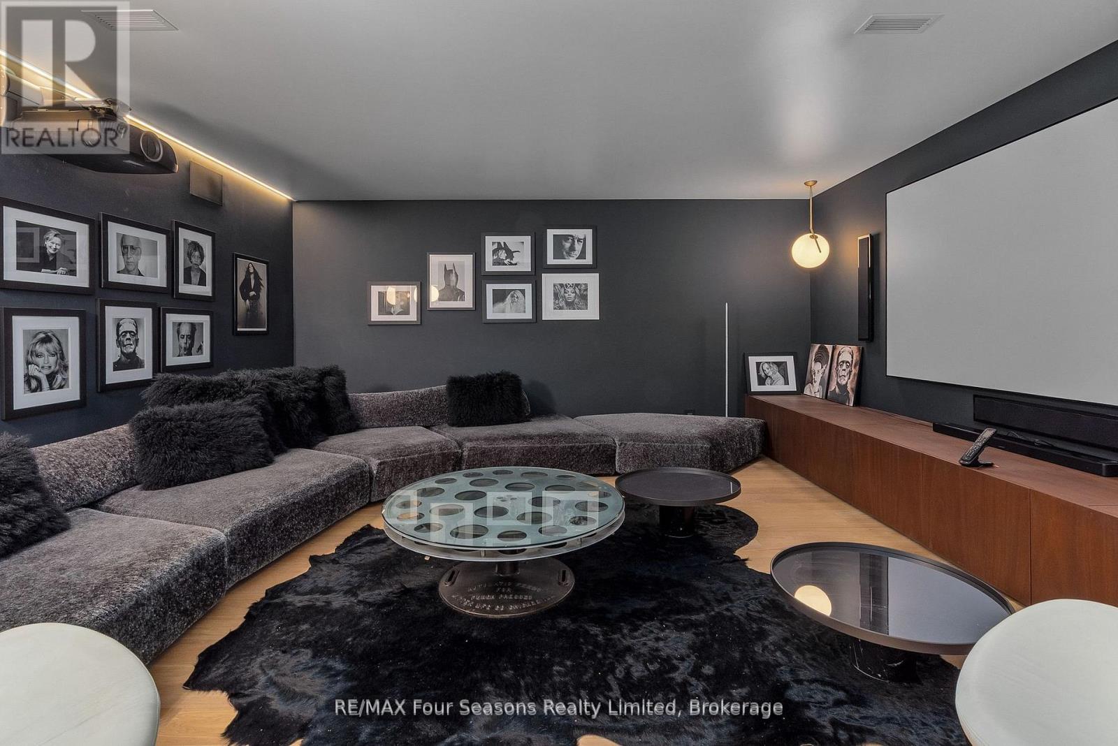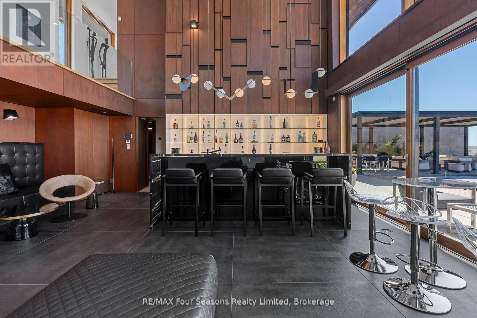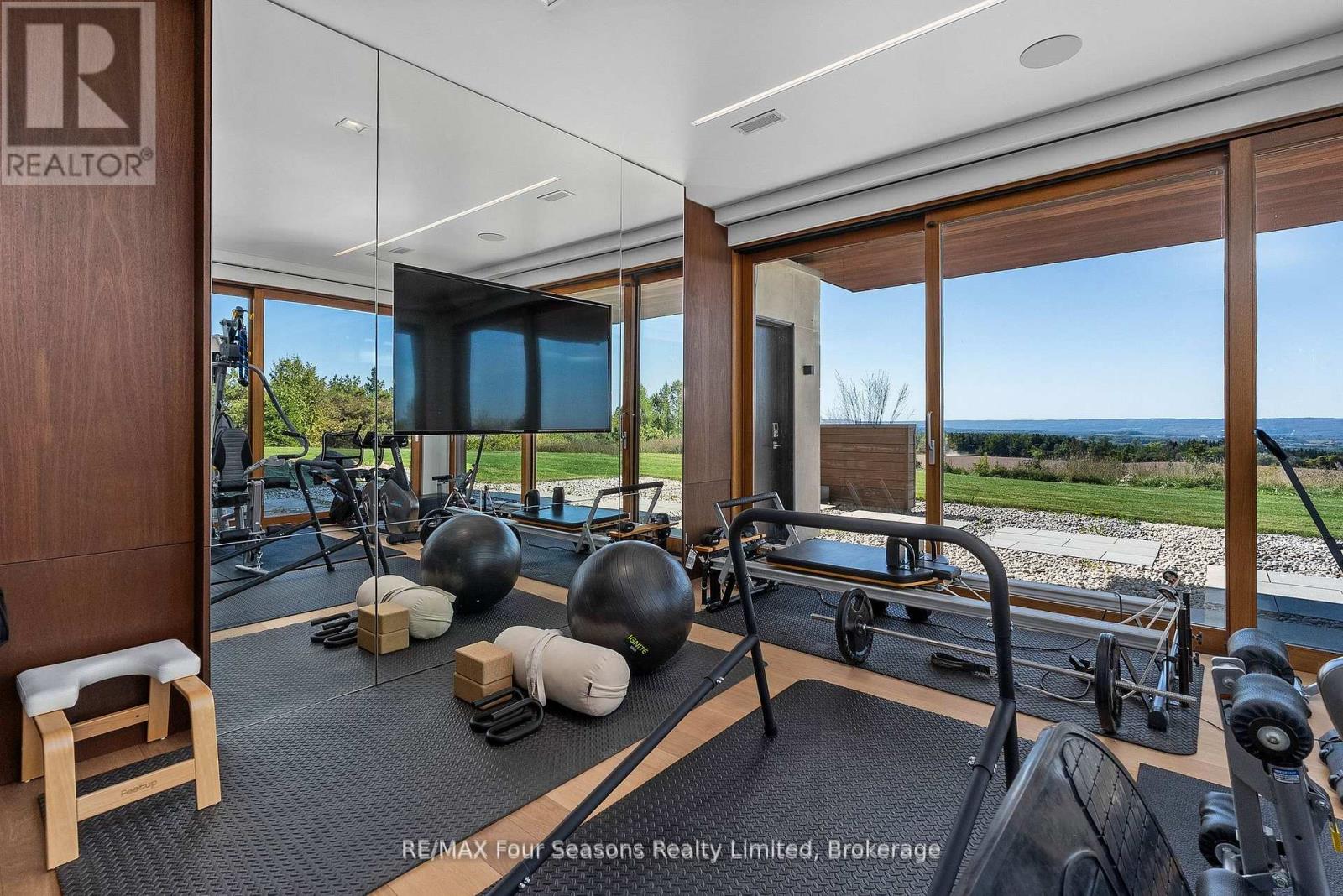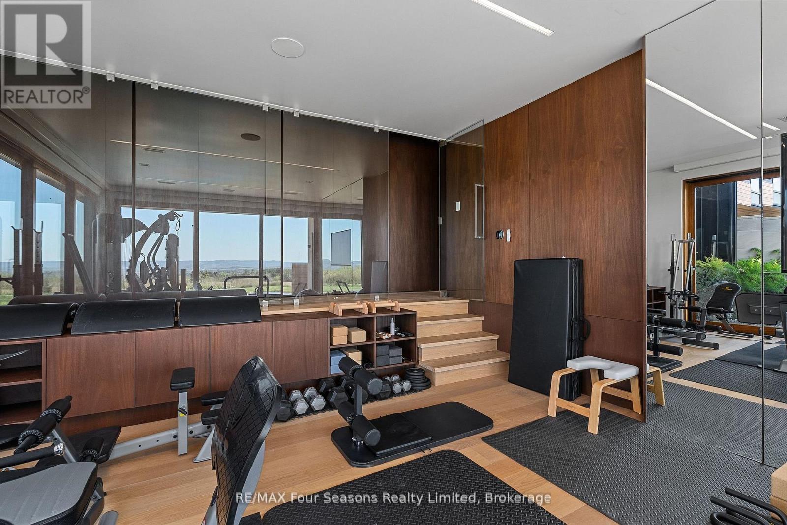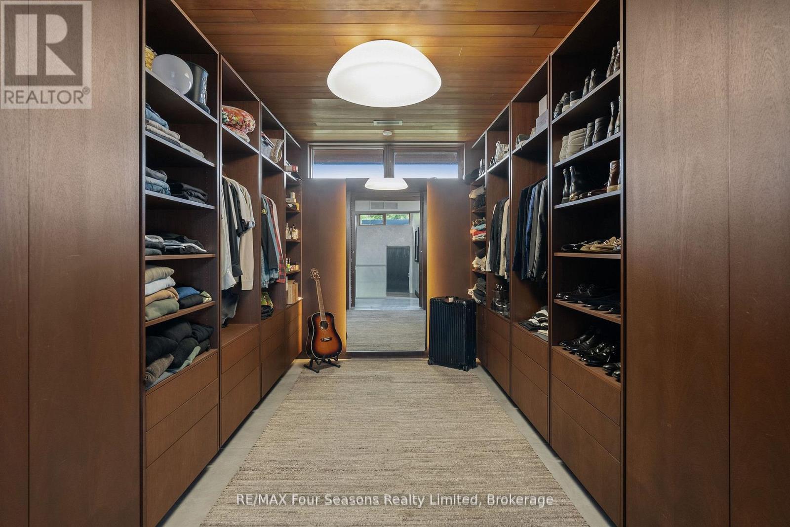 Majestically positioned upon eighty pristine acres within Clarksburg's most distinguished countryside enclave, this Frank Lloyd Wright-inspired architectural tour de force represents the pinnacle of luxury residential design. Approached through monitored gates and a winding driveway, this extraordinary five-bedroom, seven-bathroom estate exemplifies uncompromising craftsmanship, where the masterful fusion of Corten steel, cedar, and metallic exterior elements creates a striking modern silhouette set against a magnificent natural backdrop, enhanced by dramatic landscape lighting that elevates the estate's grandeur through twilight hours. The palatial interior reveals soaring eighteen-foot ceilings and resplendent marble floors, culminating in an open-concept masterpiece with polished concrete flooring and 12.5 ft. floor-to-ceiling windows framing the serene landscape. The Varenna Poliform kitchen impresses with a 20.5 ft. island, Sub-Zero and Wolf appliances, 11 ft. ceilings, and bespoke walnut cabinetry that flows with architectural harmony throughout. The lavish two-storey primary suite offers polished plaster walls, custom walnut built-ins, a marble ensuite with chronotherapy rain shower, and a private retreat lounge. Additional bedrooms include terraces or balconies, with two guest suites offering luxurious ensuites-one serving as a secondary primary with service bar. Entertainment abounds with a professional theatre, custom gym, and stunning two-storey lounge bar overlooking a 22 ft. infinity pool. A heated five-car garage and radiant flooring ensure year-round comfort. A separate two-storey guest house includes a full kitchen, loft bedroom, and soaring ceilings. A pristine barn provides premium equestrian facilities. Landscaped grounds feature a fire pit, hot tub, and pergola, all enhanced by elegant lighting. With Loree Forest nearby and a Generac generator, this estate blends architectural brilliance with modern sophistication. (id:64974)