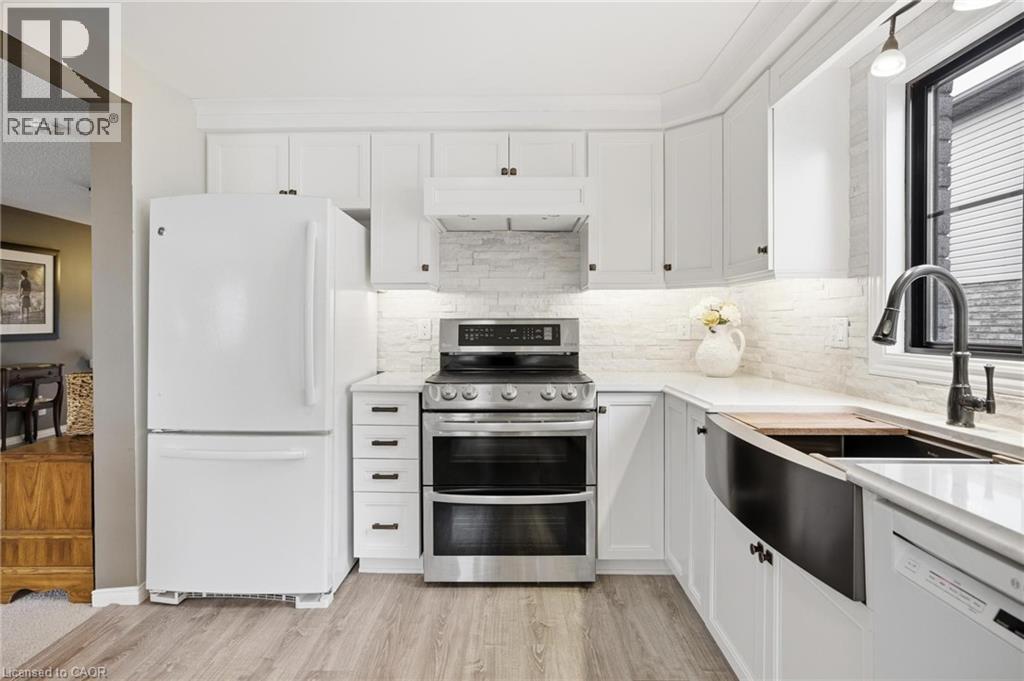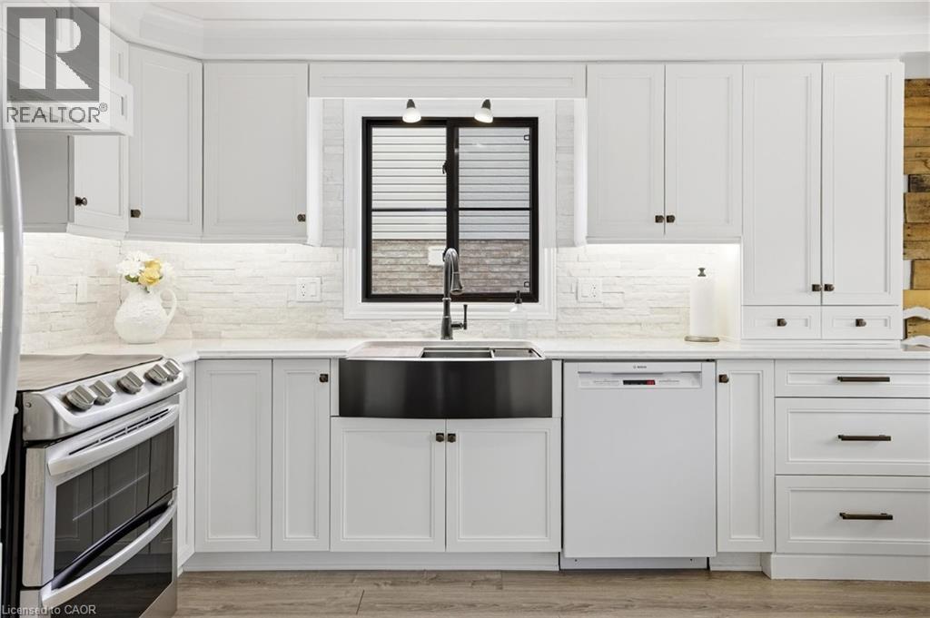 Welcome to 733 Breakwater Cres, a beautifully updated family home tucked into one of Waterloo’s most connected and community-focused neighbourhoods. Offering just over 1,800 sq ft of thoughtfully designed living space, a finished basement, and a distinctive exterior, this home blends style, comfort, and functionality. From the moment you arrive, you’ll notice that no other home in the subdivision looks quite like this one, thanks to the custom front entrance and inviting porch. In the spring, the porch sits beneath a fragrant canopy of lilacs, creating the perfect place to sit and enjoy the neighbourhood. The landscaped gardens are designed for easy maintenance with Boston ivy and flowering periwinkle ground cover, while the backyard’s yellow trumpet creeper often attracts hummingbirds. Inside, the home welcomes you with soaring ceilings at the front entrance and warm natural light throughout. Morning sun fills the kitchen and living room, highlighting the beautifully updated farmhouse-inspired kitchen (2017) with quartz countertops, furniture-style cabinetry with crown moulding, an apron sink, double oven, and hidden range hood. The raised west-facing family room is the perfect place to relax while enjoying sunset views. Upstairs you’ll find three comfortable bedrooms and an updated main bathroom with a practical low-profile tub ideal for kids or pets. The finished basement features a theatre room with sound-absorbing panels, perfect for movie nights. Updates include roof (2019), black-framed windows (2024), heat pump (2025), dishwasher (2021), and oven (2023). Poured concrete patios at the front and back add outdoor living space. Located steps from walking and biking trails connecting to RIM Park, this neighbourhood is known for its strong community with a neighbourhood garden, winter skating rink, and seasonal gatherings. With a dbl car garage, modern finishes, and a welcoming community, 733 Breakwater Cres is a place you’ll love to call home. (id:64974)