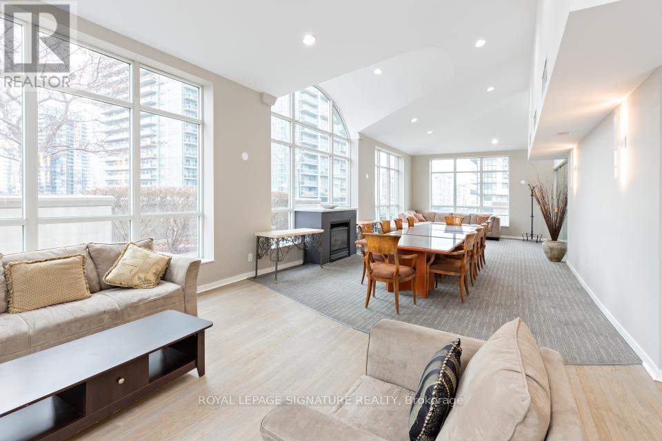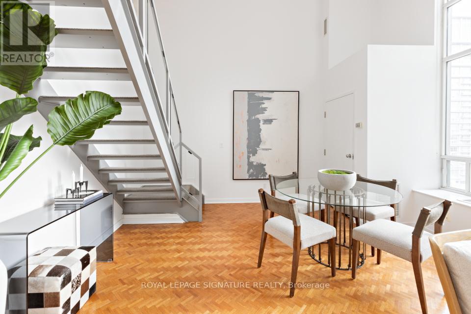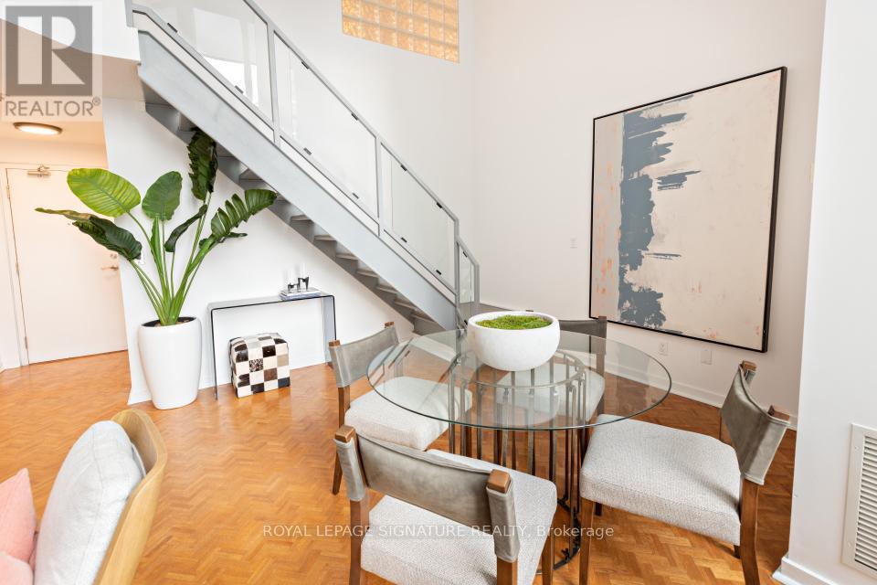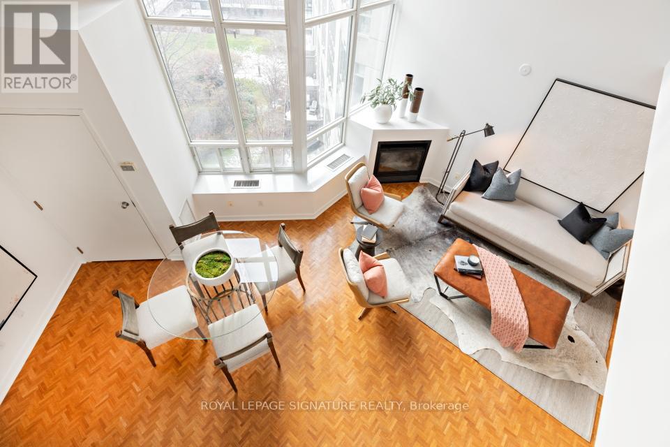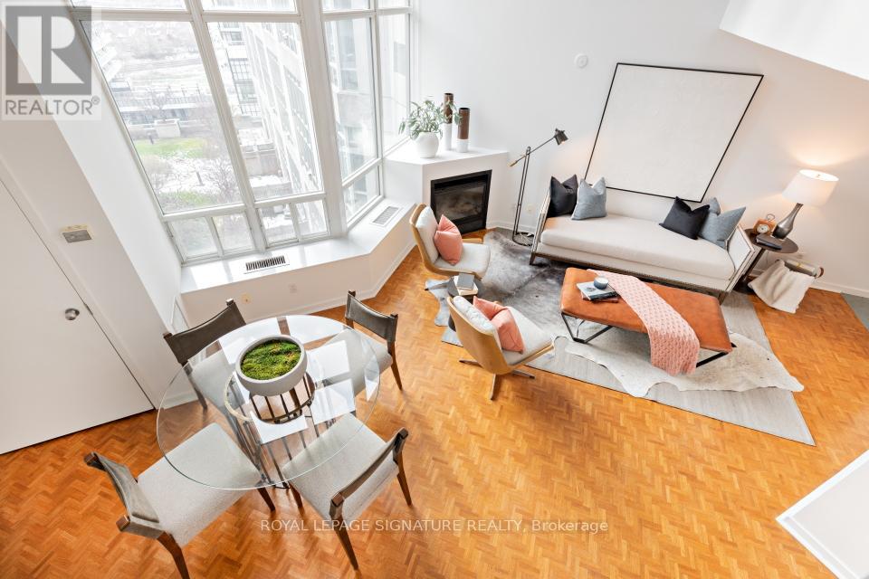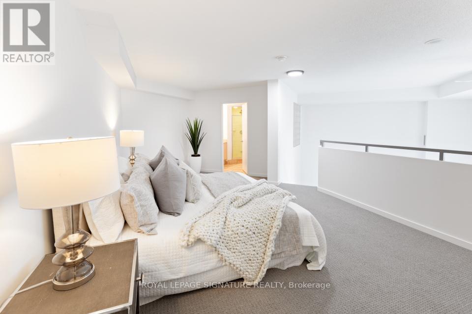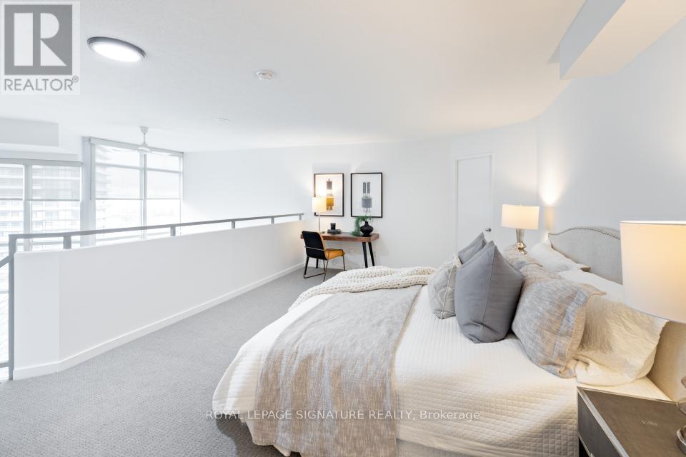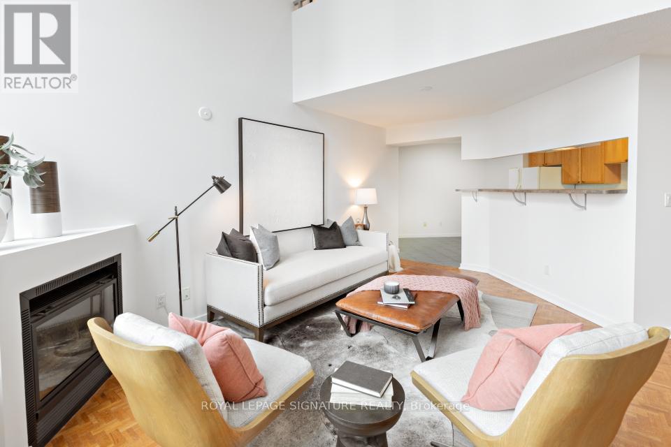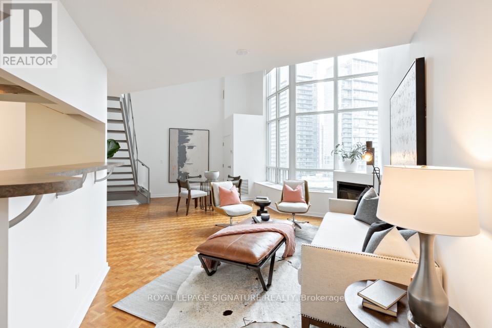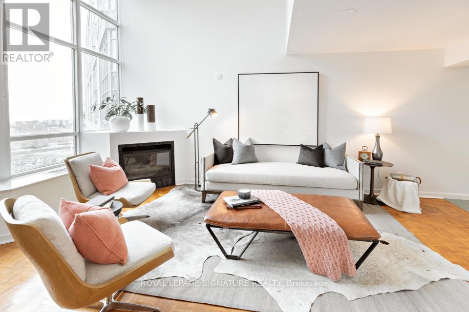 In the heart of South Etobicoke/Mimico you'll find this stunning 2 storey loft with breathtaking lake and park views. This well-designed, bright, open concept living space (~ 1080 sqft) boasts of a 17ft ceiling with floor to ceiling windows that flood the loft with natural light. On cooler nights once can cozy up beside the gas fireplace. Beautiful hardwood flooring on the open concept main floor and soft broadloom on the second floor. The primary bedroom retreat overlooks the grand living space below and offers a spacious walk-in closet, a 4-piece ensuite and plenty of space for a home office or a sitting area. Residents enjoy first rate amenities, including a fully equipped gym and a rooftop patio with a BBQ area. It's a phenomenal location just minutes from the QEW & the Gardiner Expressway. It has excellent transit options: just steps to GO Transit and TTC. It's also a mere 15-minute commute to downtown Toronto or to the airport. One can walk to grocery stores, shops, restaurants, Humber River parks/trails, and plenty of entertainment. 2 parking spots side by side and a private locker room are included! This sophisticated loft is such a rare opportunity in one of Toronto's most desirable waterfront communities. Come and sneak a peak! Furnishings available upon request at an additional cost. (id:64974)