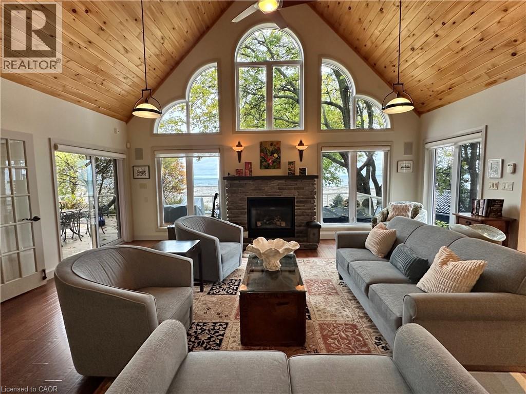 Experience the ultimate in lakeside living! Introducing a rare opportunity to own an impressive executive style waterfront residence in the coveted Sandy Bay community, nestled on the shores of Lake Erie. Set on a private, hilltop lot, this exquisite home offers unmatched lake views and direct lake access with your own private waterfront. Enjoy panoramic water views from nearly every room. Inside, discover a spacious and elegantly appointed layout. The entertainer’s kitchen is a chef’s dream, highlighted by high-end, built-in SS appliances, quartz & slate countertops, light cabinetry, and an open-concept design with vaulted ceiling, that creates an elevated, inviting atmosphere that feels both luxurious and comfortable and flows perfectly into the spacious dining area complete with a wall of windows & gorgeous water views . The sunlit living room seamlessly opens through sliding glass doors to a sprawling deck, where you’ll find a relaxing hot tub—a front-row seat to vibrant sunsets and tranquil starlit nights. The primary suite is a serene retreat, boasting a spa-inspired 5-piece ensuite, generous walk-in closet, cozy fireplace, and a private cantilevered deck balcony—perfect for savouring sunrise coffees or evening breezes overlooking the shimmering lake and Lake Erie’s Grant Point. Additional features include an attached double garage, beautifully landscaped grounds with armourstone tiered garden, with huge flag stone steps & interlock walkway leading to the welcoming front porch to the flag stone steps and walk way to the water. Fully fenced back yard offers security for children and pets in the lakeside yard. For additional peace of mind you will enjoy the comfort of a whole home automatic back up generator. Work from home? Take note: high-speed fiber optic cable internet connection is available. Experience the perfect blend of luxury, comfort, & breathtaking natural beauty—schedule your private tour & make this exceptional waterfront oasis your new home! (id:64974)
