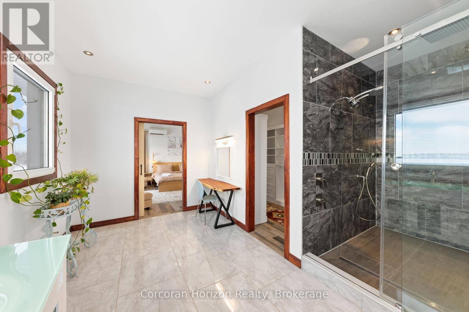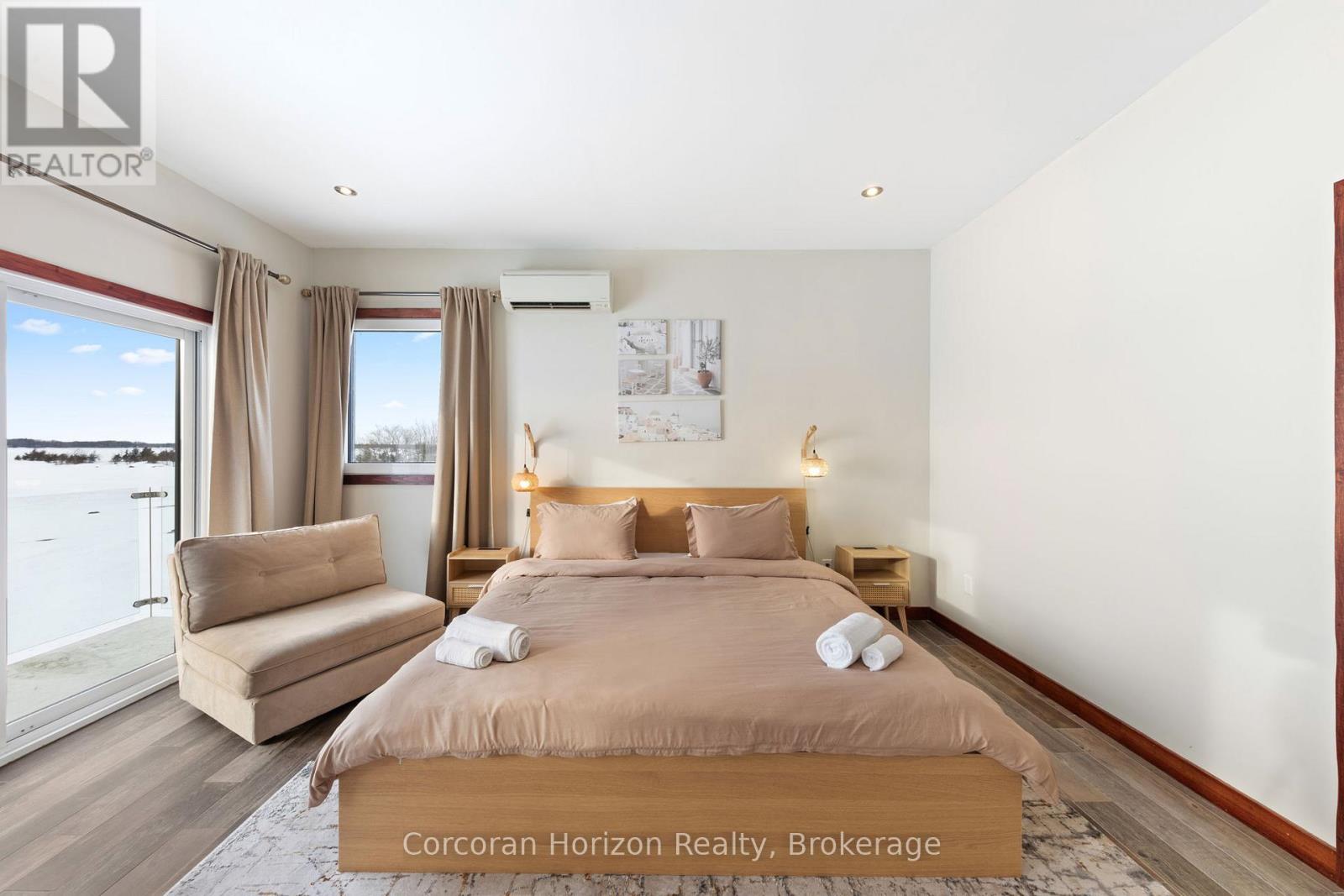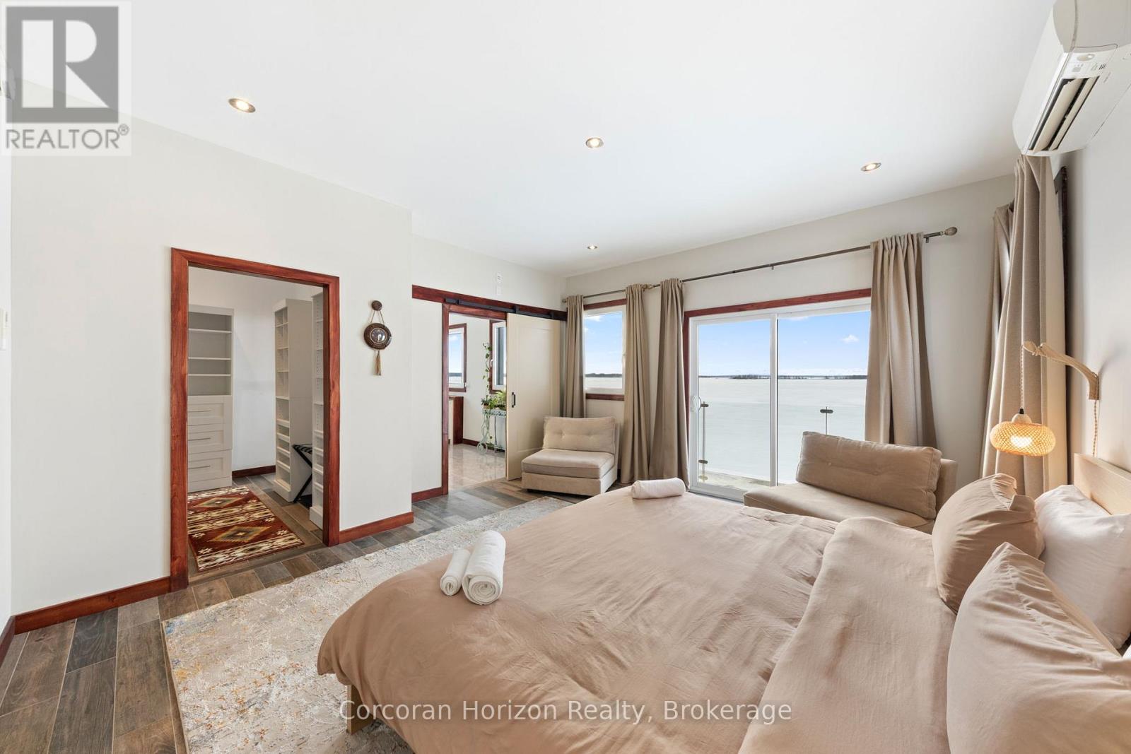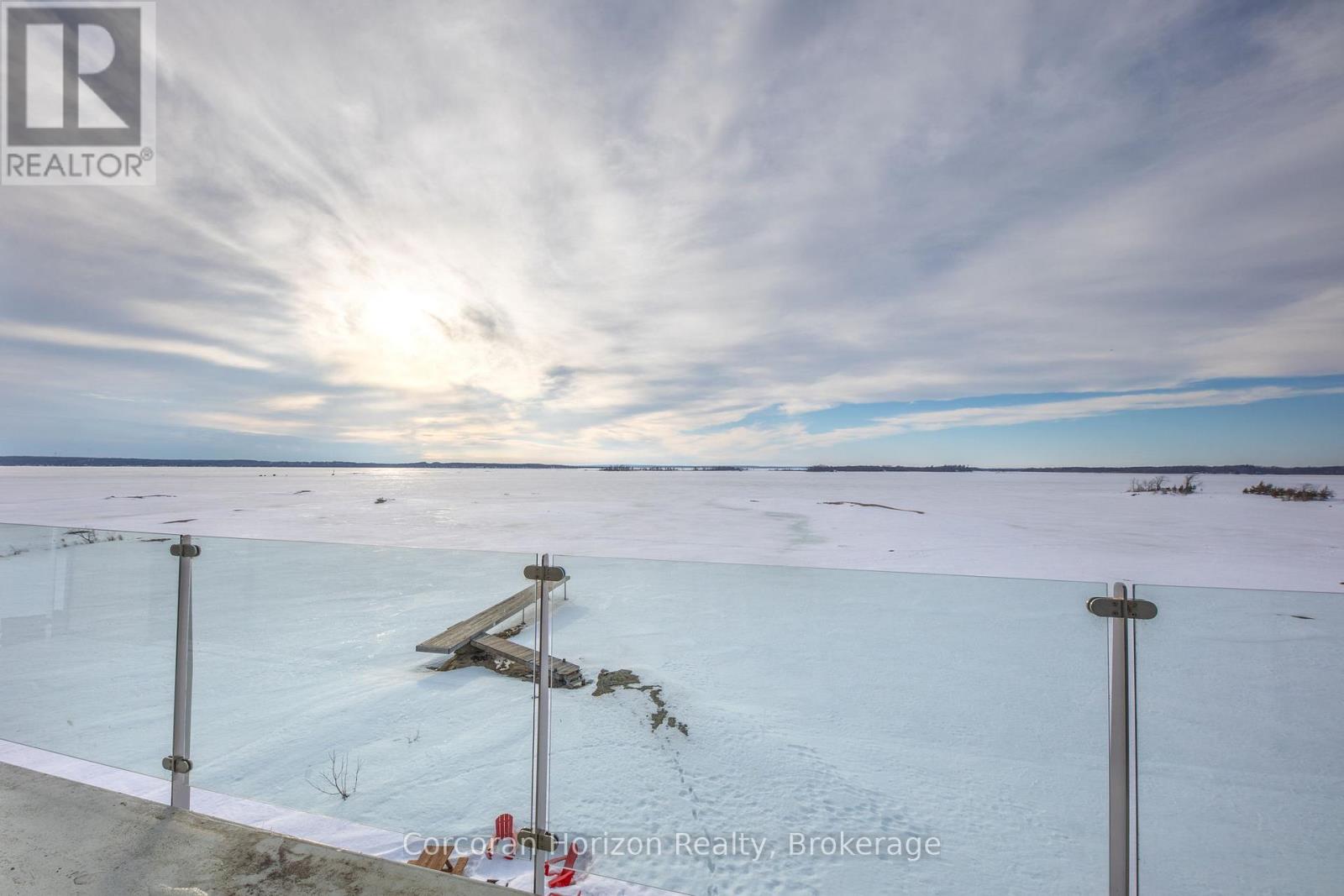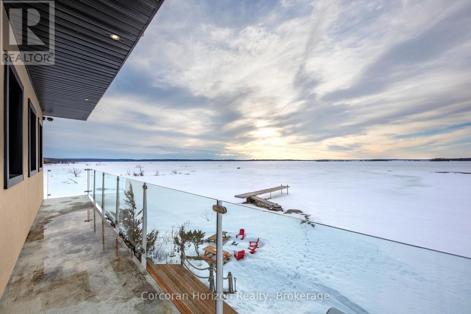 An extraordinary waterfront estate on Georgian Bay! This architecturally striking 2.5-storey residence offers approximately 3,000 sq ft of refined living space on a rare private peninsula with over 500 feet of pristine shoreline. Surrounded by water, the property delivers exceptional privacy, sweeping 270-degree panoramic views, and unforgettable sunsets.The main level is designed for elevated living and entertaining, featuring a seamless open-concept layout with expansive windows that frame the natural surroundings. The gourmet kitchen is beautifully appointed with premium stainless steel appliances, an oversized island with integrated cooktop and concealed ventilation and a walk-in pantry. The sunken living room creates a dramatic yet inviting setting, perfectly positioned to capture uninterrupted water views. A private office and elegant powder room complete the main floor. Upstairs, the second level offers a serene primary retreat and a walk-through closet with custom built-ins. Two additional spacious bedrooms feature unique loft areas, complemented by a stylish 4-piece bath and a dedicated laundry room.The third floor presents a versatile space with hardwood flooring and walkout to a private balcony which offers elevated views over the bay. It's perfectly suited as a lounge, studio, or additional living area. Outdoors, enjoy a natural sandy beach, private boat launch, and endless waterfront recreation. The peninsula setting creates a truly rare and immersive Georgian Bay lifestyle. A heated and insulated garage. Some trim work remains, offering the opportunity to personalize final finishes. Located just 90 minutes from the GTA, this is a rare offering combining luxury, privacy, and exceptional waterfront living. (id:64974)