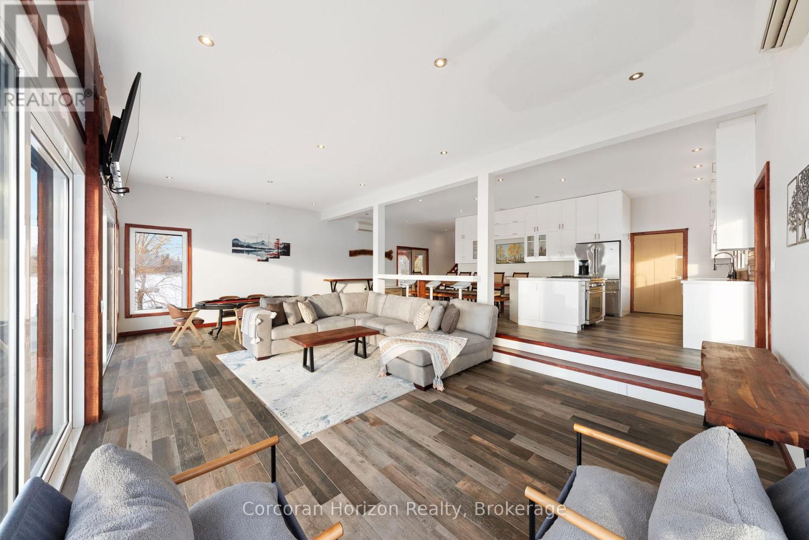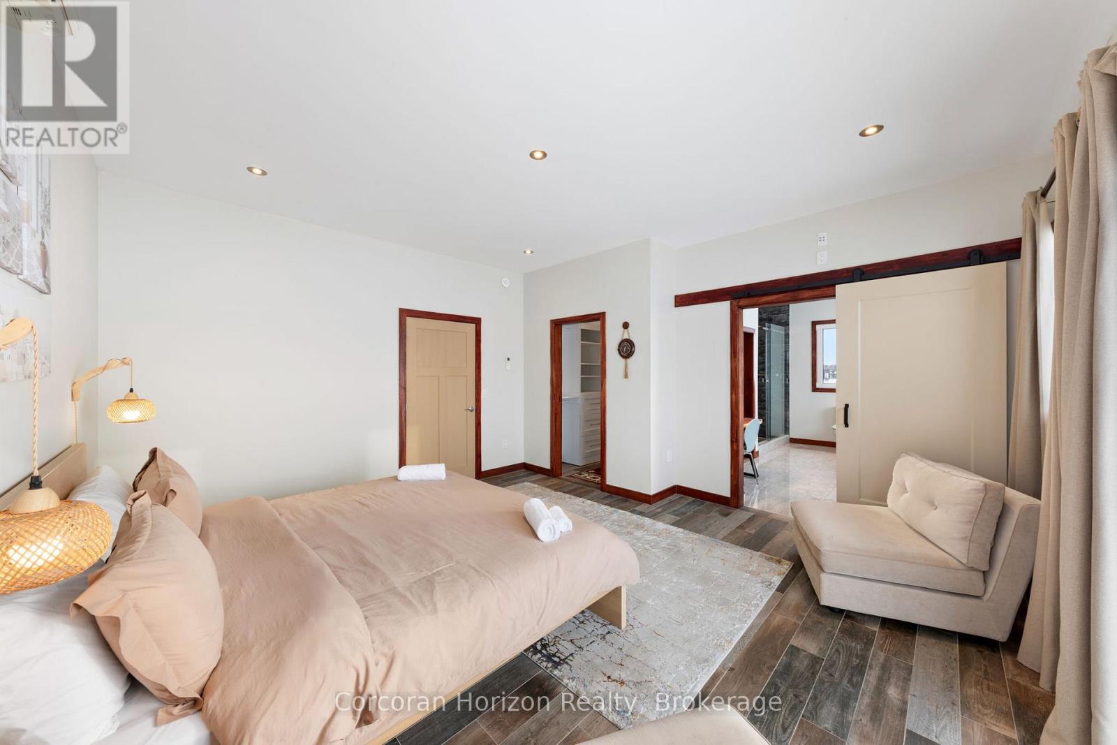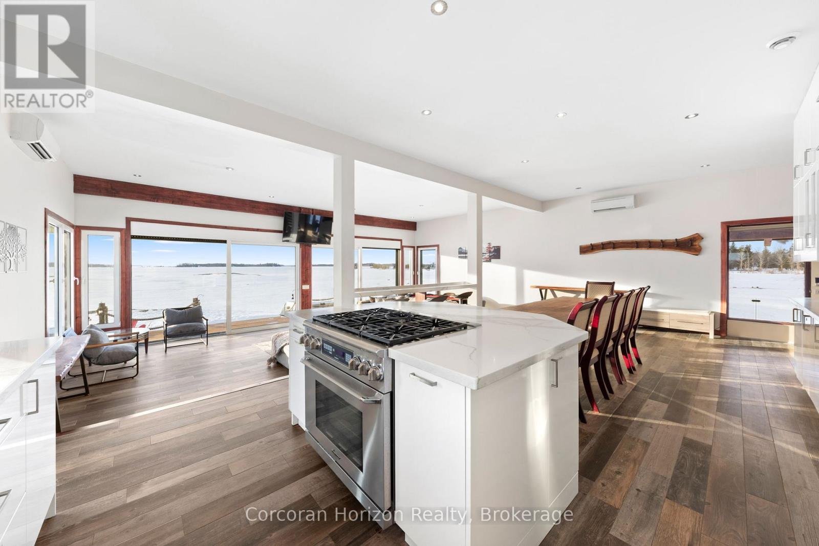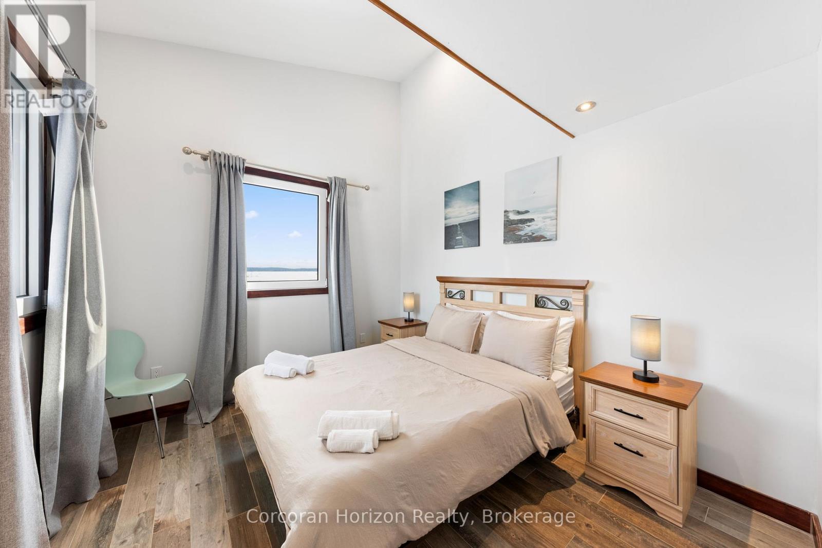 An extraordinary waterfront estate on Georgian Bay! This architecturally striking 2.5-storey residence offers approximately 3,000 sq ft of refined living space on a rare private peninsula with over 500 feet of pristine shoreline. Surrounded by water, the property delivers exceptional privacy, sweeping 270-degree panoramic views, and unforgettable sunsets.The main level is designed for elevated living and entertaining, featuring a seamless open-concept layout with expansive windows that frame the natural surroundings. The gourmet kitchen is beautifully appointed with premium stainless steel appliances, an oversized island with integrated cooktop and concealed ventilation and a walk-in pantry. The sunken living room creates a dramatic yet inviting setting, perfectly positioned to capture uninterrupted water views. A private office and elegant powder room complete the main floor. Upstairs, the second level offers a serene primary retreat and a walk-through closet with custom built-ins. Two additional spacious bedrooms feature unique loft areas, complemented by a stylish 4-piece bath and a dedicated laundry room.The third floor presents a versatile space with hardwood flooring and walkout to a private balcony which offers elevated views over the bay. It's perfectly suited as a lounge, studio, or additional living area. Outdoors, enjoy a natural sandy beach, private boat launch, and endless waterfront recreation. The peninsula setting creates a truly rare and immersive Georgian Bay lifestyle. A heated and insulated garage. Some trim work remains, offering the opportunity to personalize final finishes. Located just 90 minutes from the GTA, this is a rare offering combining luxury, privacy, and exceptional waterfront living. (id:64974)