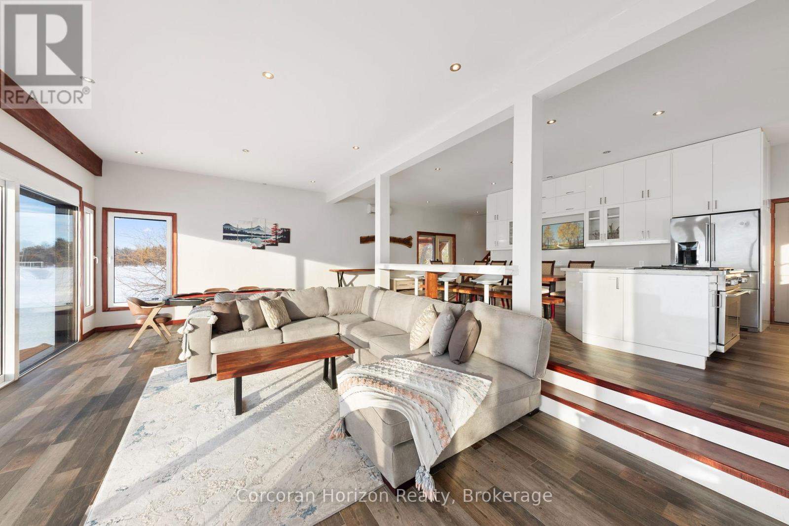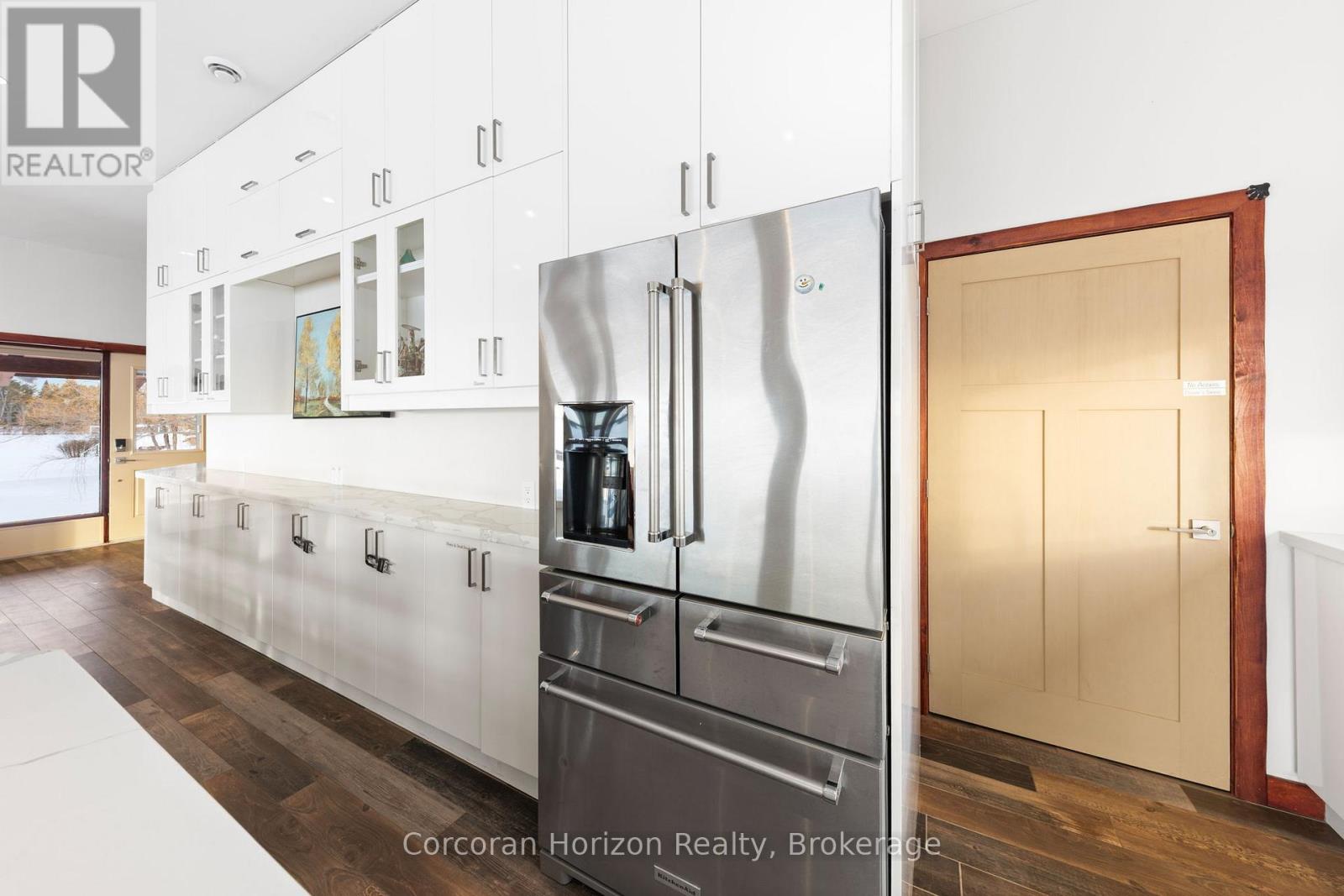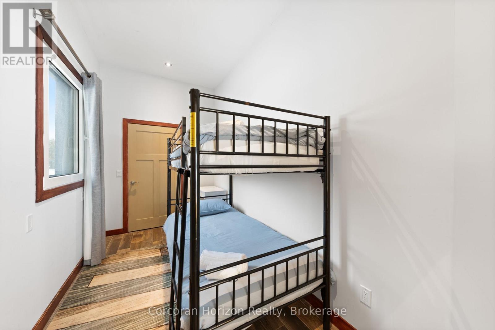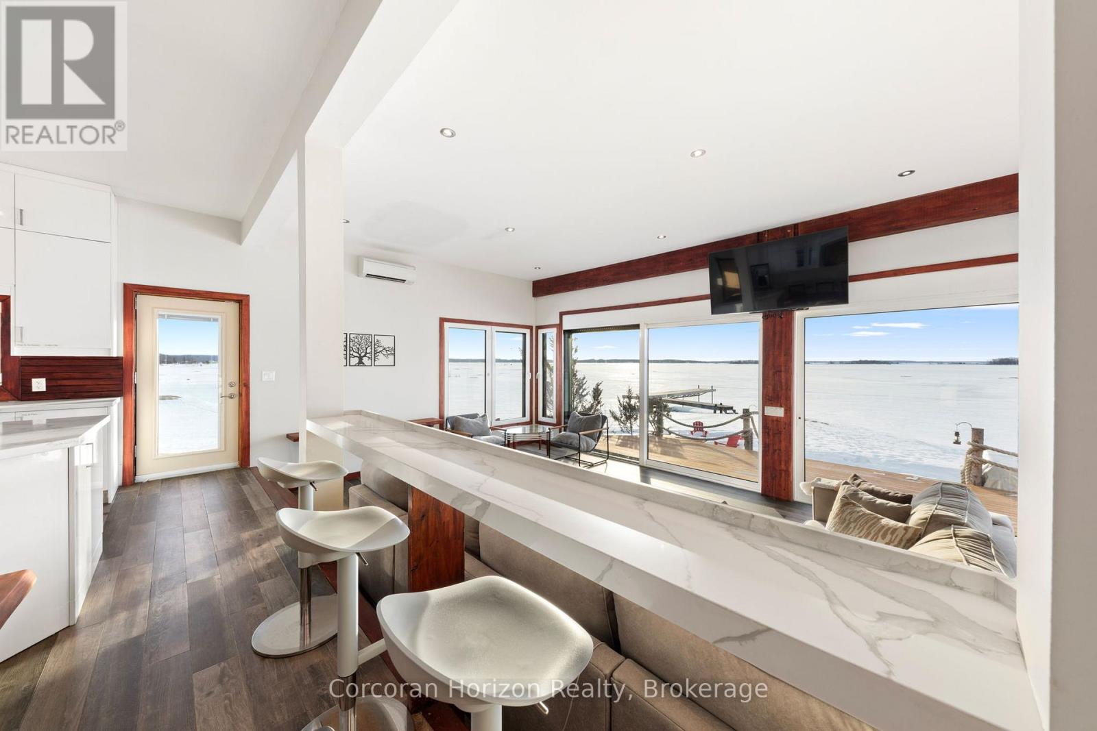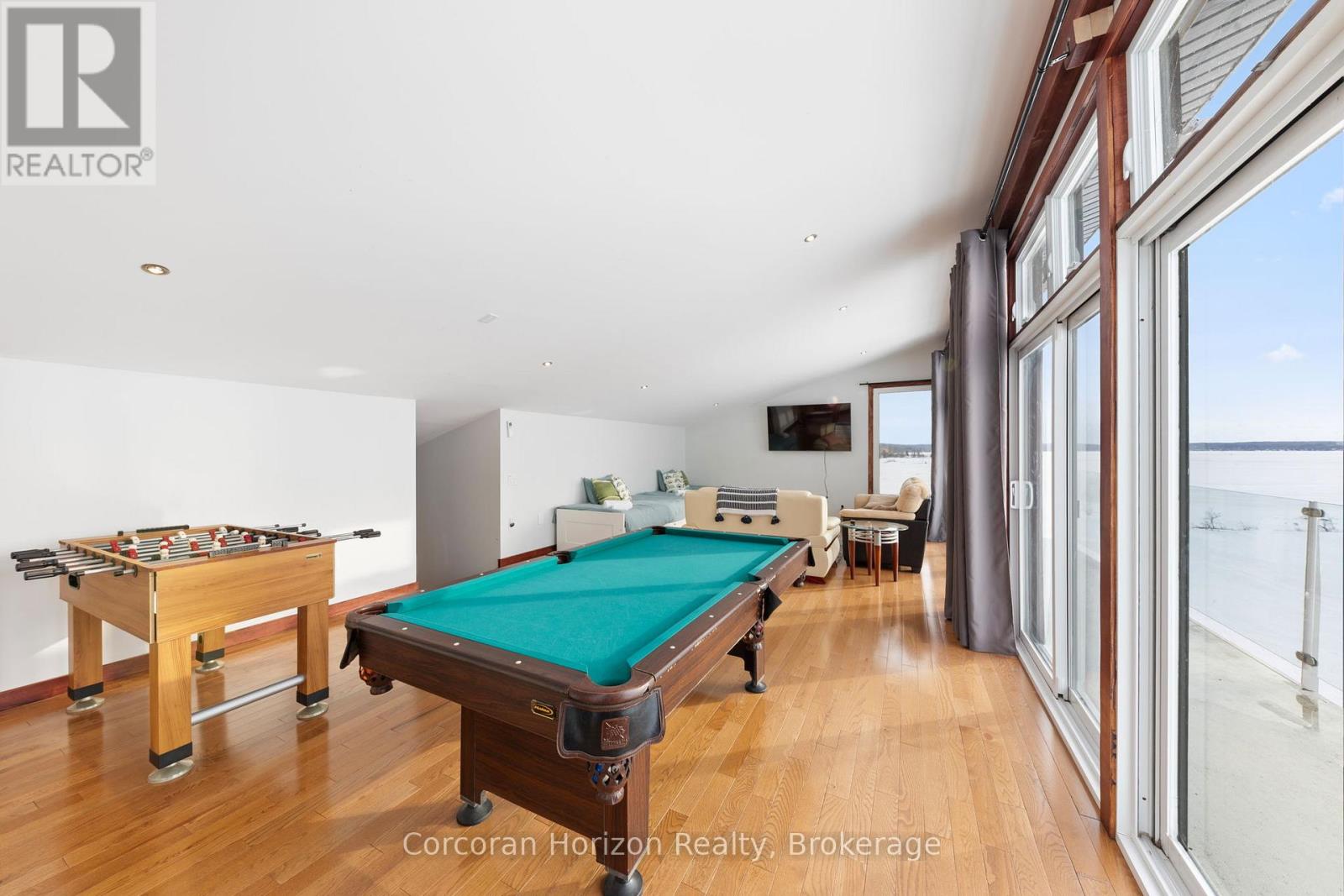 An extraordinary waterfront estate on Georgian Bay! This architecturally striking 2.5-storey residence offers approximately 3,000 sq ft of refined living space on a rare private peninsula with over 500 feet of pristine shoreline. Surrounded by water, the property delivers exceptional privacy, sweeping 270-degree panoramic views, and unforgettable sunsets.The main level is designed for elevated living and entertaining, featuring a seamless open-concept layout with expansive windows that frame the natural surroundings. The gourmet kitchen is beautifully appointed with premium stainless steel appliances, an oversized island with integrated cooktop and concealed ventilation and a walk-in pantry. The sunken living room creates a dramatic yet inviting setting, perfectly positioned to capture uninterrupted water views. A private office and elegant powder room complete the main floor. Upstairs, the second level offers a serene primary retreat and a walk-through closet with custom built-ins. Two additional spacious bedrooms feature unique loft areas, complemented by a stylish 4-piece bath and a dedicated laundry room.The third floor presents a versatile space with hardwood flooring and walkout to a private balcony which offers elevated views over the bay. It's perfectly suited as a lounge, studio, or additional living area. Outdoors, enjoy a natural sandy beach, private boat launch, and endless waterfront recreation. The peninsula setting creates a truly rare and immersive Georgian Bay lifestyle. A heated and insulated garage. Some trim work remains, offering the opportunity to personalize final finishes. Located just 90 minutes from the GTA, this is a rare offering combining luxury, privacy, and exceptional waterfront living. (id:64974)
