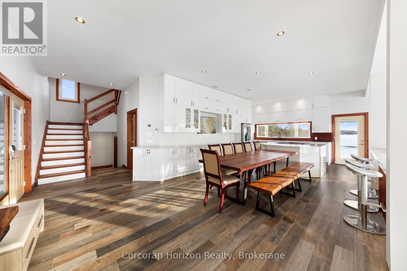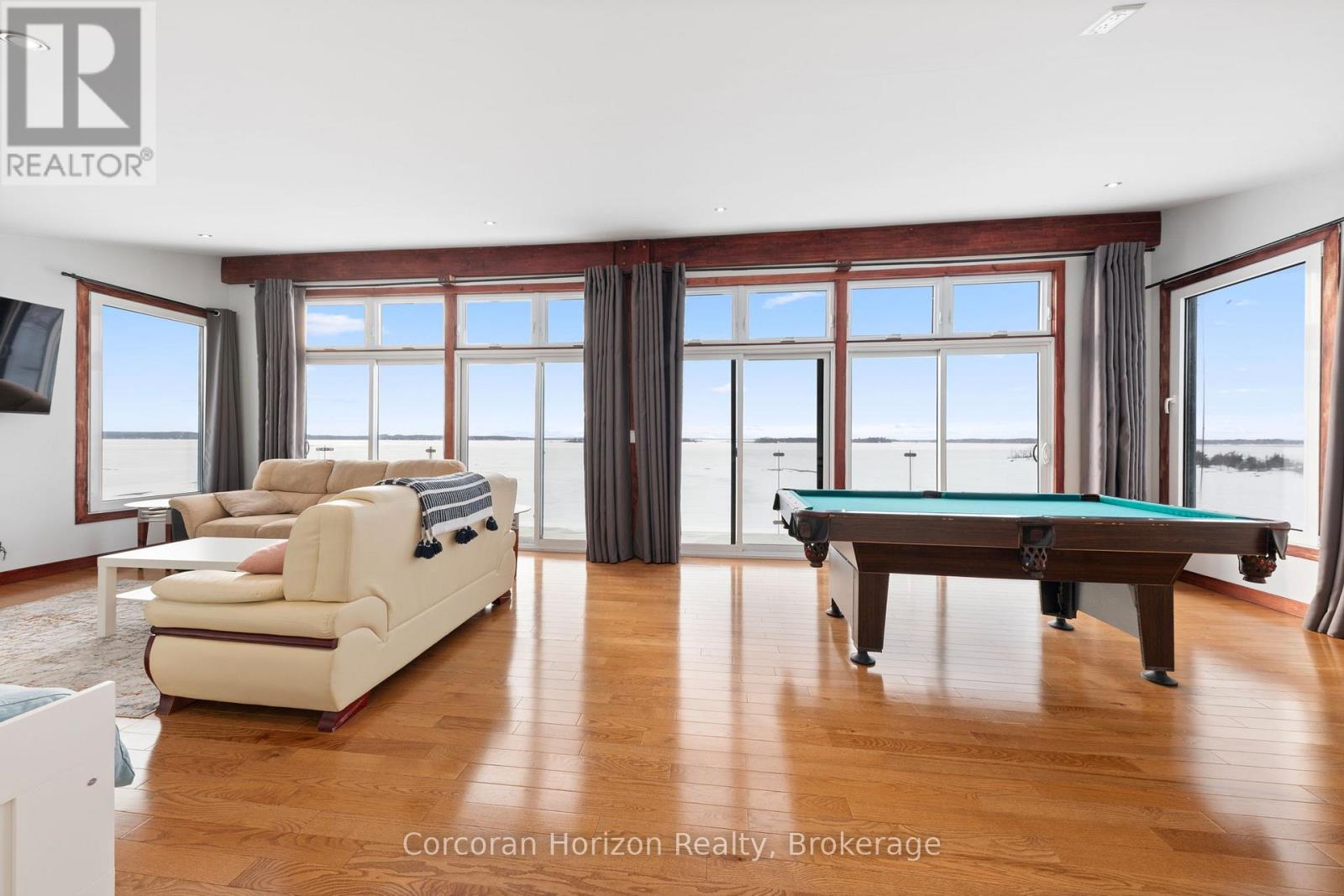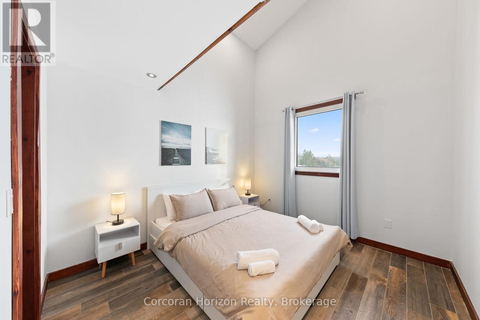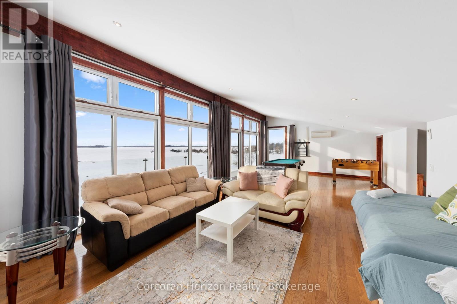 An extraordinary waterfront estate on Georgian Bay! This architecturally striking 2.5-storey residence offers approximately 3,000 sq ft of refined living space on a rare private peninsula with over 500 feet of pristine shoreline. Surrounded by water, the property delivers exceptional privacy, sweeping 270-degree panoramic views, and unforgettable sunsets.The main level is designed for elevated living and entertaining, featuring a seamless open-concept layout with expansive windows that frame the natural surroundings. The gourmet kitchen is beautifully appointed with premium stainless steel appliances, an oversized island with integrated cooktop and concealed ventilation and a walk-in pantry. The sunken living room creates a dramatic yet inviting setting, perfectly positioned to capture uninterrupted water views. A private office and elegant powder room complete the main floor. Upstairs, the second level offers a serene primary retreat and a walk-through closet with custom built-ins. Two additional spacious bedrooms feature unique loft areas, complemented by a stylish 4-piece bath and a dedicated laundry room.The third floor presents a versatile space with hardwood flooring and walkout to a private balcony which offers elevated views over the bay. It's perfectly suited as a lounge, studio, or additional living area. Outdoors, enjoy a natural sandy beach, private boat launch, and endless waterfront recreation. The peninsula setting creates a truly rare and immersive Georgian Bay lifestyle. A heated and insulated garage. Some trim work remains, offering the opportunity to personalize final finishes. Located just 90 minutes from the GTA, this is a rare offering combining luxury, privacy, and exceptional waterfront living. (id:64974)