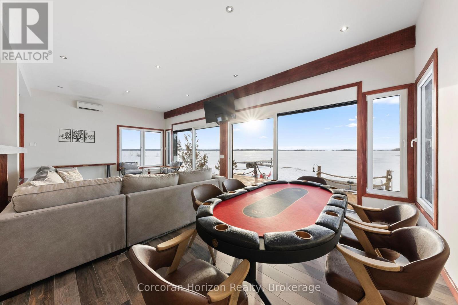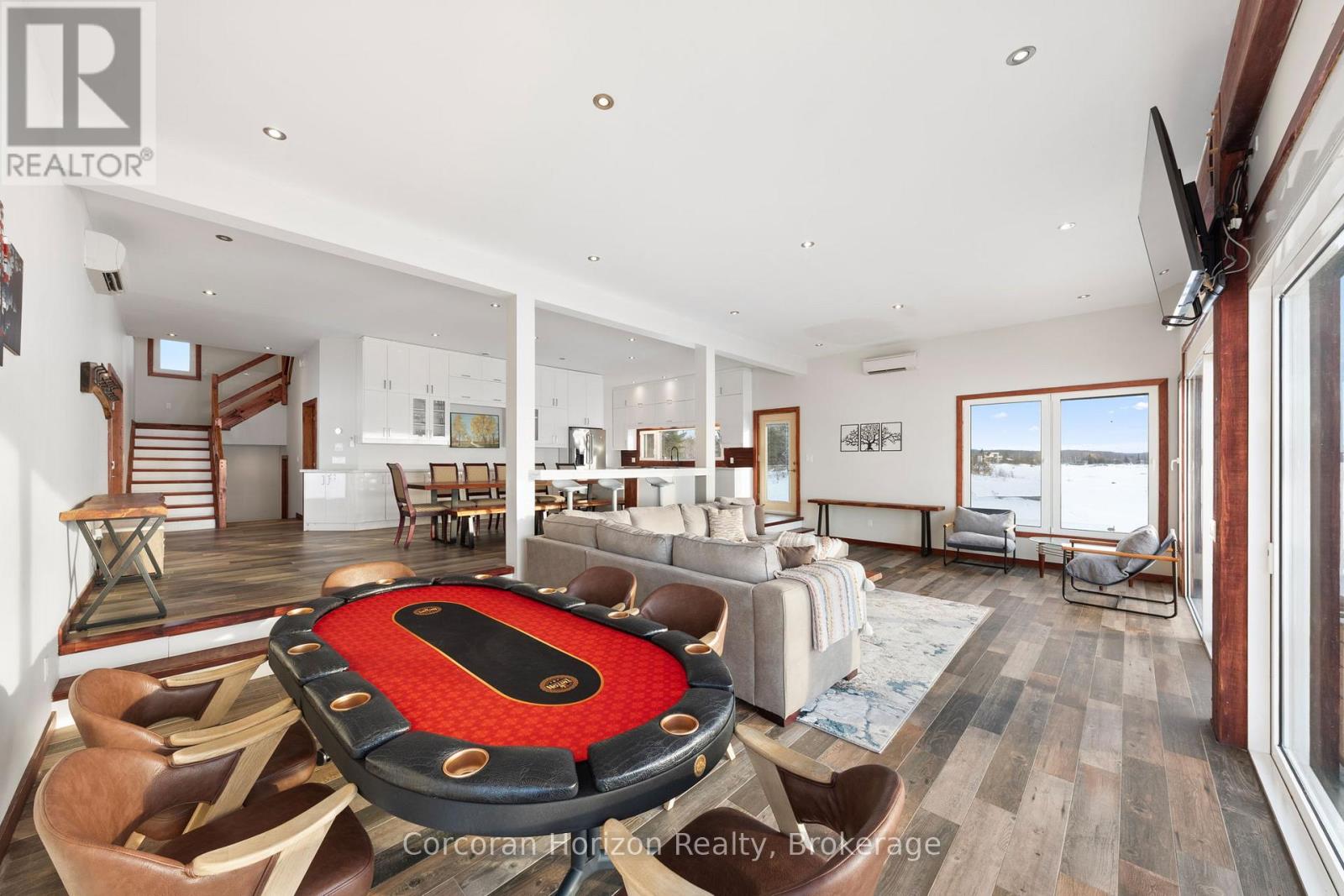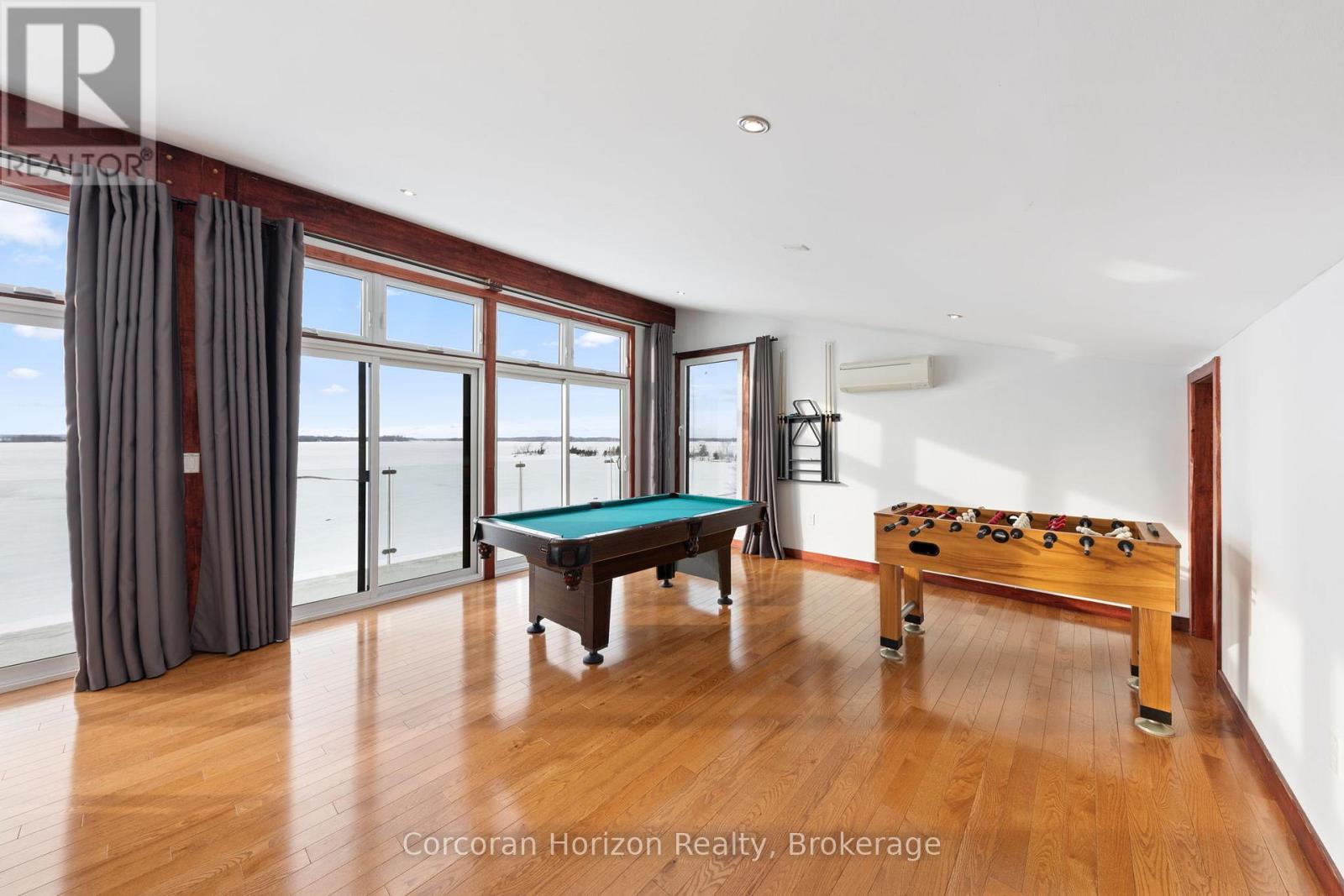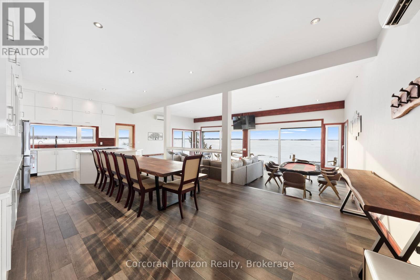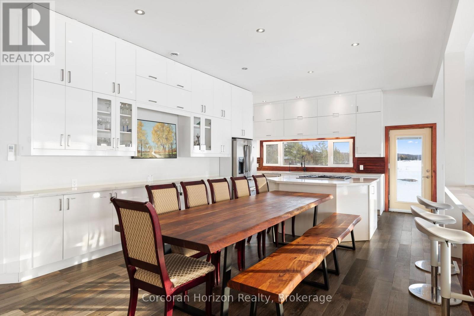 An extraordinary waterfront estate on Georgian Bay! This architecturally striking 2.5-storey residence offers approximately 3,000 sq ft of refined living space on a rare private peninsula with over 500 feet of pristine shoreline. Surrounded by water, the property delivers exceptional privacy, sweeping 270-degree panoramic views, and unforgettable sunsets.The main level is designed for elevated living and entertaining, featuring a seamless open-concept layout with expansive windows that frame the natural surroundings. The gourmet kitchen is beautifully appointed with premium stainless steel appliances, an oversized island with integrated cooktop and concealed ventilation and a walk-in pantry. The sunken living room creates a dramatic yet inviting setting, perfectly positioned to capture uninterrupted water views. A private office and elegant powder room complete the main floor. Upstairs, the second level offers a serene primary retreat and a walk-through closet with custom built-ins. Two additional spacious bedrooms feature unique loft areas, complemented by a stylish 4-piece bath and a dedicated laundry room.The third floor presents a versatile space with hardwood flooring and walkout to a private balcony which offers elevated views over the bay. It's perfectly suited as a lounge, studio, or additional living area. Outdoors, enjoy a natural sandy beach, private boat launch, and endless waterfront recreation. The peninsula setting creates a truly rare and immersive Georgian Bay lifestyle. A heated and insulated garage. Some trim work remains, offering the opportunity to personalize final finishes. Located just 90 minutes from the GTA, this is a rare offering combining luxury, privacy, and exceptional waterfront living. (id:64974)