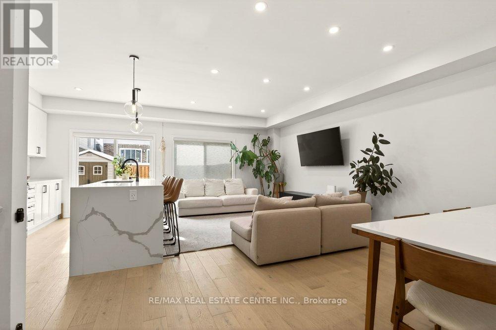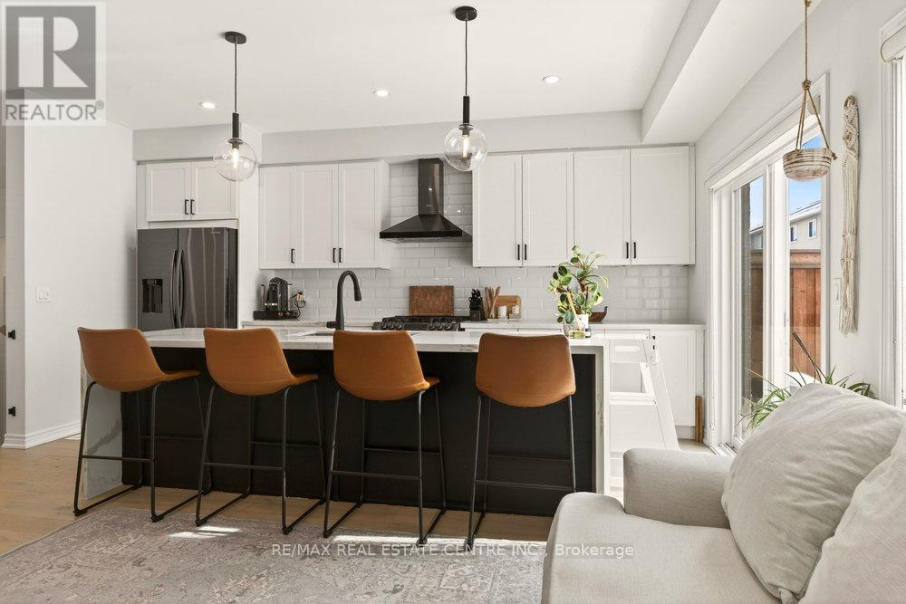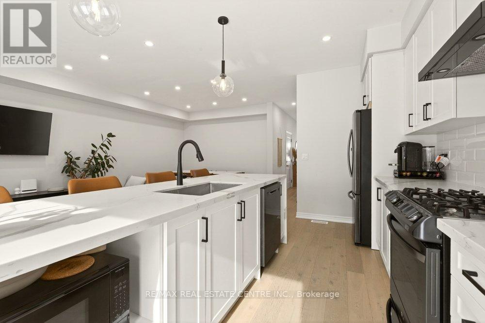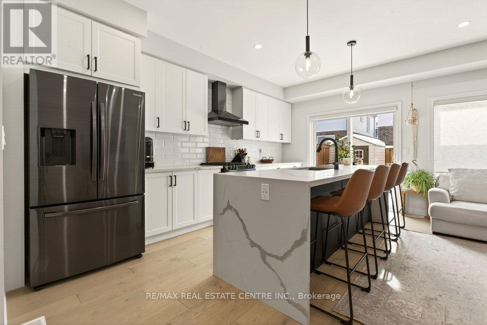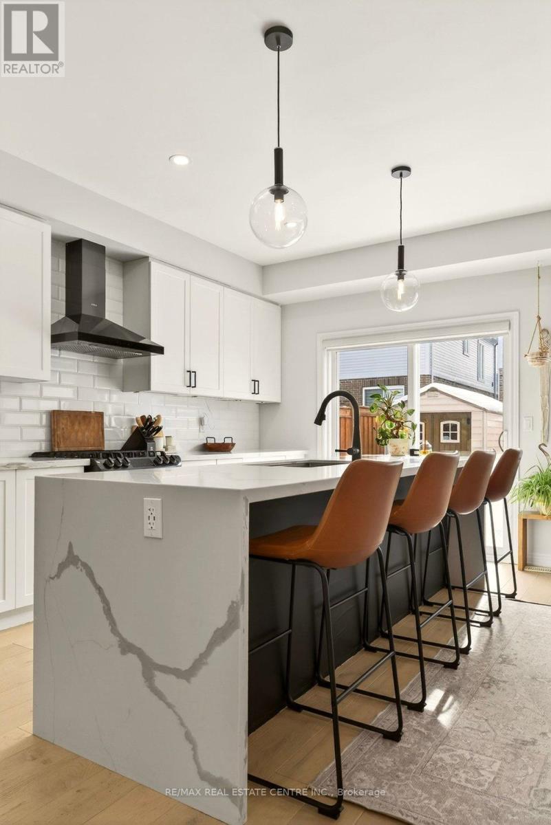 Built in 2020 by Dicenzo Homes and offering over $50,000 in thoughtful upgrades and updates this stunning 4-bedroom, 4-bathroom semi-detached home is located in a welcoming, family-friendly community on Hamilton Mountain. With a finished basement, fenced yard, and modern finishes throughout, this home is ideal for families and professionals alike. Enjoy convenient inside entry from the single garage and private driveway. Step into the inviting foyer and immediately appreciate the upgraded flooring and staircase, along with a conveniently located 2-piece powder room. Natural light fills the open-concept main floor, highlighting the beautifully upgraded kitchen - truly the heart of the home. Features include extended cabinetry, black stainless steel appliances with a gas stove, an oversized quartz waterfall island, upgraded undermount sink and faucet, and plenty of prep and gathering space. Upgraded hardwood floors flow seamlessly through the kitchen, living, and dining areas, complemented by pot lights and double sliding glass doors leading to your private, fully fenced backyard. The concrete patio and gazebo create the perfect setting for outdoor relaxation or entertaining. Upstairs, upgraded hardwood continues through the hallway, leading to four generously sized bedrooms with large closets and cozy carpeting. The spacious primary retreat features a walk-in closet and a stylish ensuite bath complete with a glass shower. The finished lower level expands your living space with a large recreation room, laundry area, ample storage, and a 3-piece bathroom with glass shower - ideal for guests, teens, or a home office setup. 200-amp electrical panel. Centrally located just minutes from l the LINC, with access to the 403 and Red Hill Parkway this home is close to public transit, schools, parks, and shopping. Don't miss this opportunity! Some photos virtually staged. (id:64974)