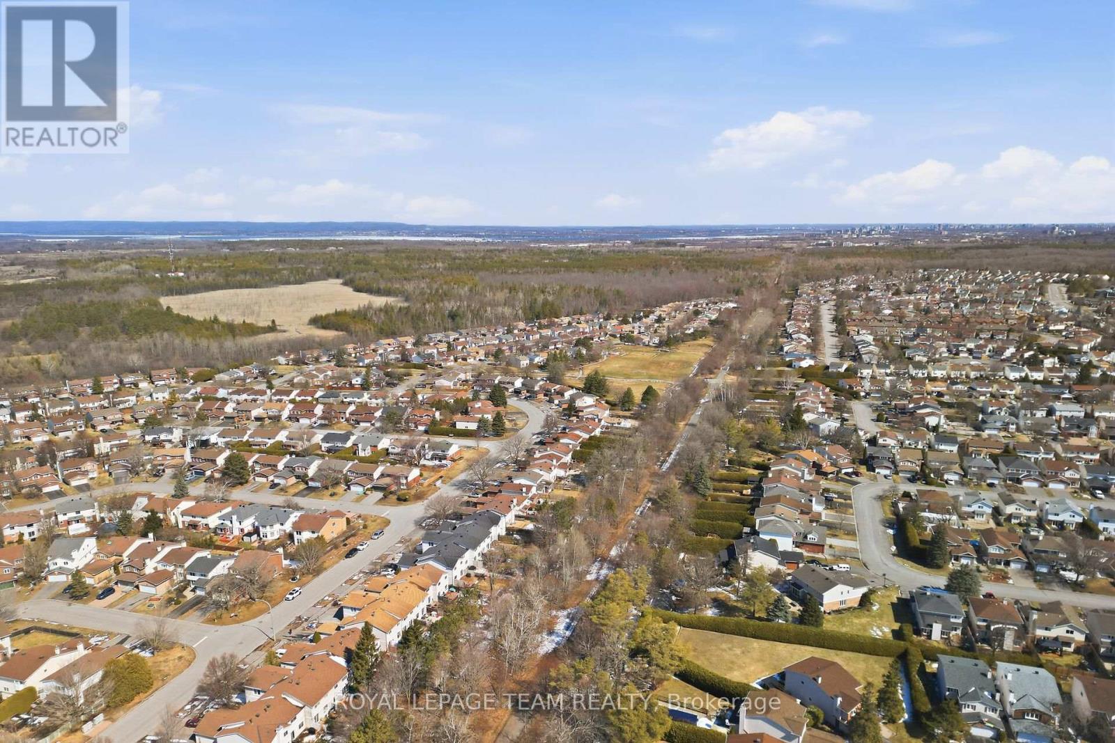 Welcome to this lovely 3 bedroom, 2 bath townhome, perfect for first-time buyers & those looking to rightsize. Located in the family friendly neighborhood of Bridlewood in Kanata South. Enjoy the deep fenced south facing backyard with no rear neighbors. Access to the Trans Canada Trail & Laura Dubois Park is a short walk down the street. Interlock walkway leads you to the covered front porch, great for a morning coffee & greeting guests. Incredibly roomy foyer, has tiled floors & a double closet, convenient for families. Renovated powder room is steps away & has a modern vanity, mirror & light fixture. Spacious open plan living & dining room with hardwood flooring & crown moulding, perfect for entertaining. Tall updated windows bring natural light into the rooms. The kitchen has tile flooring, many oak cabinets with updated hardware, tile backsplash, track lighting & a ceiling fan light fixture. Newer patio door provides access to the wonderful fenced yard with shrubs & trees. Patio is great for relaxing & barbecues. There is plenty of room for gardening & play. Neutral carpeted stairs, with oak railing & metal spindles, leads you to the 2nd level. Primary bedroom is spacious & has 2 double closets & a big window with views of the backyard. Cheater door to the remodeled full bathroom is convenient. Tile flooring, updated vanity with stone counter, mirror & light fixture are attractive. Combined tub/shower has tile surround. 2 more bedrooms each with double windows & double closets. The finished lower level has lots of room for a home theatre, play & office area. Plush carpeting & electric fireplace adds ambience & warmth to the room. Recessed lighting & 2 double closets for storage are great features. Separate laundry & utility room. Updates to the home include: windows, roof, main bath, powder room, carpet, furnace & more. 24 hours irrevocable on offers. (id:64974)