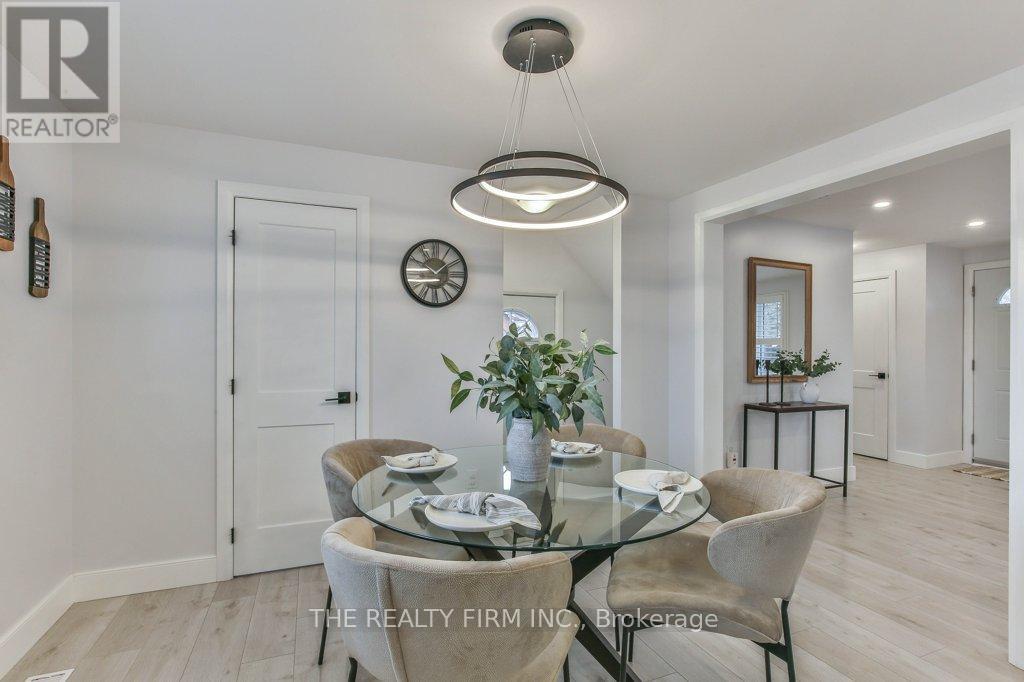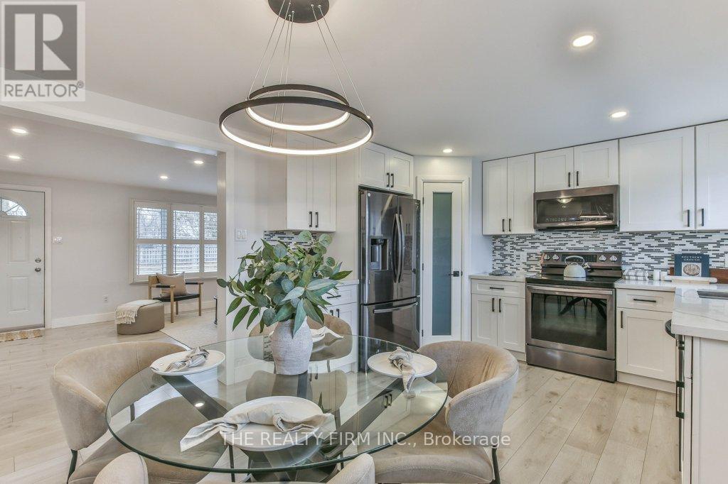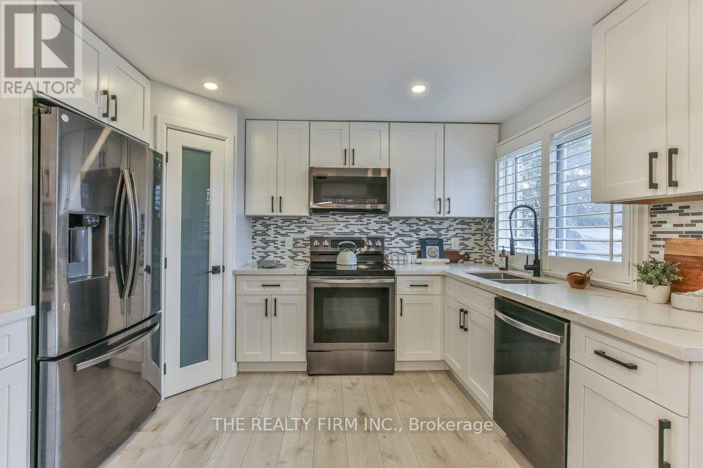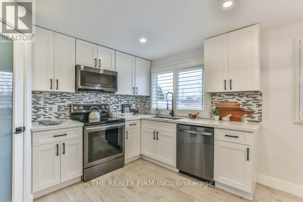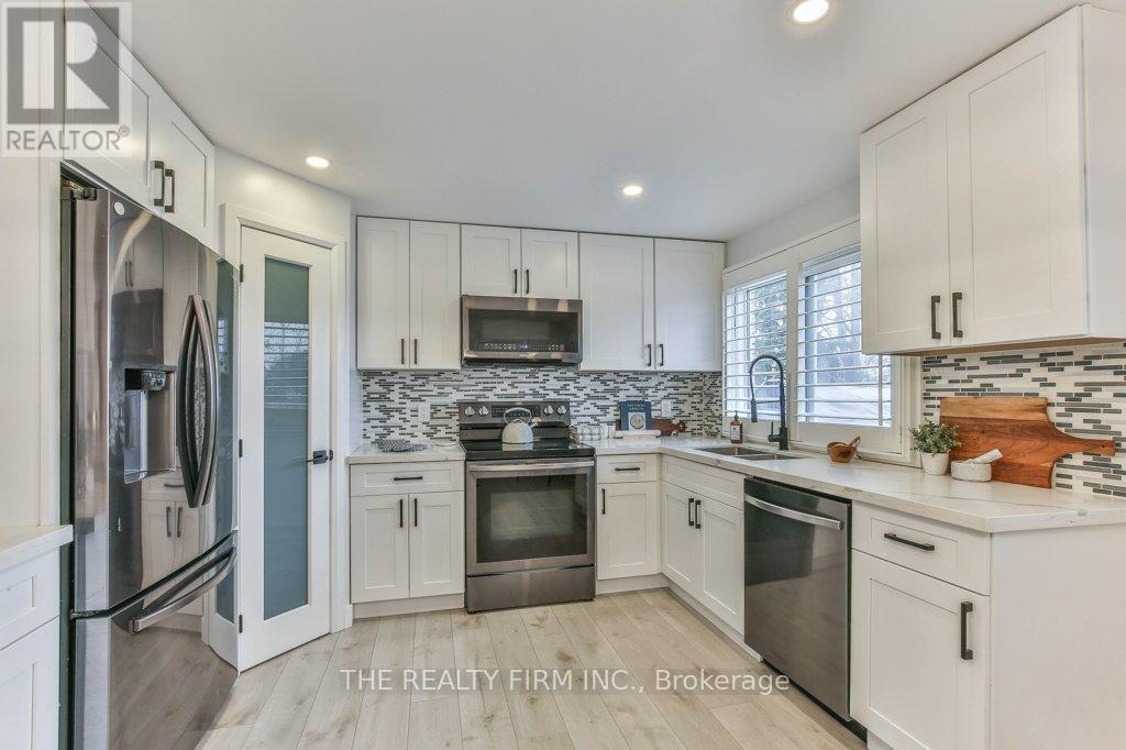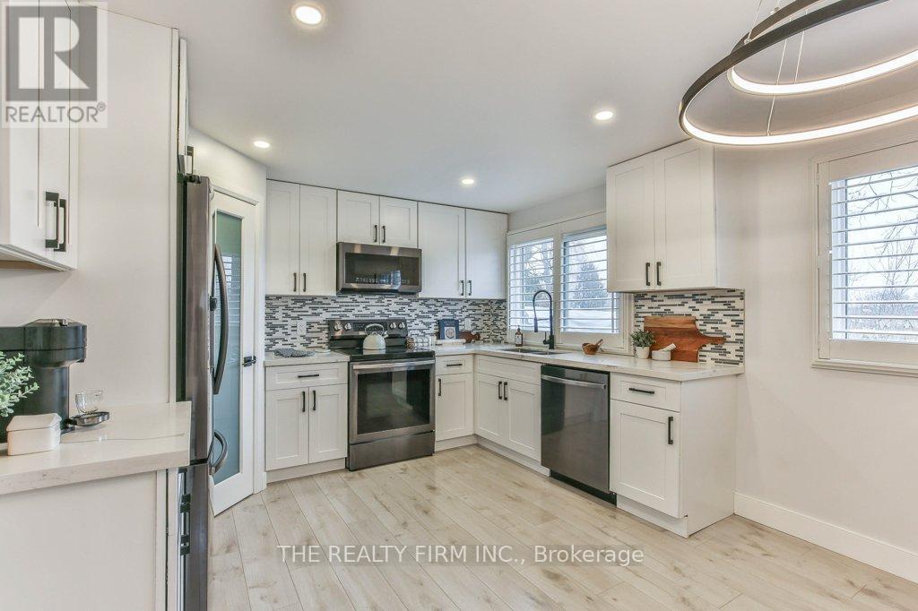 Stunning from top to bottom, this move-in-ready home is an excellent opportunity for first-time buyers or investors alike. Offering 3 bedrooms, 1.5 bathrooms, a finished basement, and a deep lot backing onto the green space of St. Jude. Thoughtfully redesigned with modern living in mind, the main floor features a bright open-concept layout with a stylish kitchen overlooking the living area, complete with quartz countertops, black stainless steel appliances and a corner pantry along with a convenient two-piece bathroom.Upstairs, you'll find three well-sized bedrooms and a beautifully updated four-piece bathroom. Large windows throughout the home allow for an abundance of natural light, enhanced by newer lighting, including pot lights, and quality finishes throughout. Additional updates over the years include vinyl plank flooring, California shutters, panel with ESA (approx 2021), AC (approx 2021) and gutter guards (approx 2023). The finished lower level offers a versatile family room - perfect for entertaining, a kids' play area, or a home office setup.Additionally, windows, drywall and insulation are noted to be updated from previous owners. Enjoy convenient side access to a spacious backyard backing onto a large school playground, offering privacy and plenty of room for outdoor living, whether it's a future patio, play set, or even possibly a pool.Ideally located just minutes from Westmount Mall, Highway 401, shopping, dining, and everyday amenities, this home delivers both style and convenience. Don't miss your chance to own a turnkey property in a great location - book your showing today! (id:64974)