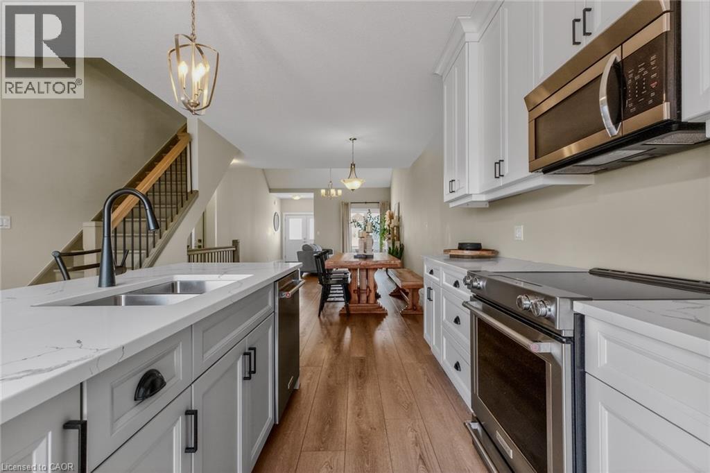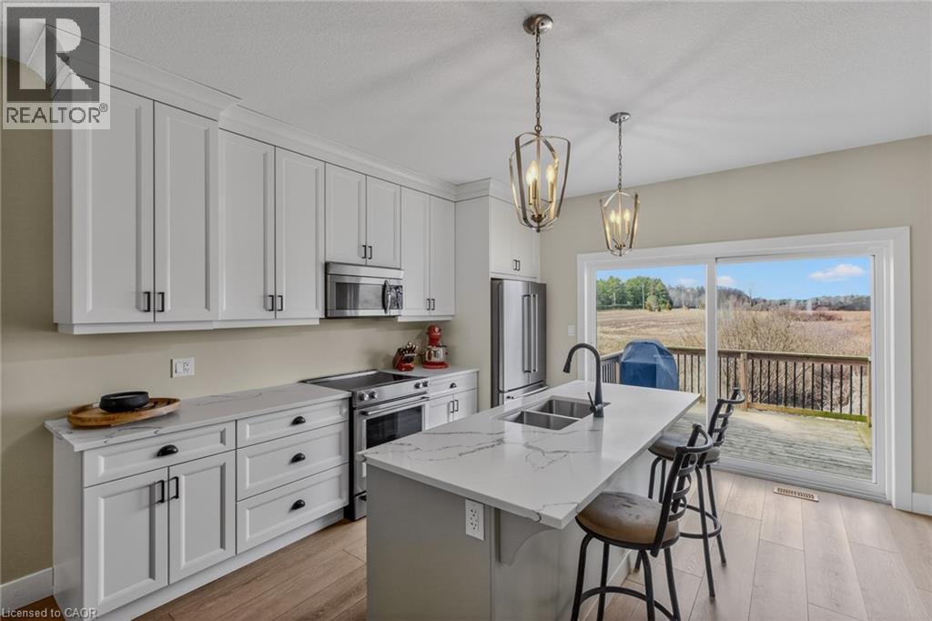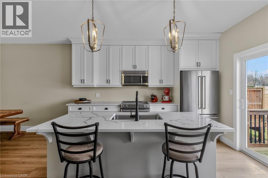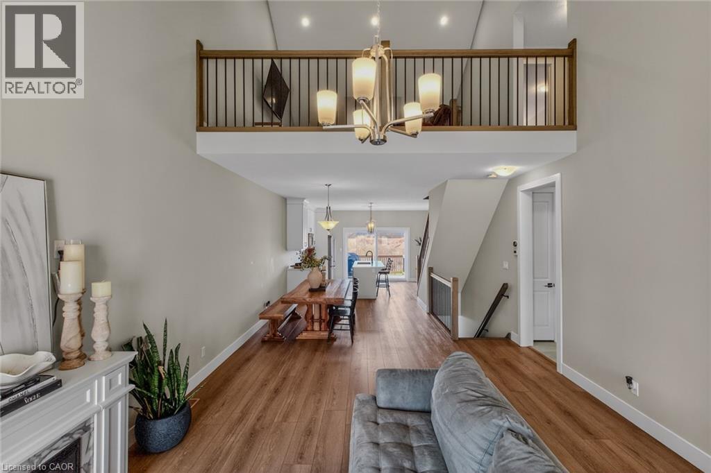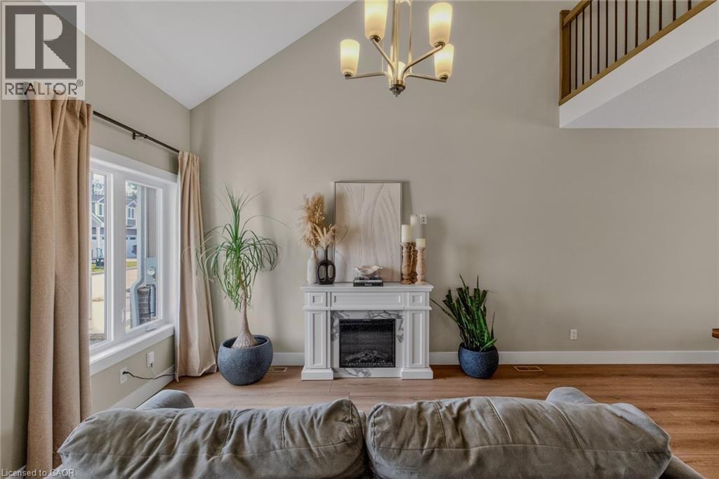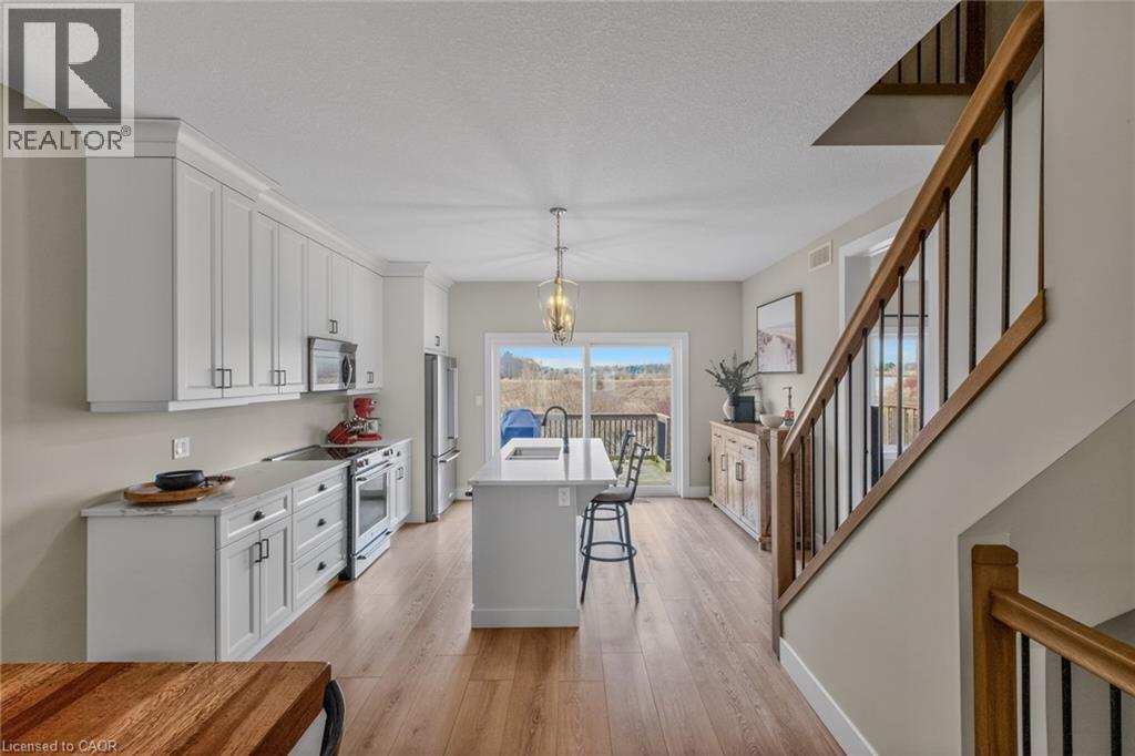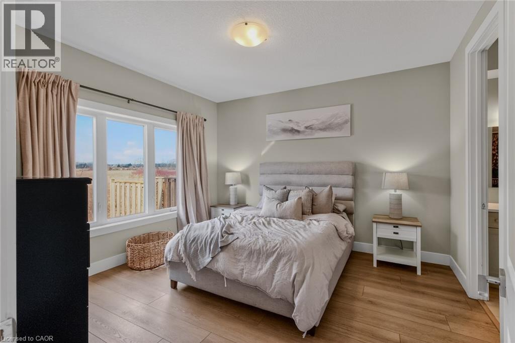 Stylish, upgraded condo townhome in the vibrant lakeside community of Port Dover! Built in 2020 and featuring over $25,000 in custom upgrades, this beautiful home combines modern design with peaceful nature views and an abundance of natural light. Step inside and you’ll immediately feel the difference. The bright, open-concept main floor features high ceilings and a seamless flow from the living and dining area into the kitchen—perfect for entertaining or everyday living. The gourmet kitchen offers a large island with bar seating, quartz counter tops, soft closed cabinetry, stainless steel appliances and sliding doors leading you to the 9X10 back deck. The main-floor primary bedroom is a standout feature, complete with a generous walk-in closet and a private 4-piece ensuite featuring a beautiful 5’ walk-in shower. Main floor laundry, a two piece bathroom and inside access to the single car garage completes the main floor. Upstairs, the versatile loft space is perfect for a home office, lounge, or reading nook, along with two additional spacious bedrooms and another 4-piece bathroom. The unfinished basement offers endless potential, giving you the opportunity to create additional living space, a rec room, or whatever suits your lifestyle. Upgrades include: Quartz counter tops, recessed panel cabinetry, luxury vinyl flooring throughout, 12x24 ceramic tile in bathrooms, 8’ interior doors, and solid oak staircases. (id:64974)